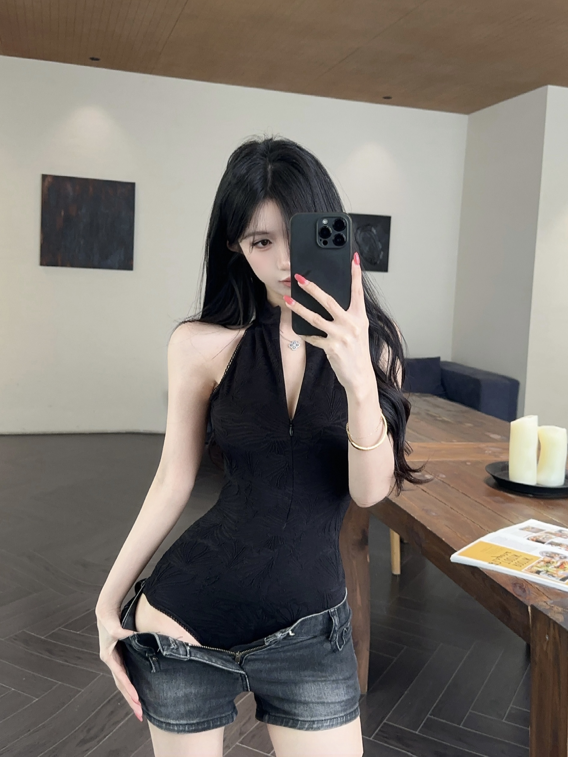 실사 정가 차가운 바람의 소리 핫걸 지퍼 조끼 민소매 질감 센스 맨위 올인원 의류 여성 여름