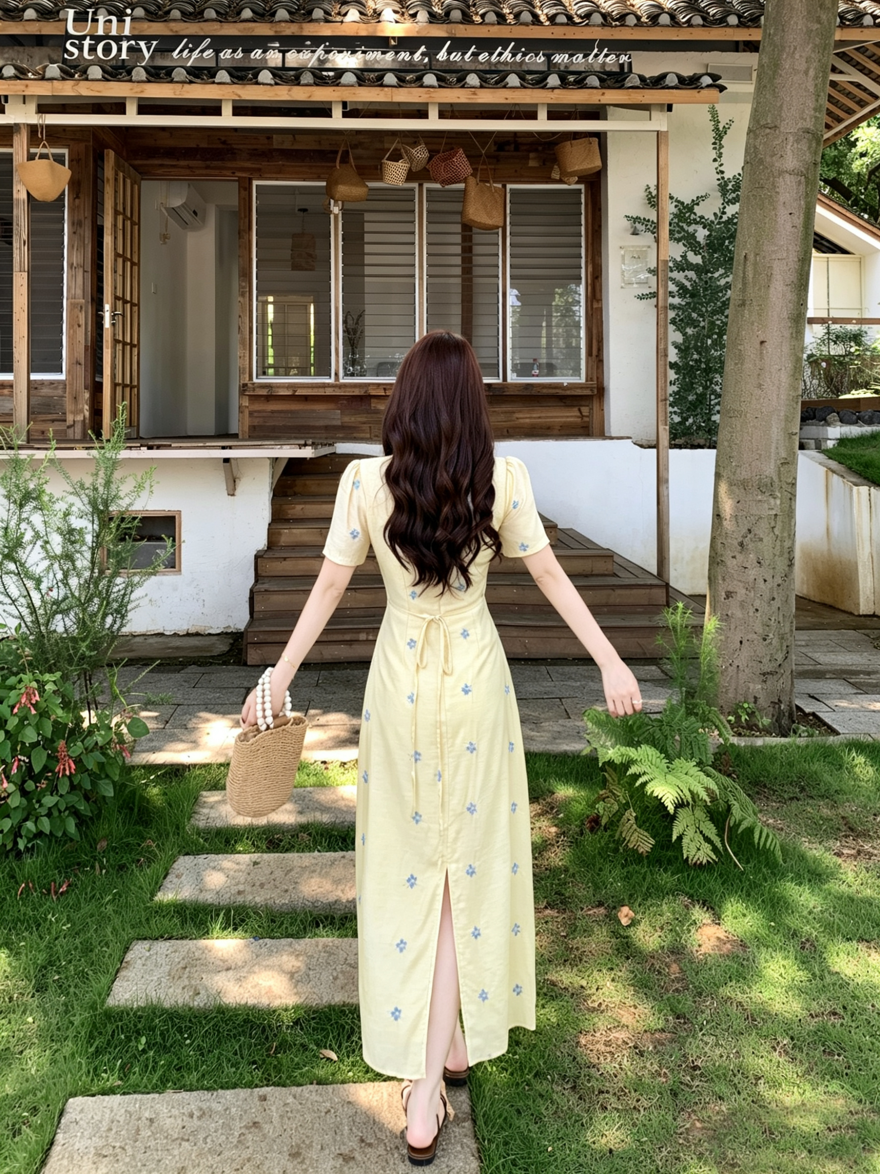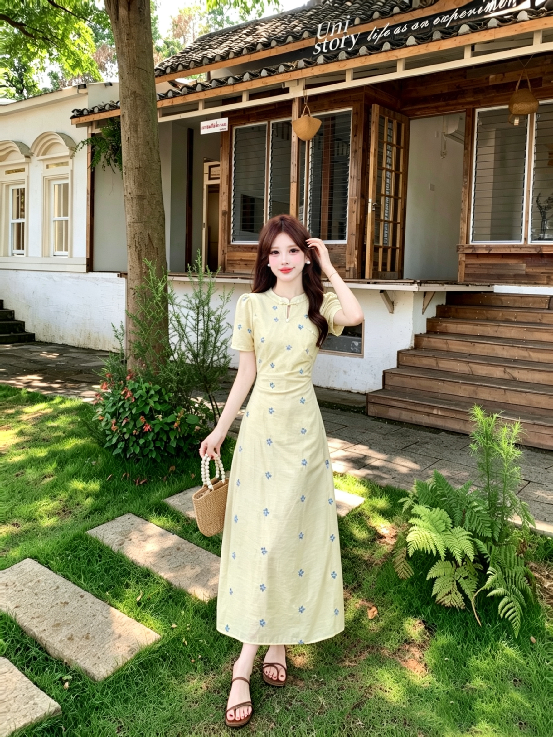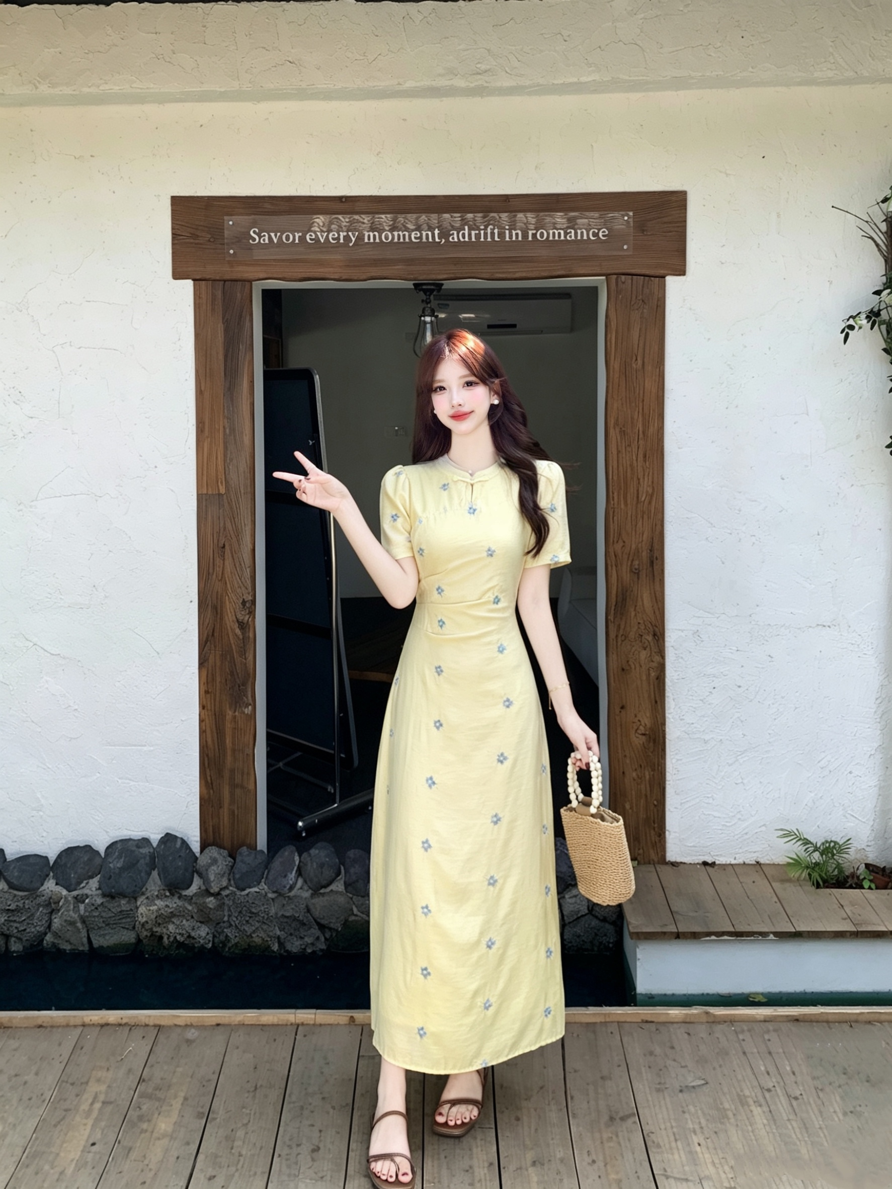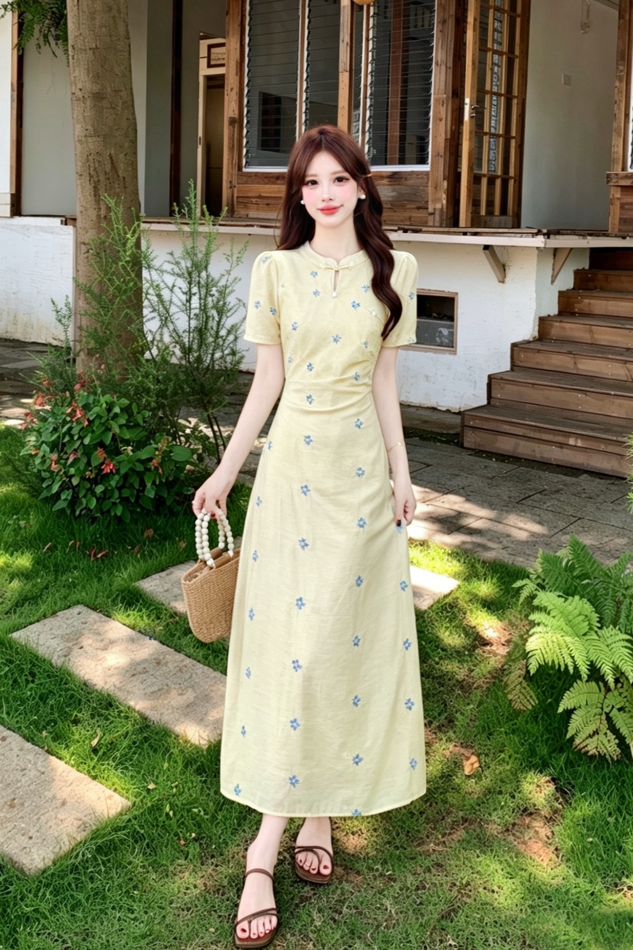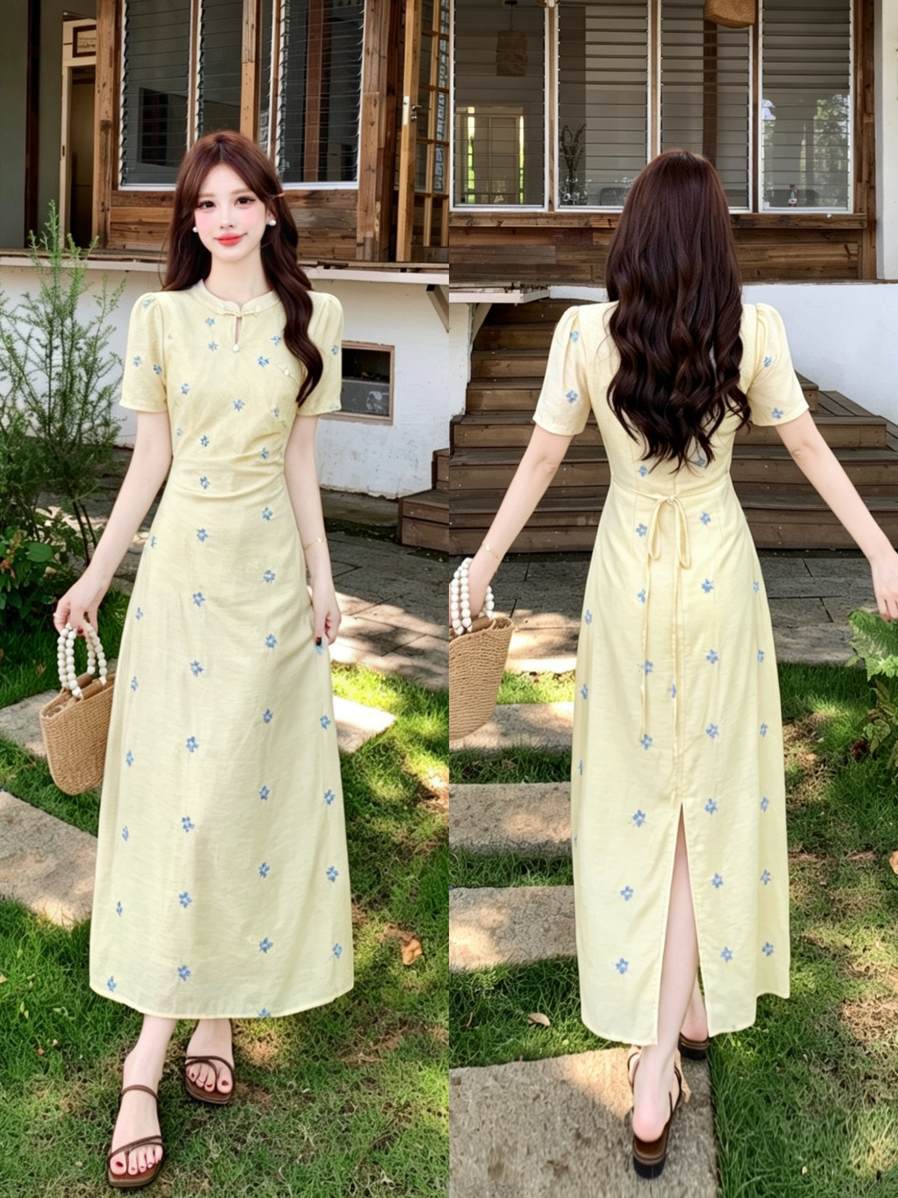 빅 사이즈 달콤한 안개 꽃 리플 레트로 V넥 자수 꽃무늬 여성 드레스 품격 고급 몸매 가꾸기 슬림해 보이는 프랑스식 롱 스커트