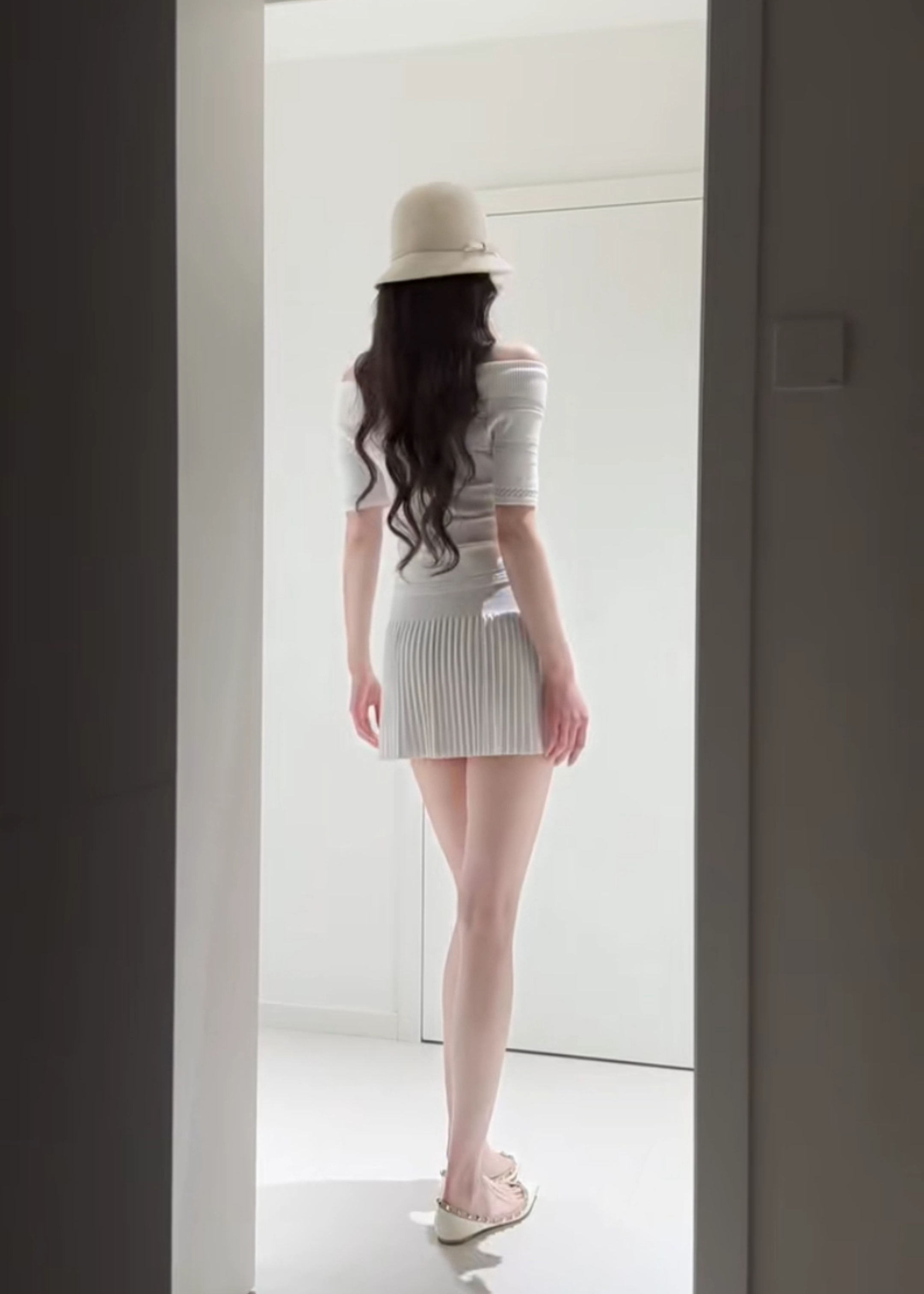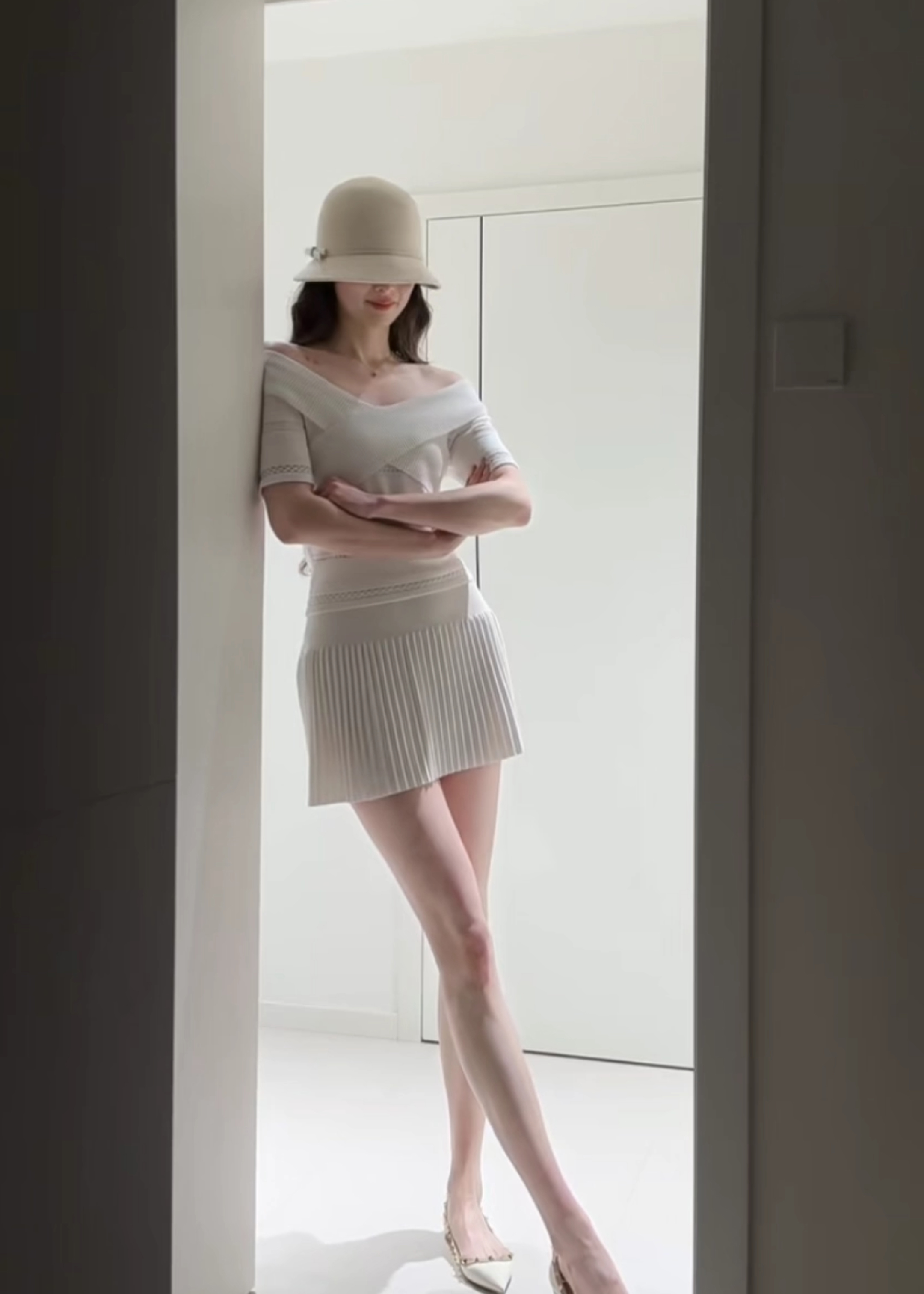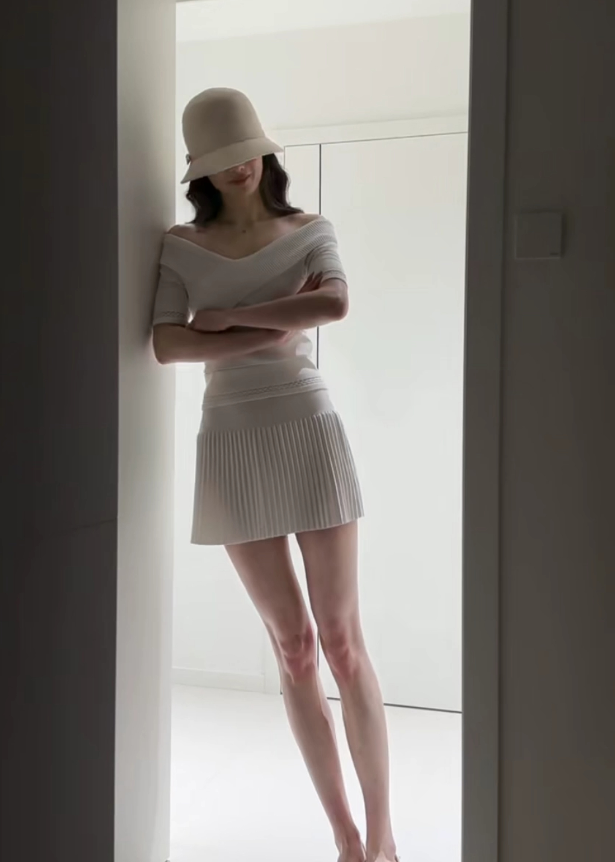 오프숄더 니트 세트 여성 봄 여름 허리 수축 슬림해 보이는 쇼트 스타일 맨위 플리츠 반신 스커트 투피스 세트