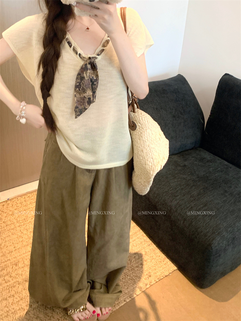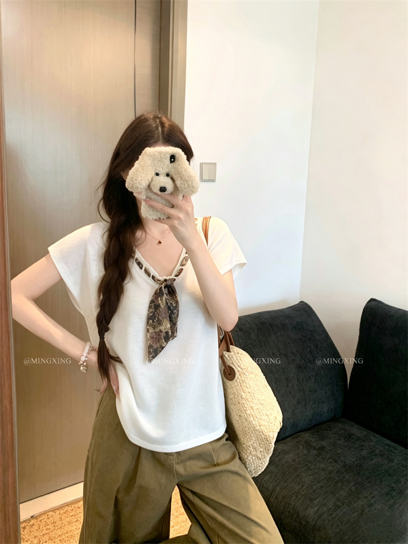 실사 정가 스카프 칼라 맨위 니트 티셔츠 여성 디자인 센스 빛 럭셔리 바람 다용도 맨위