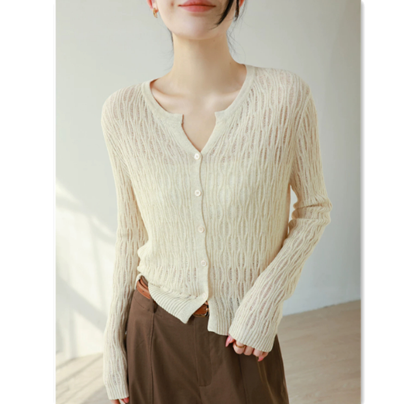 디자인 센스 홀로우 아웃 니트 오픈 가디건 여성 봄 가위 라운드 넥 주간 실크 아마 긴팔 맨위 재킷 블라우스 황색