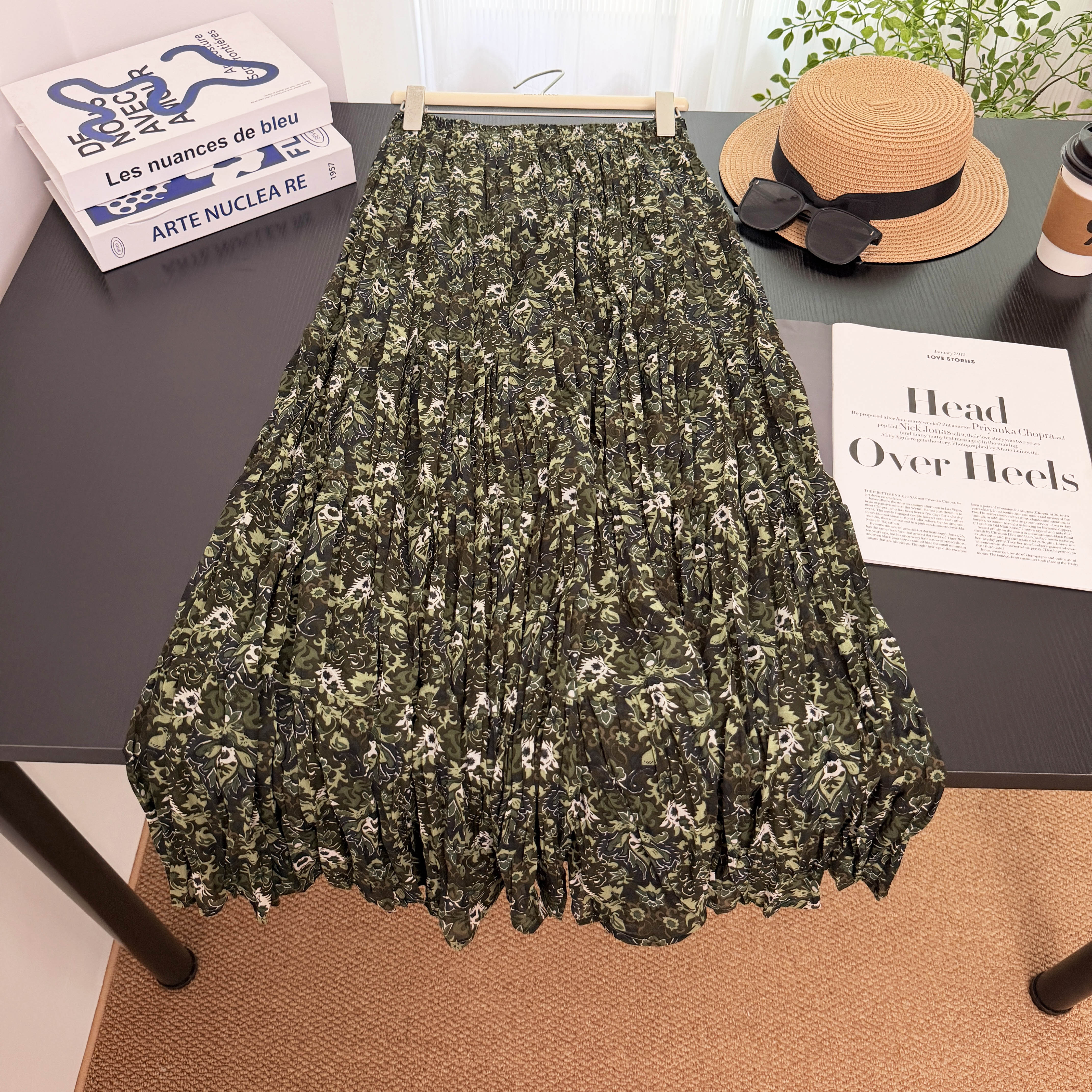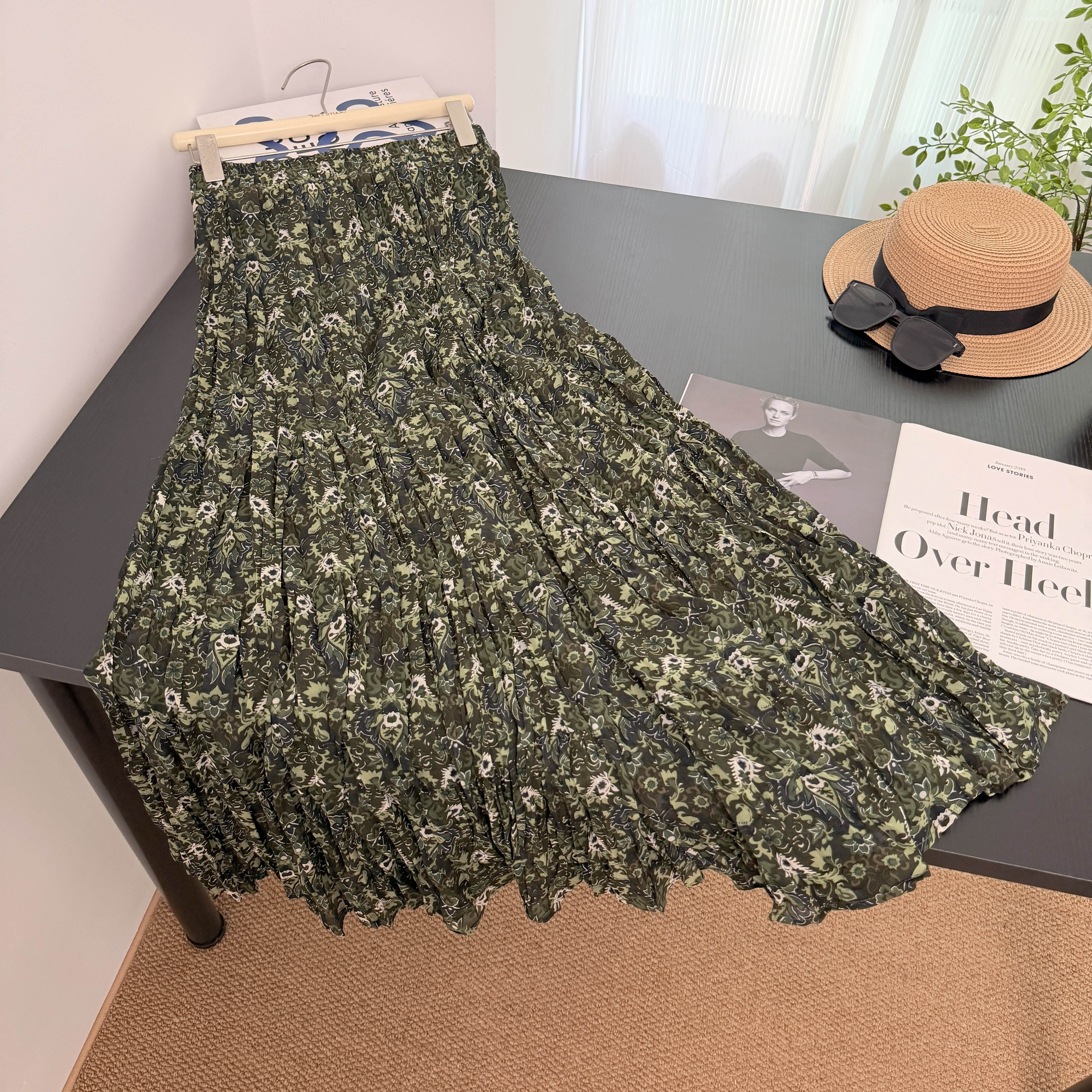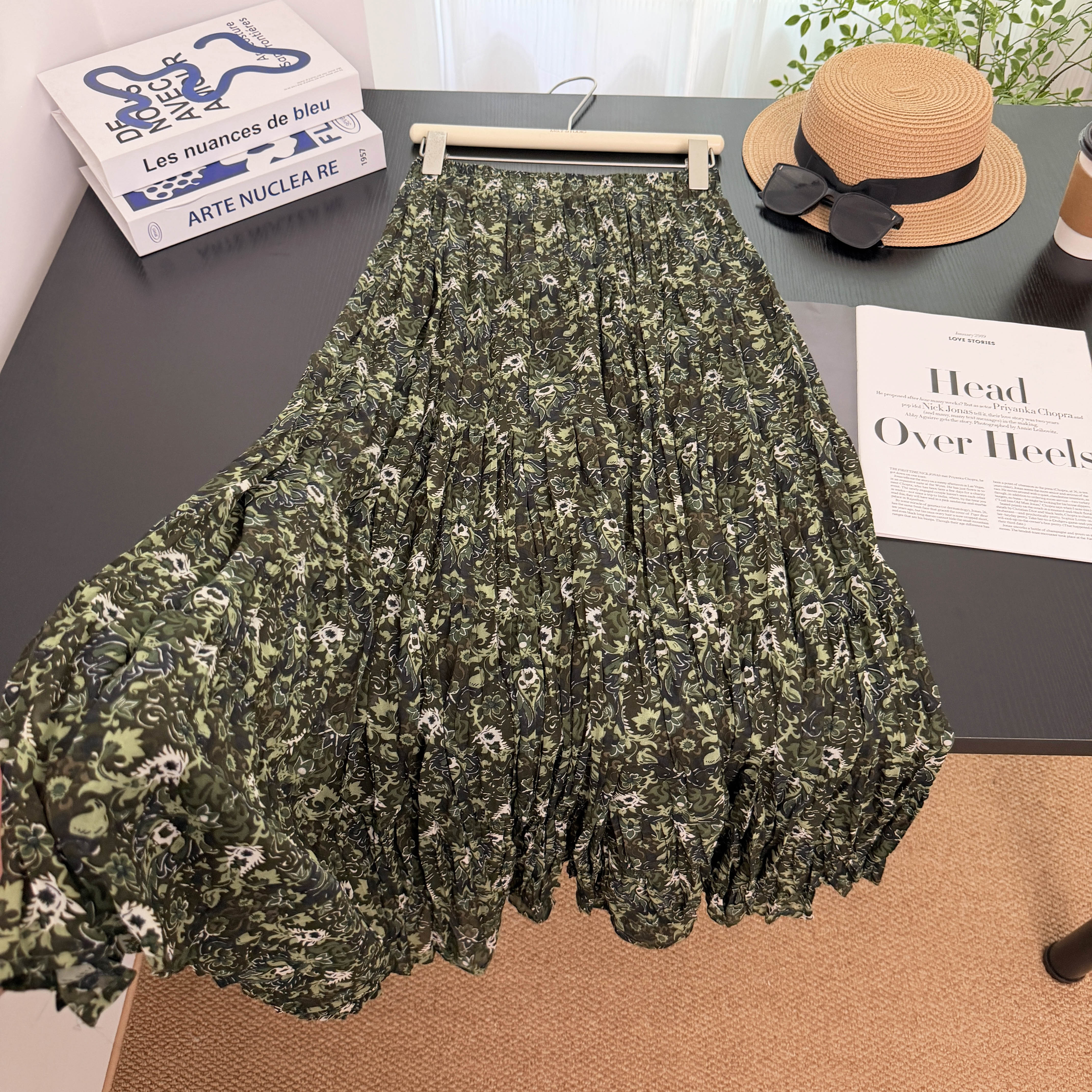 실사 전원 바람 녹색 프린트 반신 스커트 여성 2026 봄 드레스 새로운 우아한 플리츠 중간 길이 스커트 꽃무늬 치마