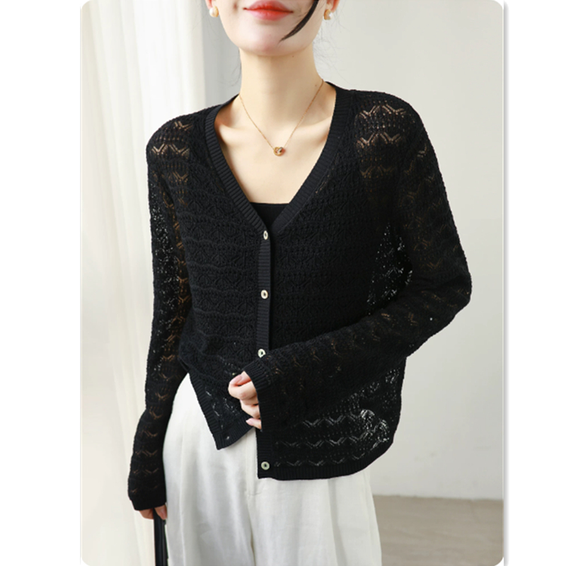 지방 mm 레트로 chic 외국 가스 라운드 넥 반팔 니트 오픈 가디건 여성 여름 새로운 슈퍼 잘 생긴 홀로우 아웃 슬림해 보이는 맨위