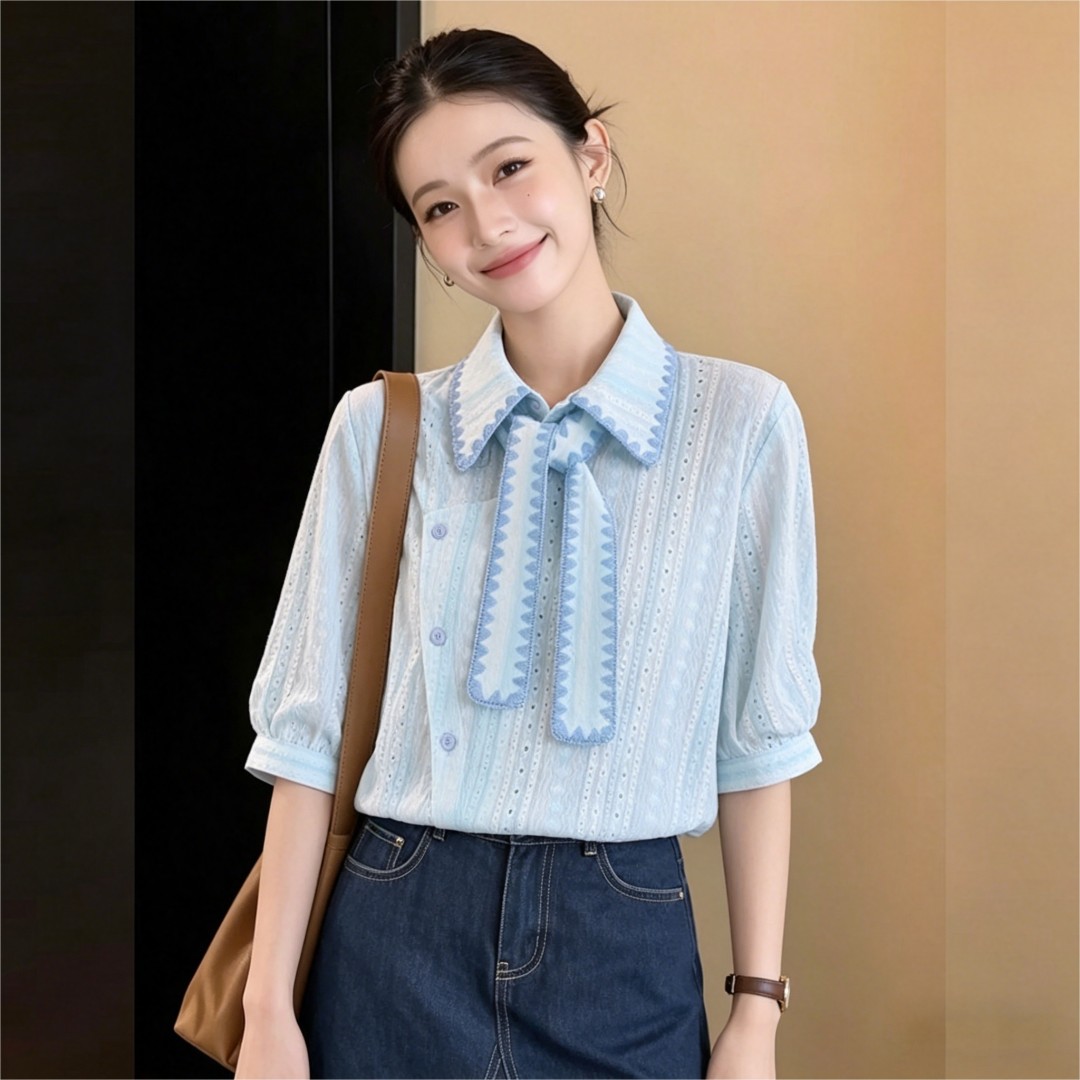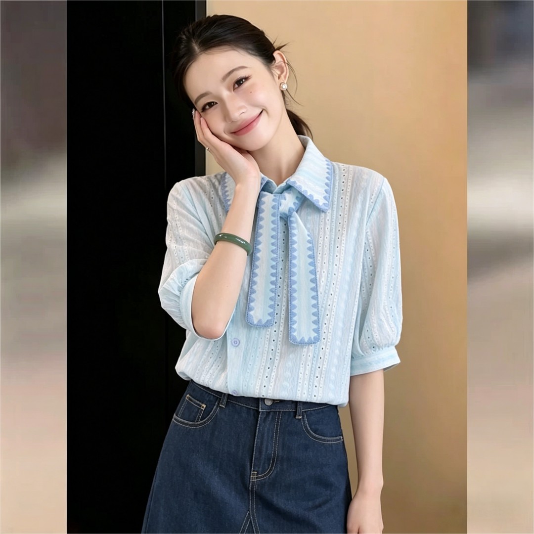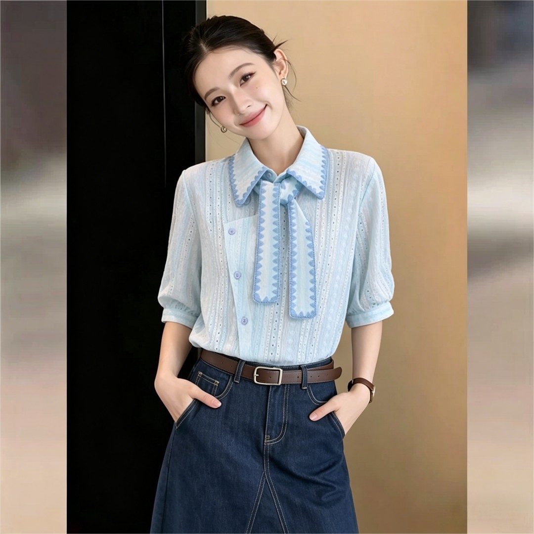 실사 프랑스식 질감 센스 리본 반팔 셔츠 여성 2026 여름 디자인 맨위 셔츠