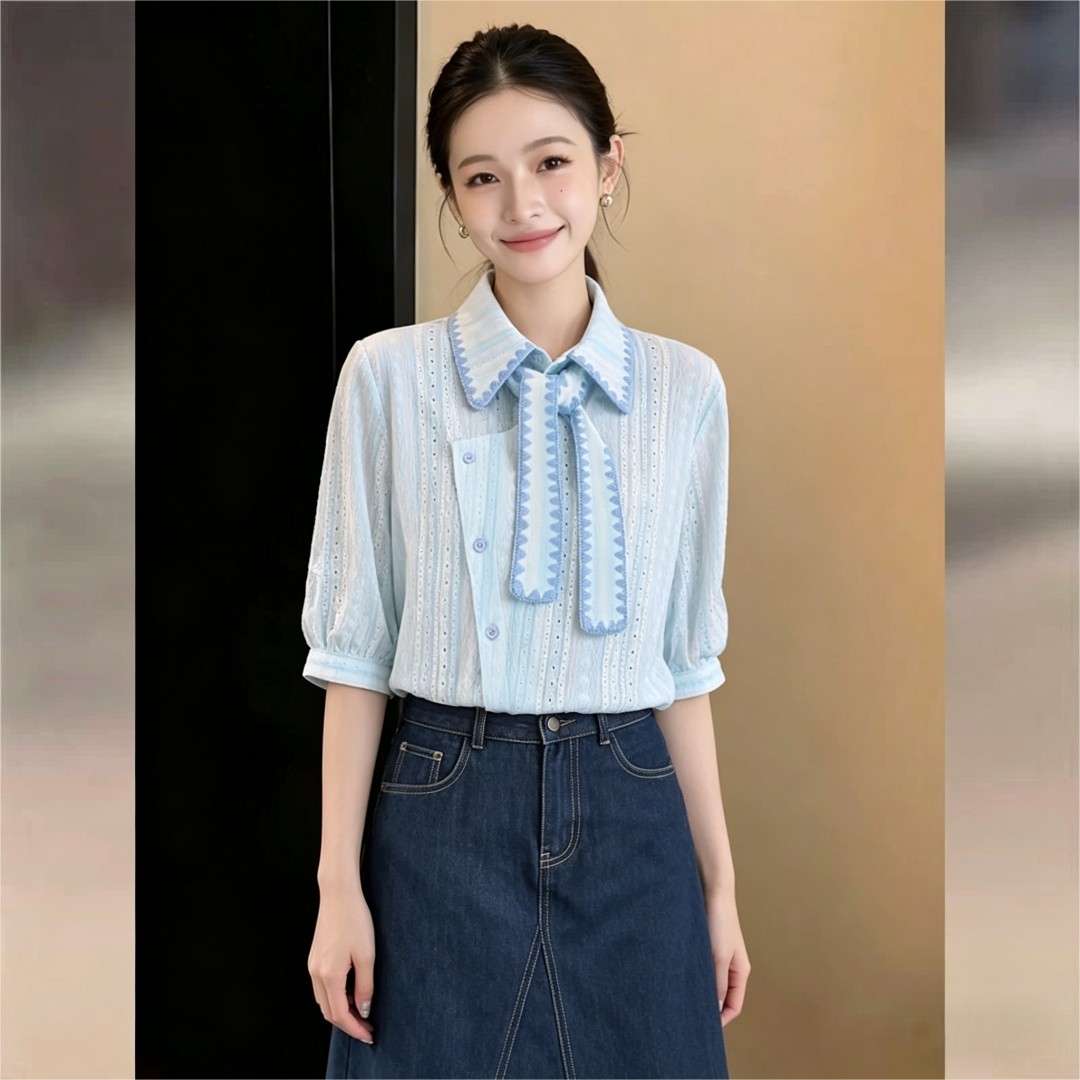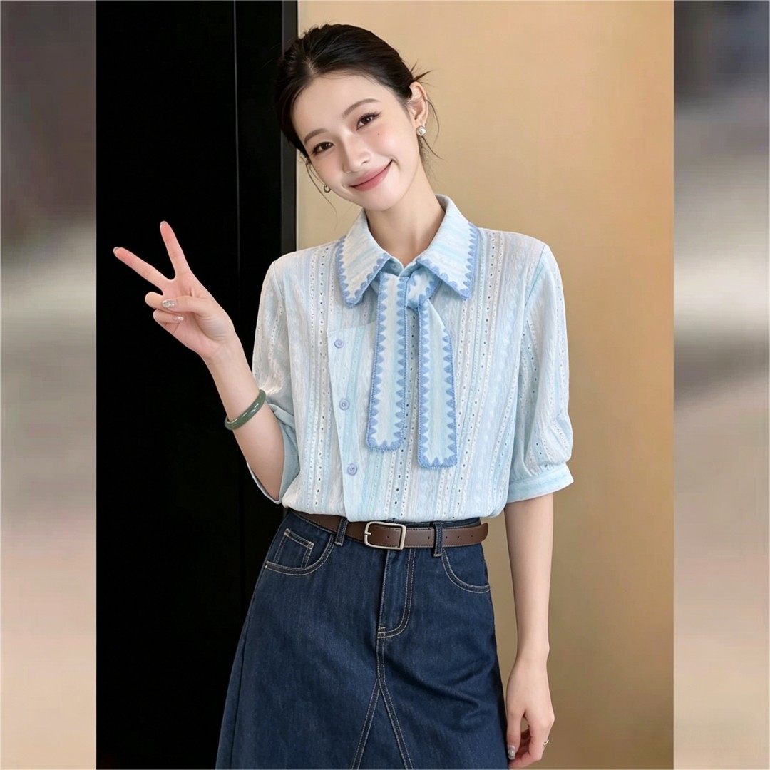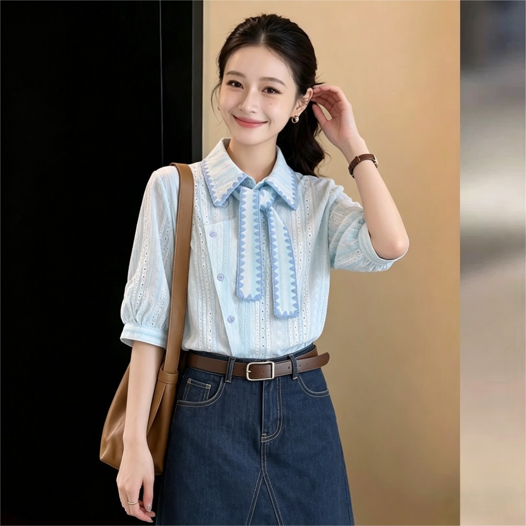 실사 프랑스식 질감 센스 리본 반팔 셔츠 여성 2026 여름 디자인 맨위 셔츠