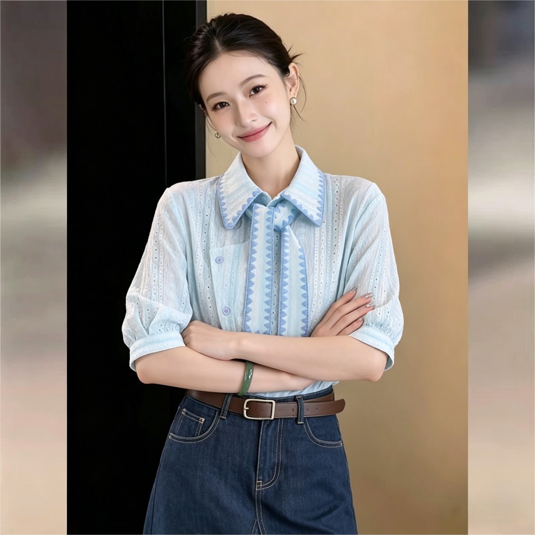 실사 프랑스식 스탠드 칼라 칠보 반팔 티셔츠 스타일 여성 셔츠 2026 여름 빛 요리 한 작은 대중 아니요 명중 섹션 맨위