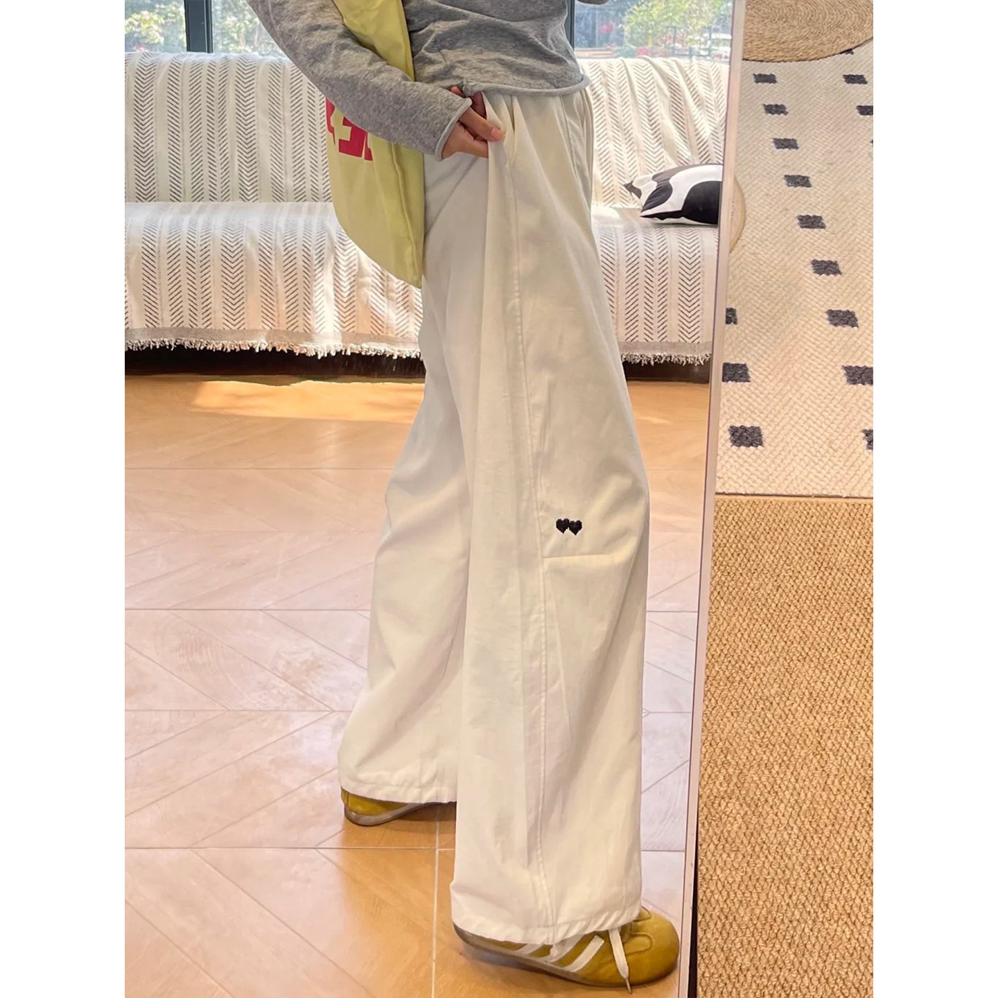 화이트 워크웨어 팬츠 여자 작은 키 스트레이트 캐주얼 바지 빅 사이즈 지방 mm 슬림해 보이는 와이드 레그 팬츠 배 모양 보은 바지