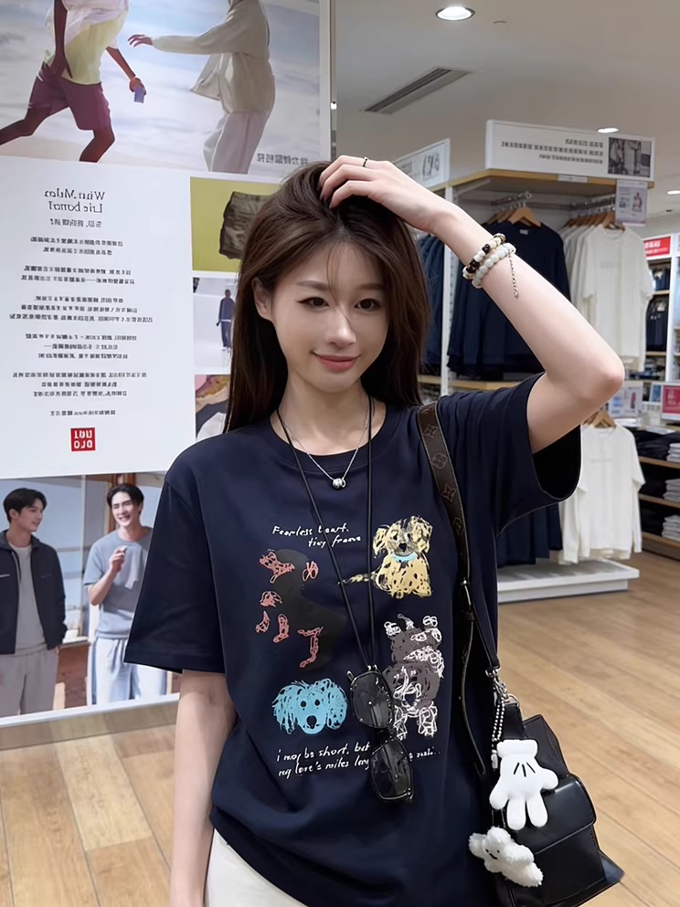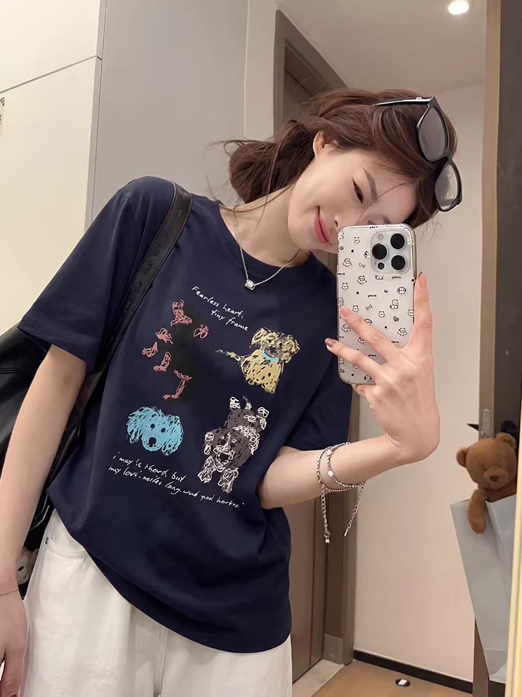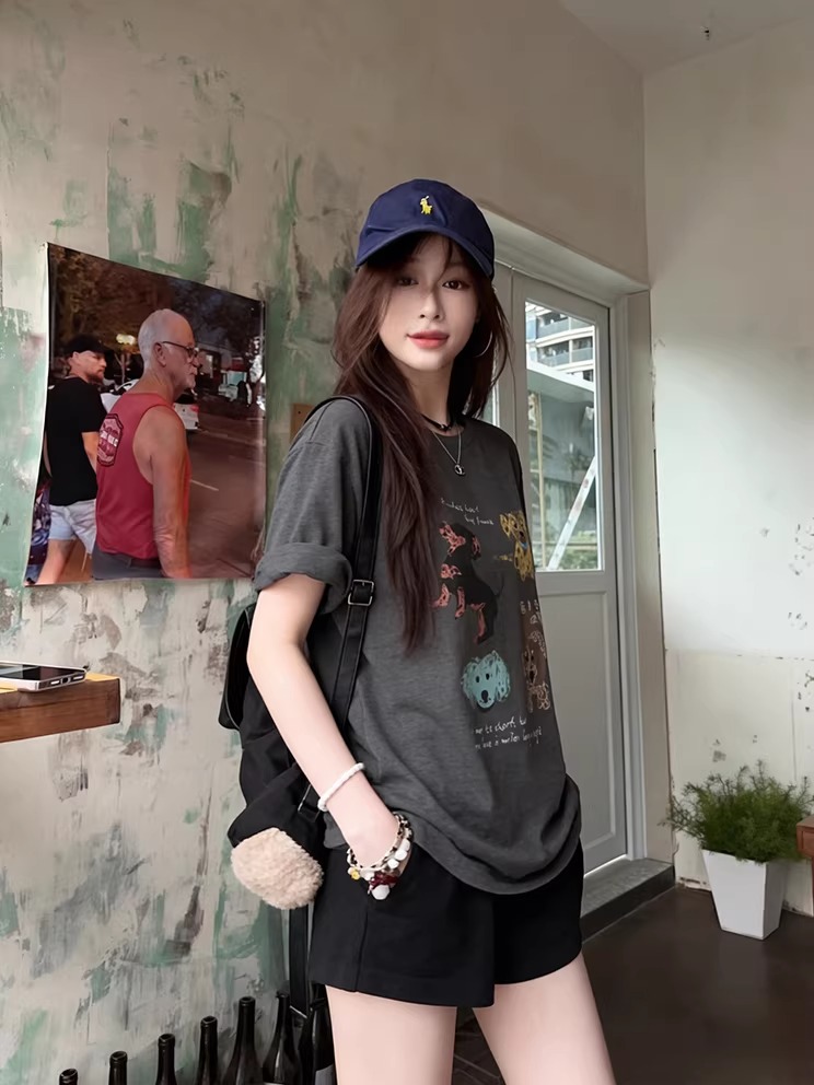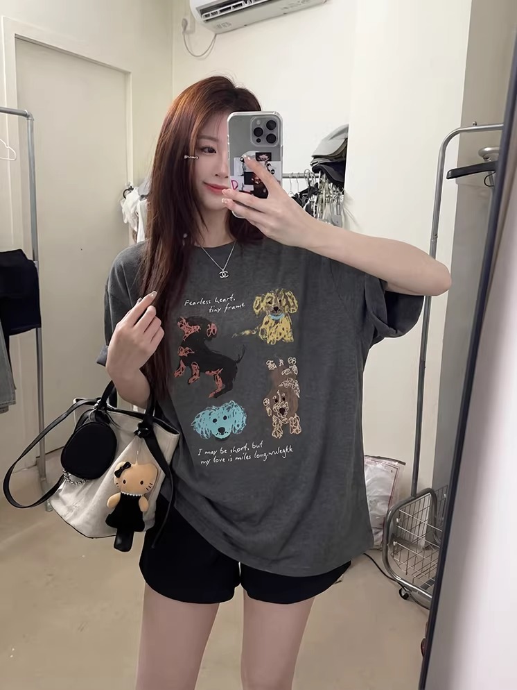 21 순면 210 그램 2026 년 봄 여름 드레스 반팔 티셔츠 여성 한국 스타일 프린트