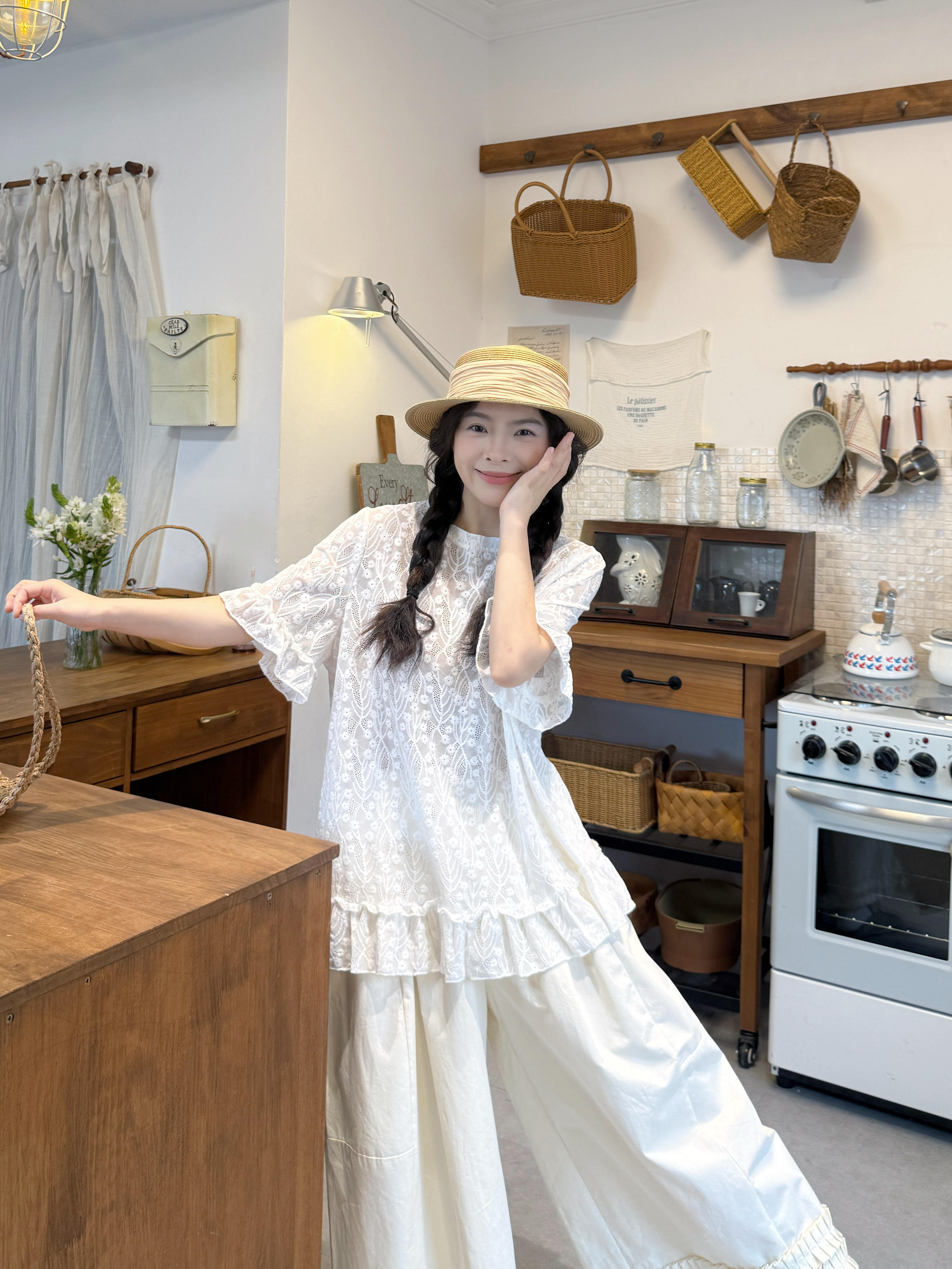 실사 레이스 레이스 루즈핏 자수 반팔 셔츠