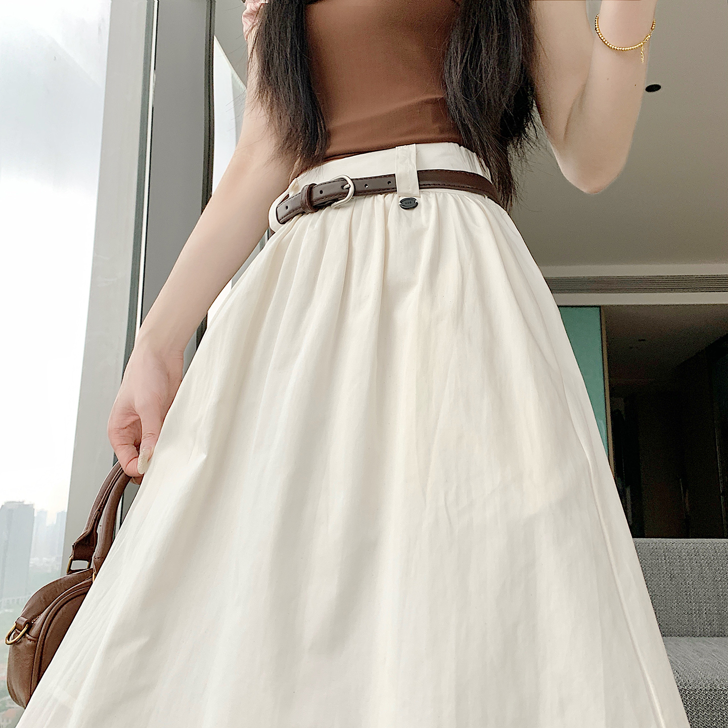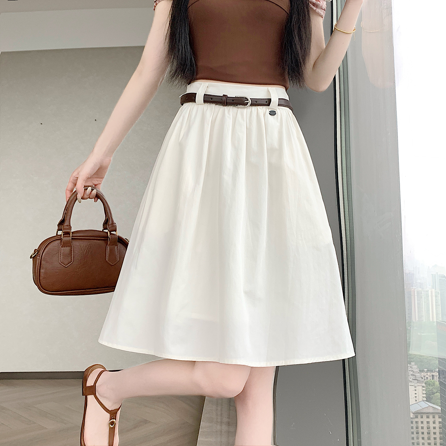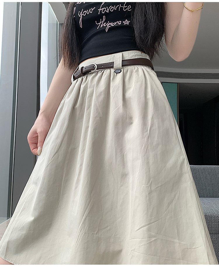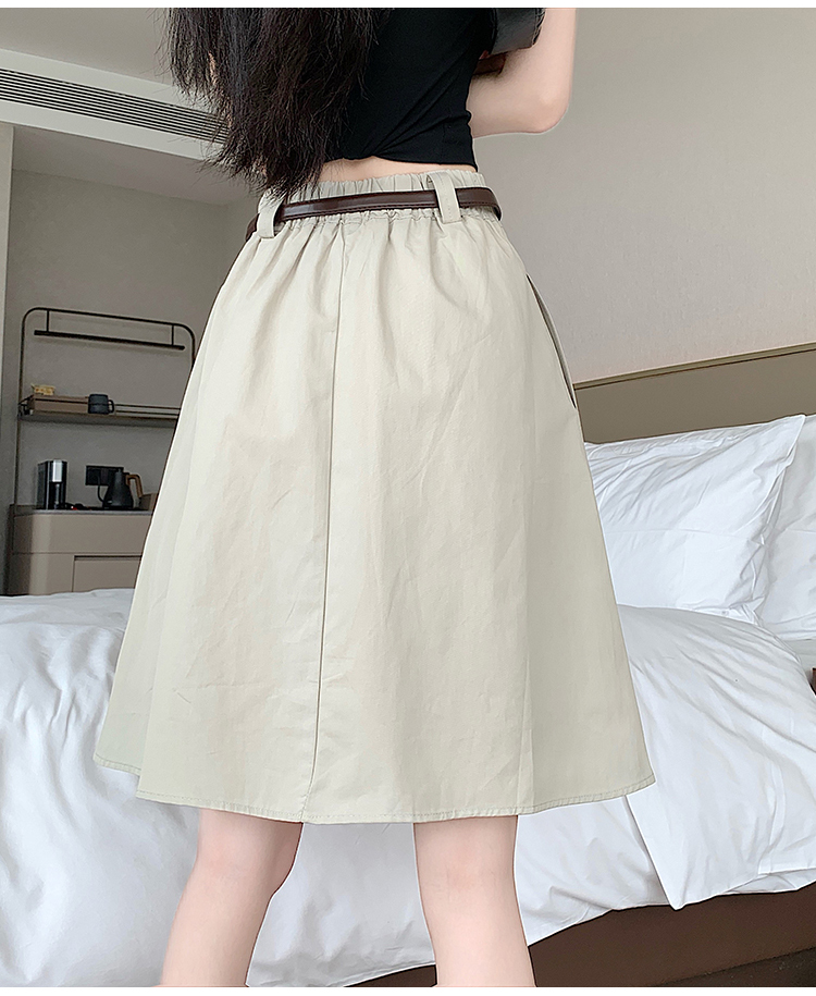 실사 2026 여름 한 부서 표지 넓적 다리 슬림해 보이는 짜임 벨트 디자인 중간 길이 면 린넨 도루 센스 한 마디 반신 스커트 우산 치마