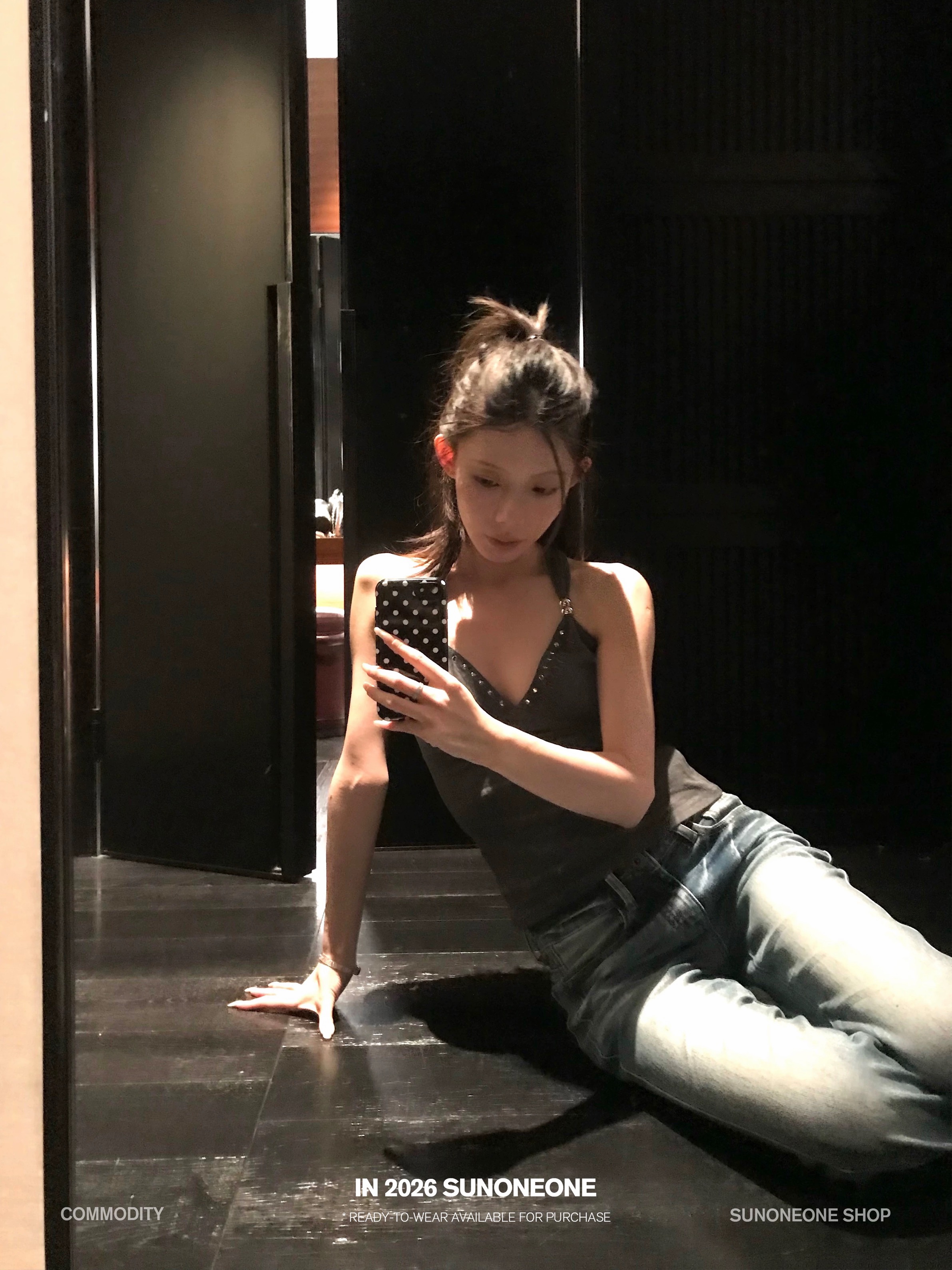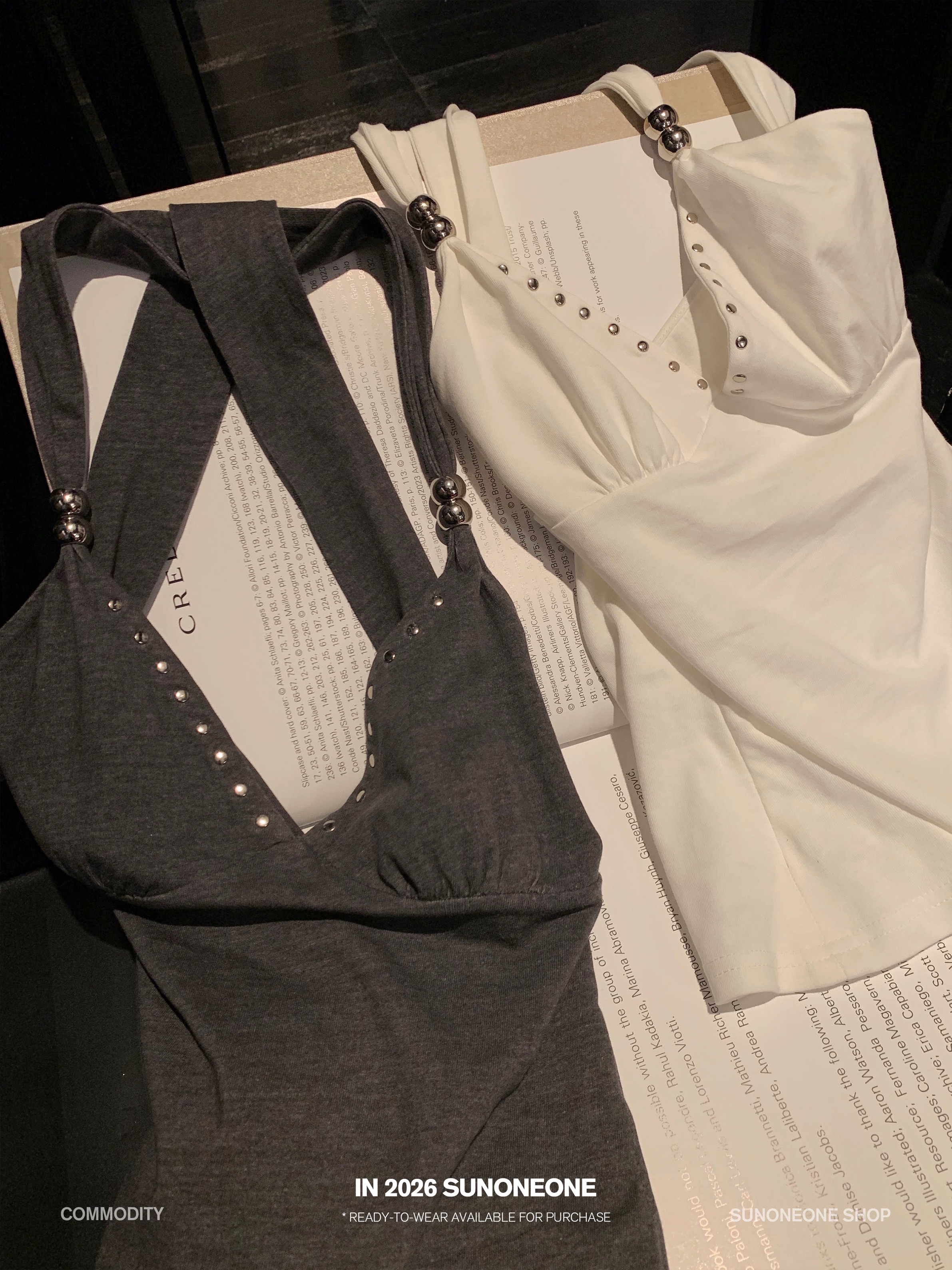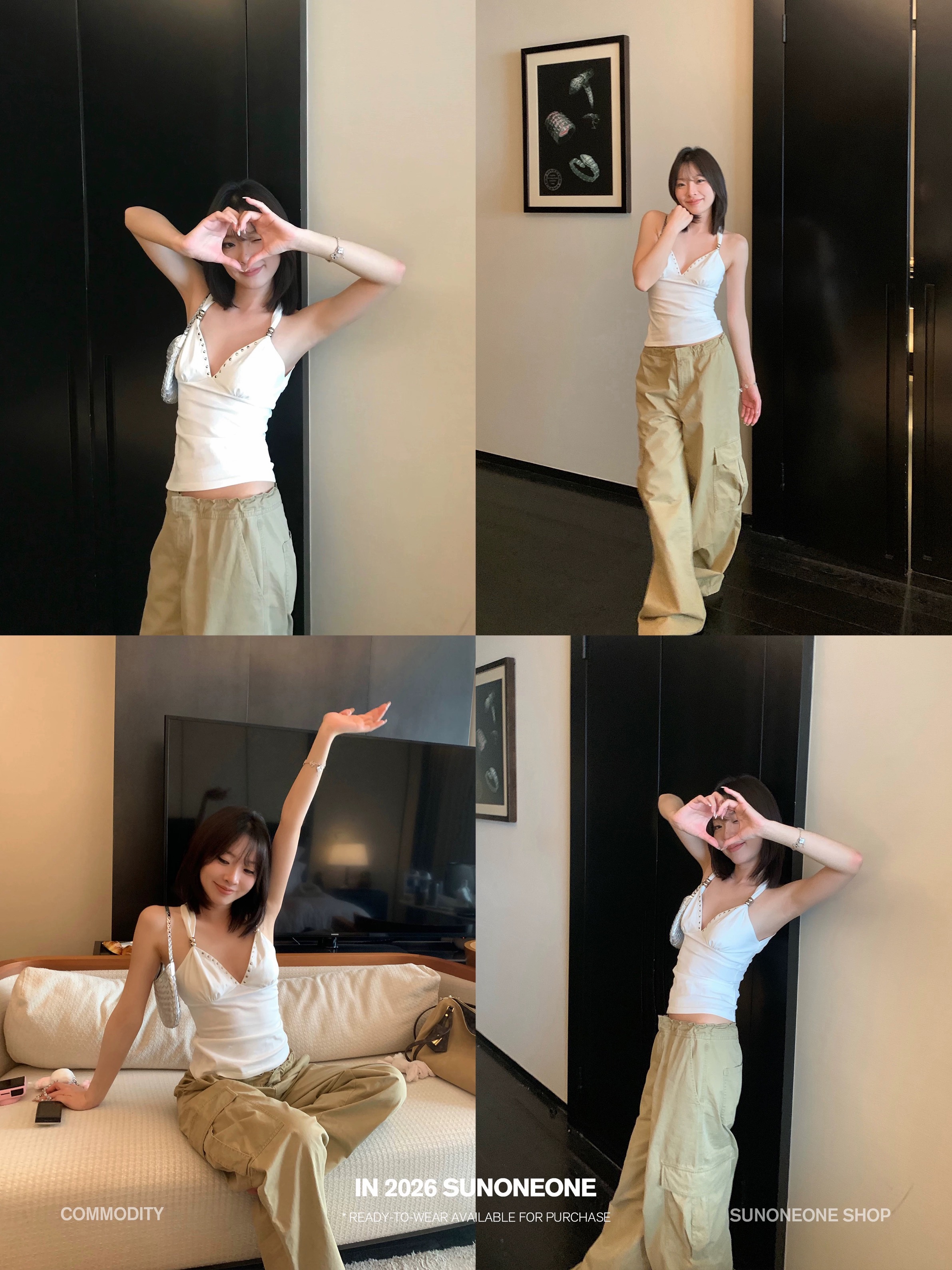 4muggle 단색 쇼트 스타일 V넥 주름 슬립 작은 조끼 여성 여름 아메리칸 레트로 핫걸 몸매 가꾸기 맨위