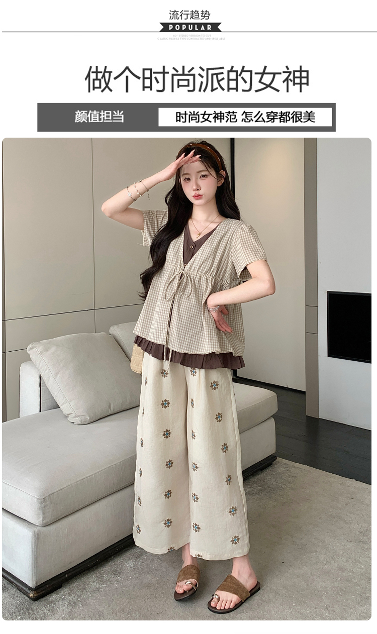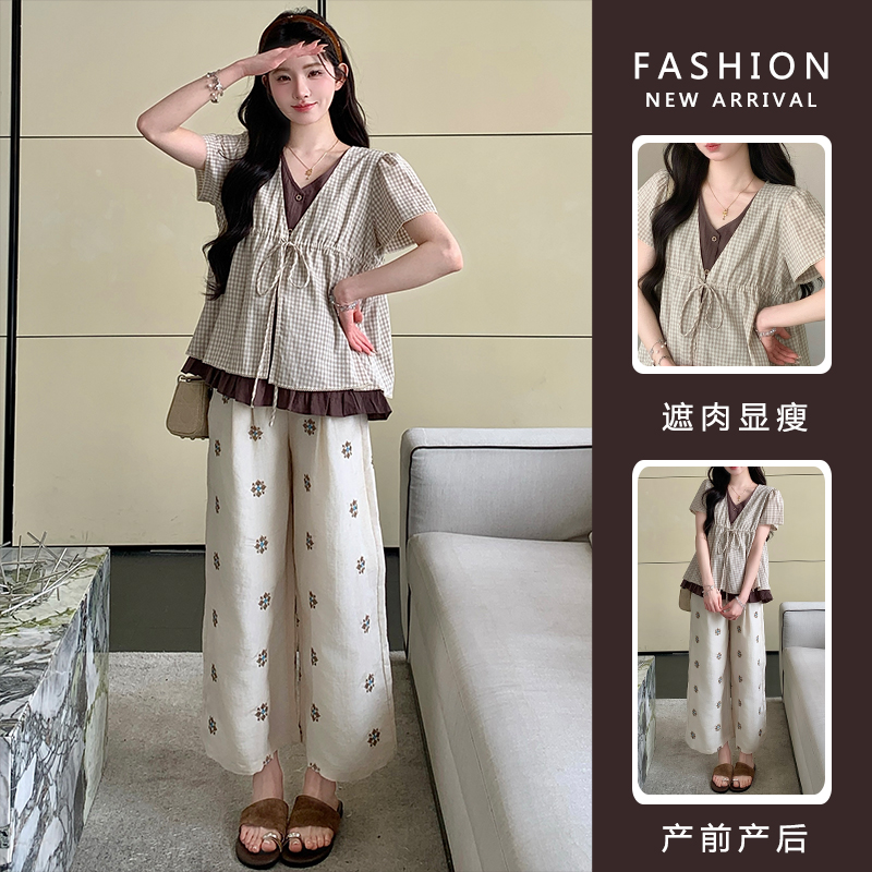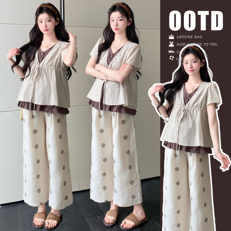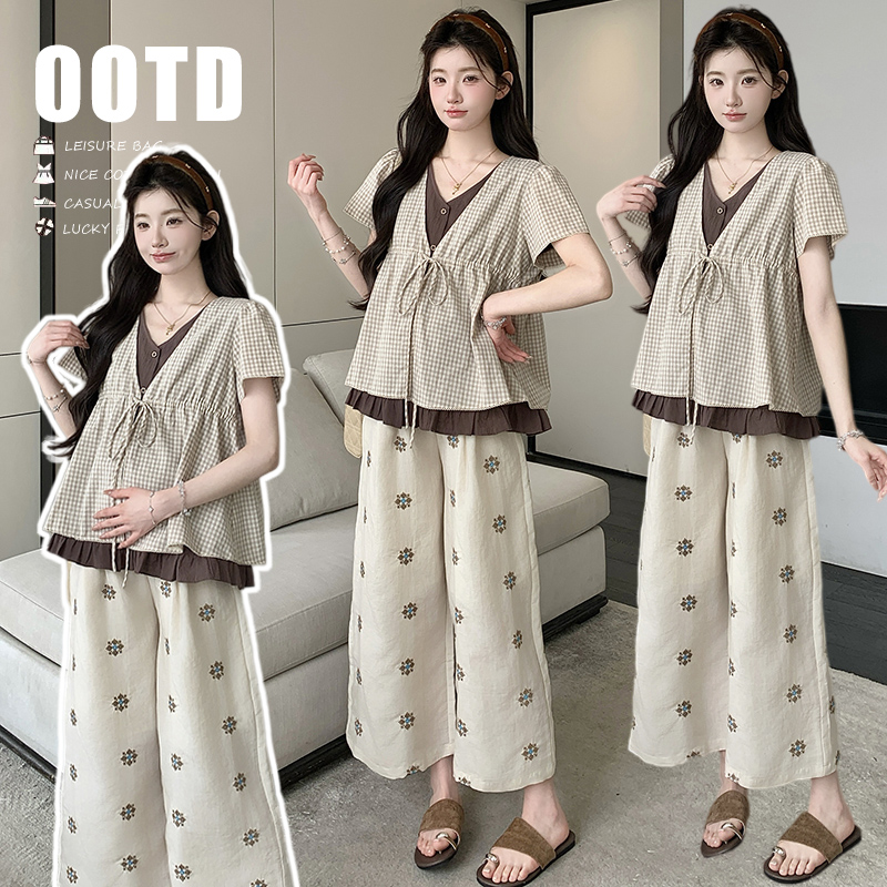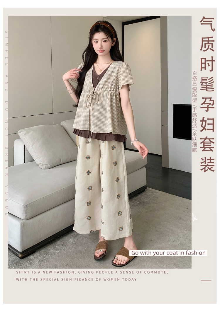 실사 여름 신선함 V넥 루즈핏 조끼 인형 셔츠 와이드 레그 팬츠 치마 임신 엄마 디스플레이 화이트 연령 감소 세트