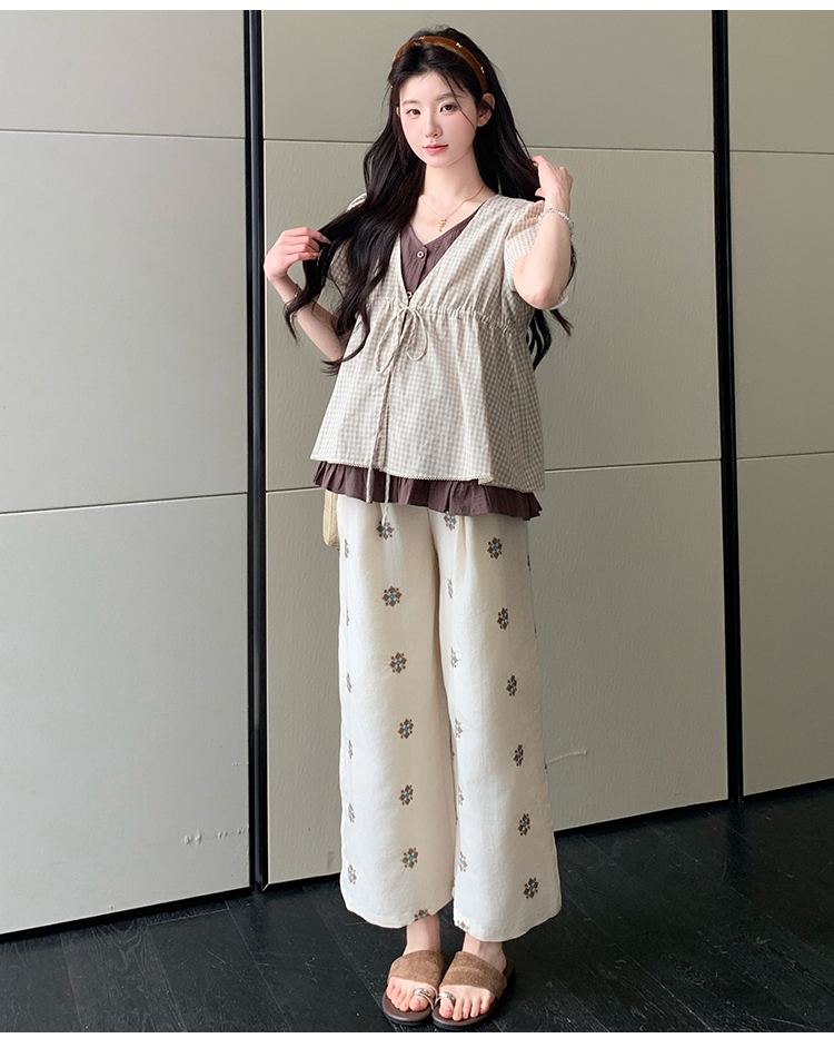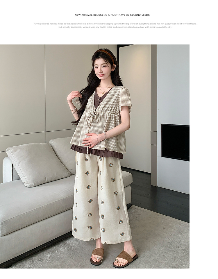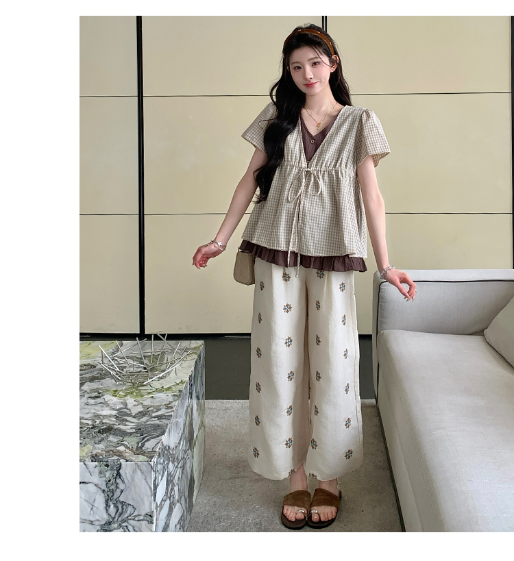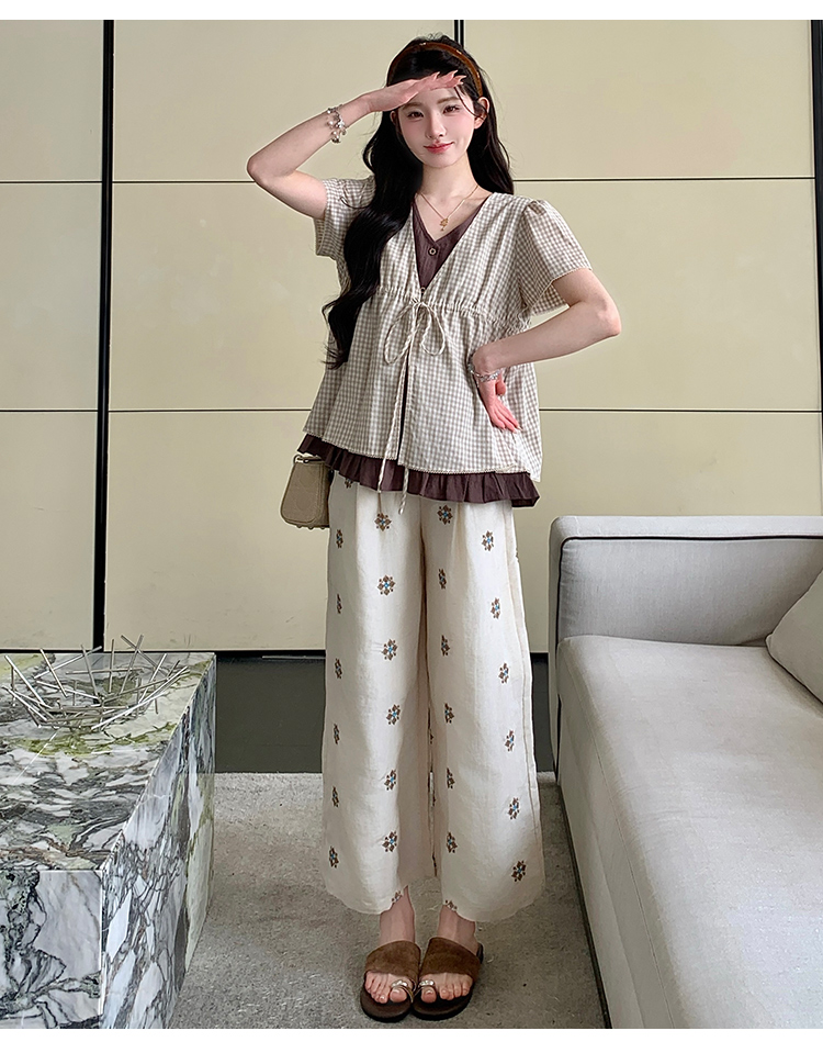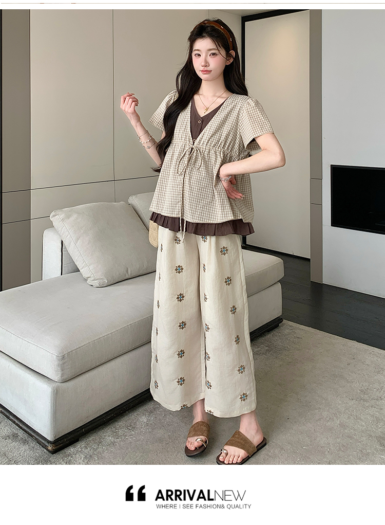 실사 여름 신선함 V넥 루즈핏 조끼 인형 셔츠 와이드 레그 팬츠 치마 임신 엄마 디스플레이 화이트 연령 감소 세트