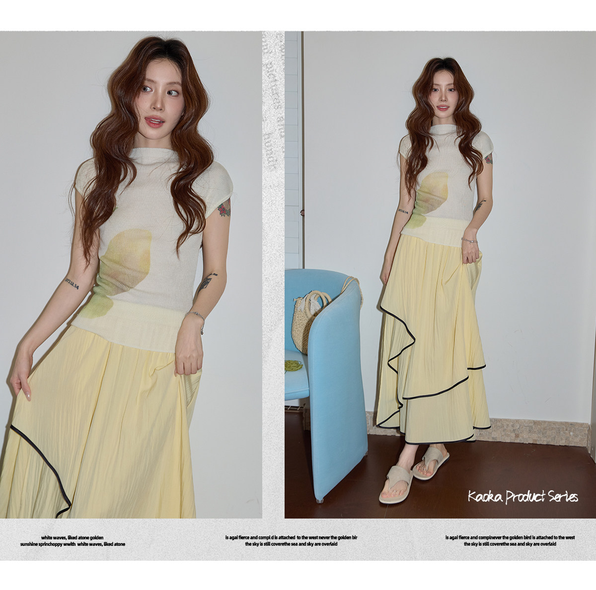 jingli studio 프랑스식 품격 검정색 오프숄더 티셔츠 여성 여름 하이웨이스트 슬림해 보이는 케이크 반신 스커트