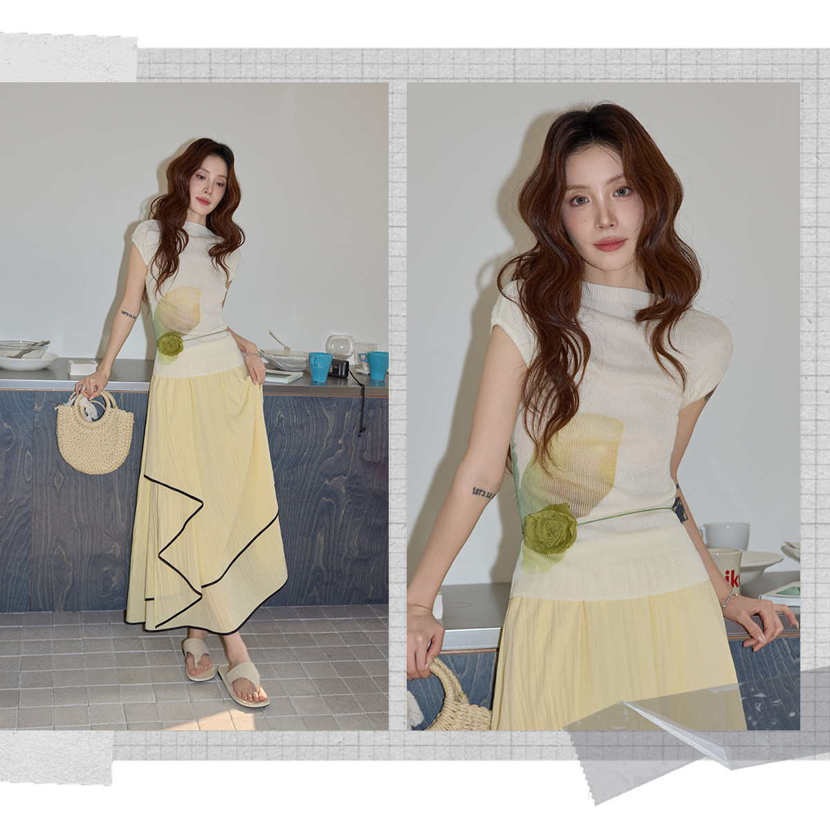 여름 스타일 프랑스식 디자인 센스 연령 감소 프릴 보트넥 니트 꽃무늬 드레스 꽃무늬 길다 치마