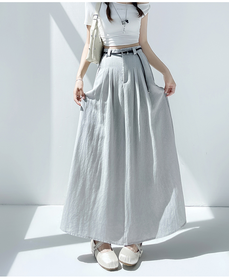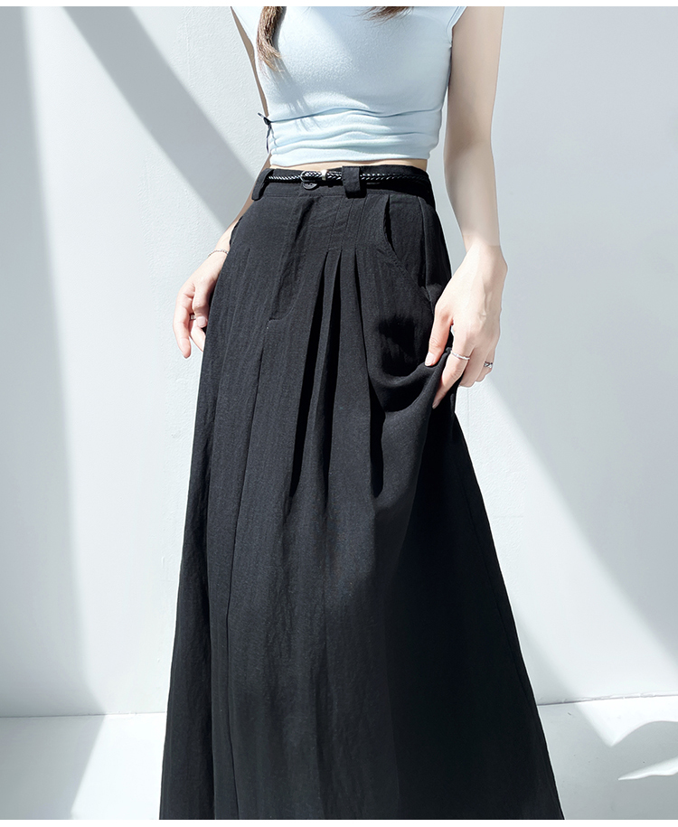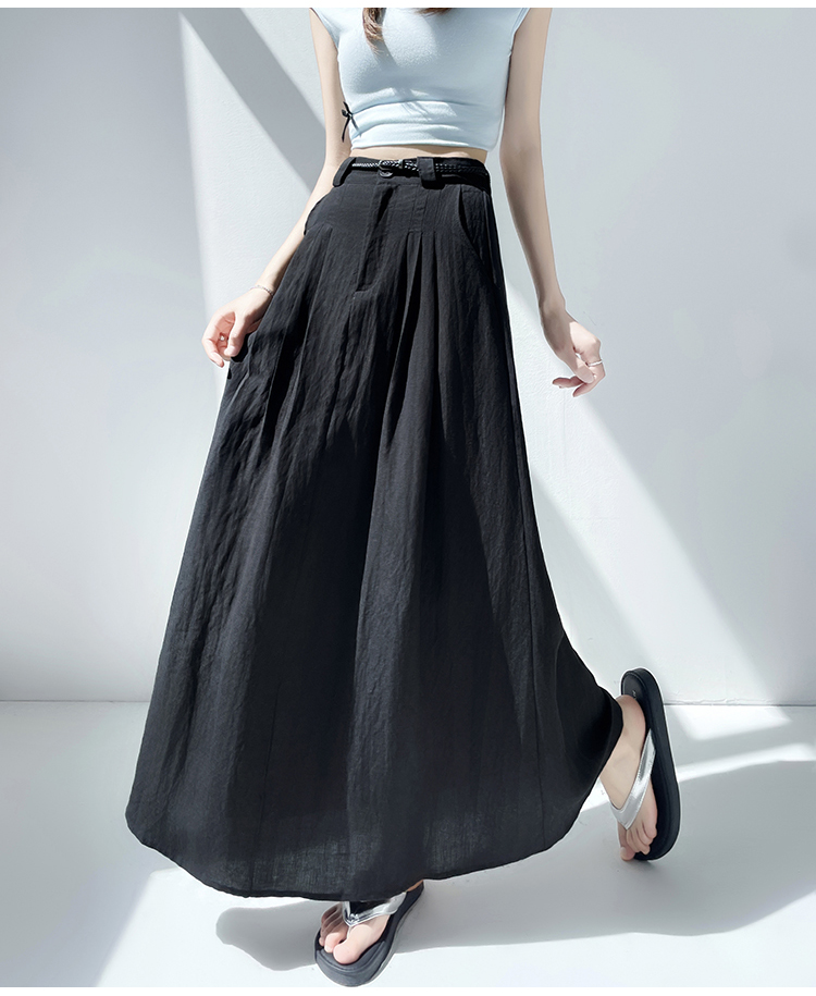 실사 2026 여름 한 부서 미니멀리즘 표지 넓적 다리 슬림해 보이는 짜임 벨트 디자인 중간 길이 면 린넨 한 마디 반신 스커트 우산 치마