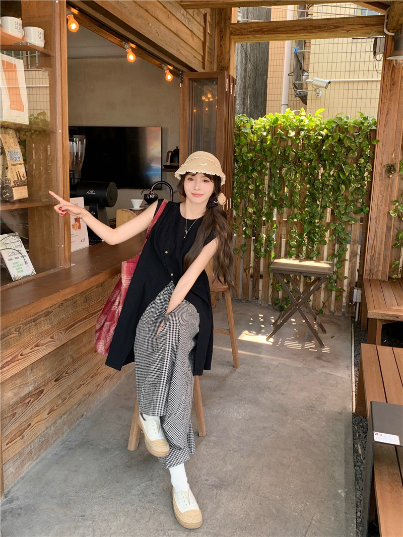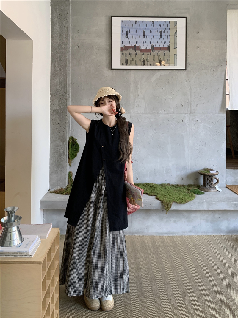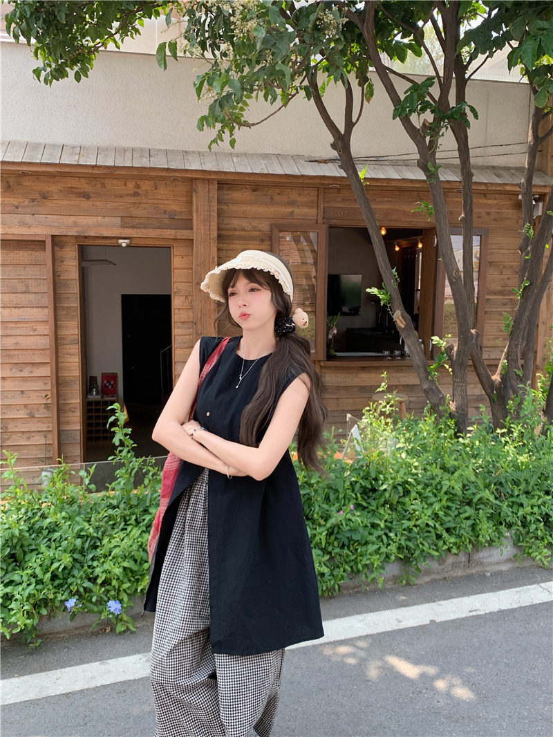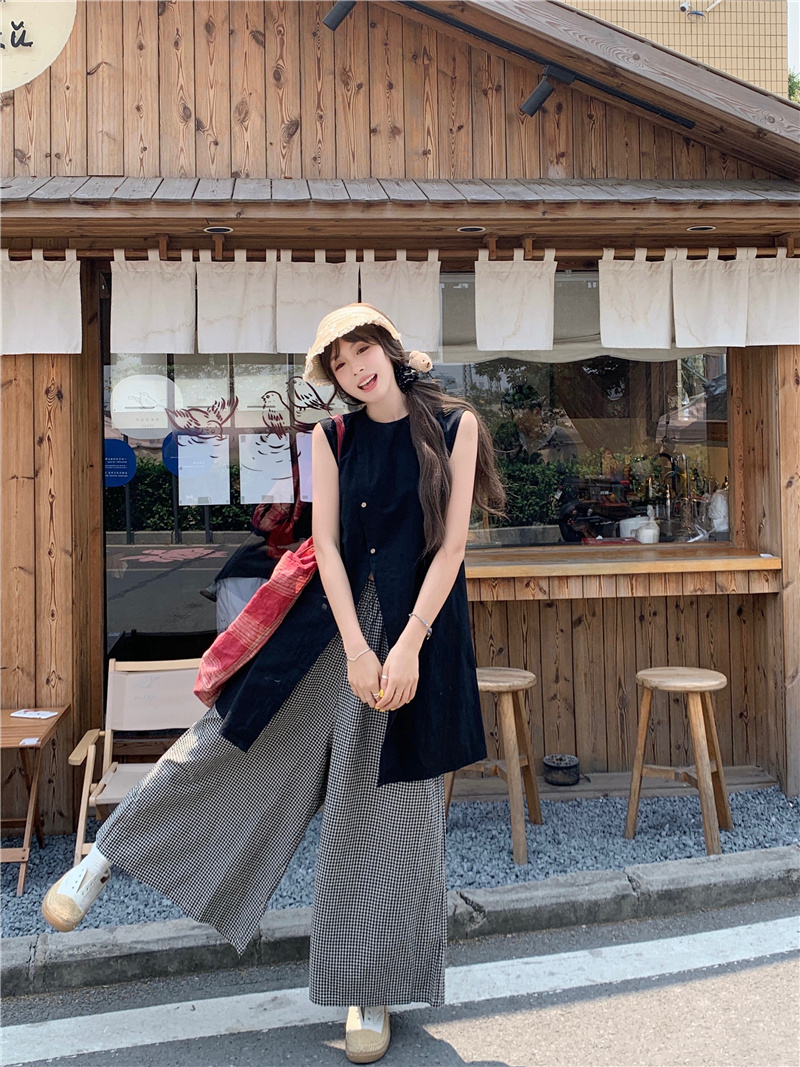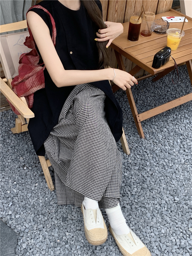 실사 다용도 루즈핏 슬림해 보이는 경 사진 밑단 트임 민소매 면 베스트 조끼 체크무늬 와이드 레그 팬츠