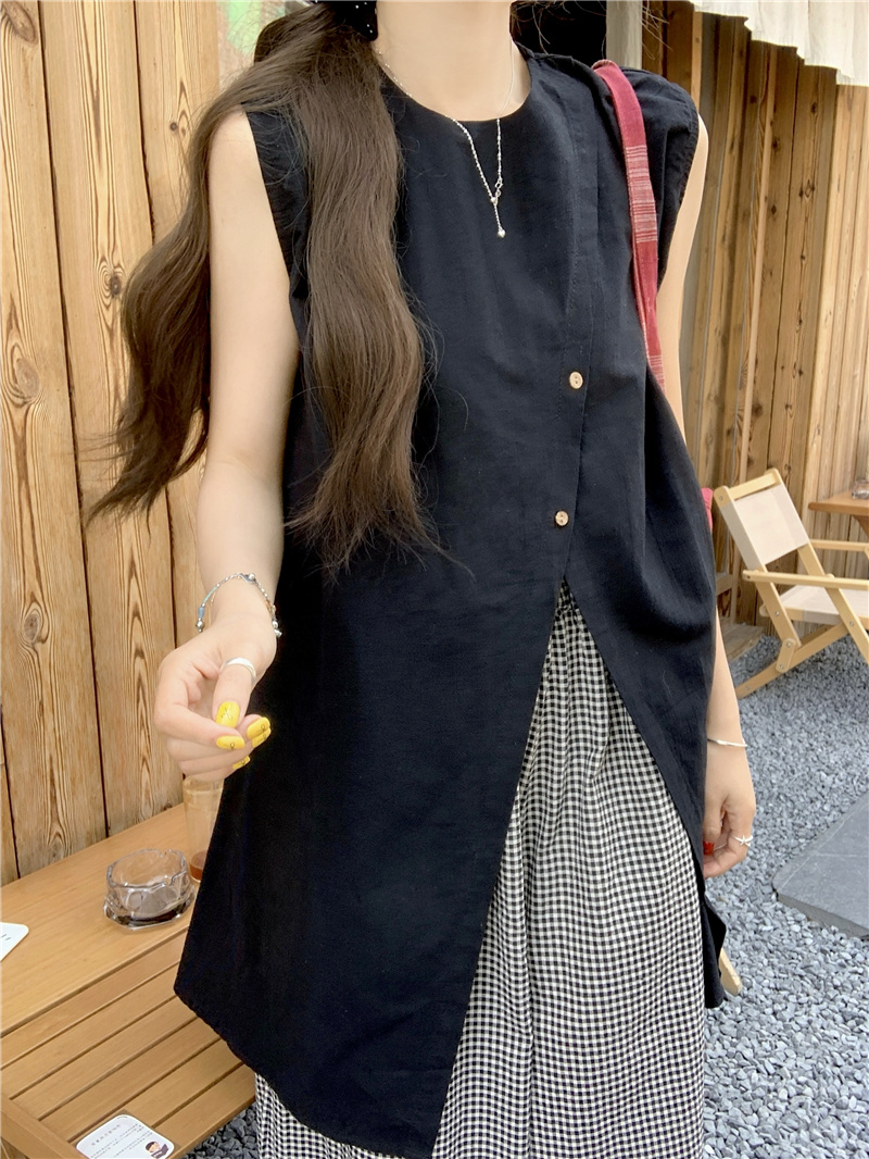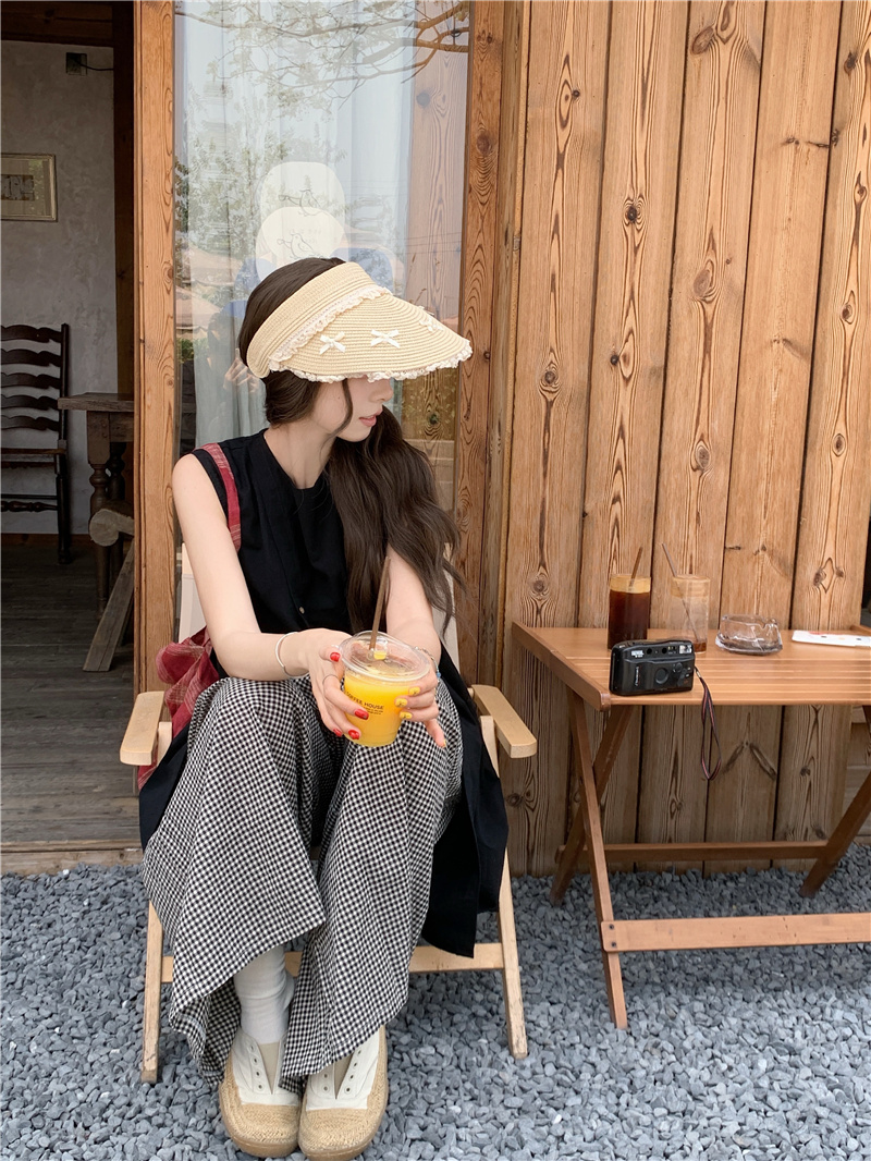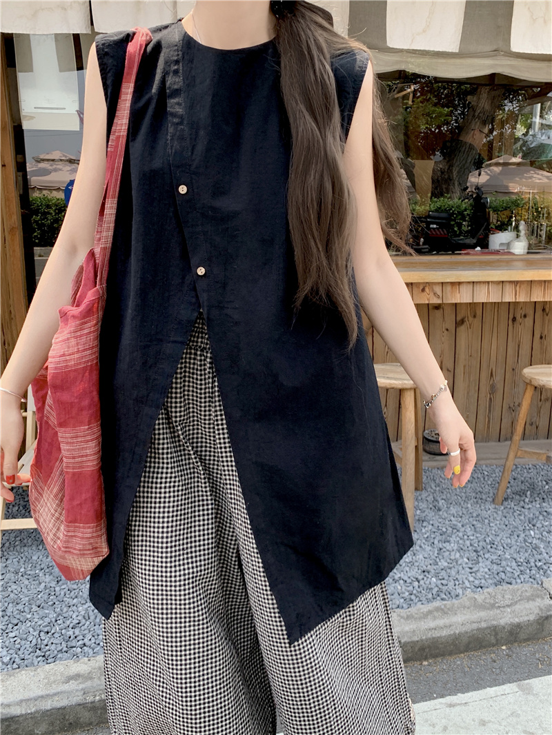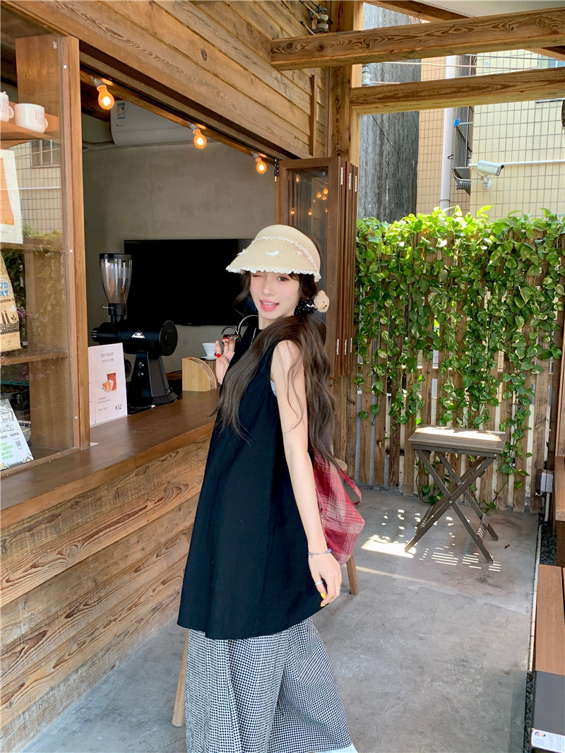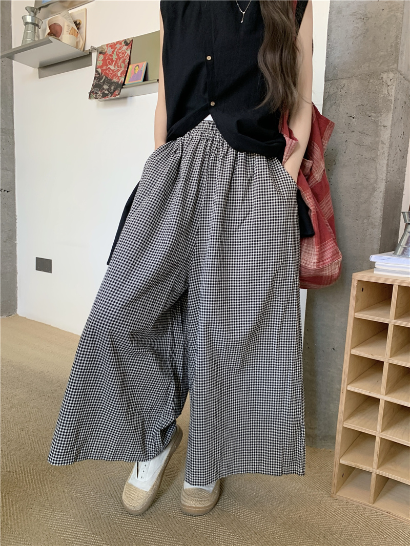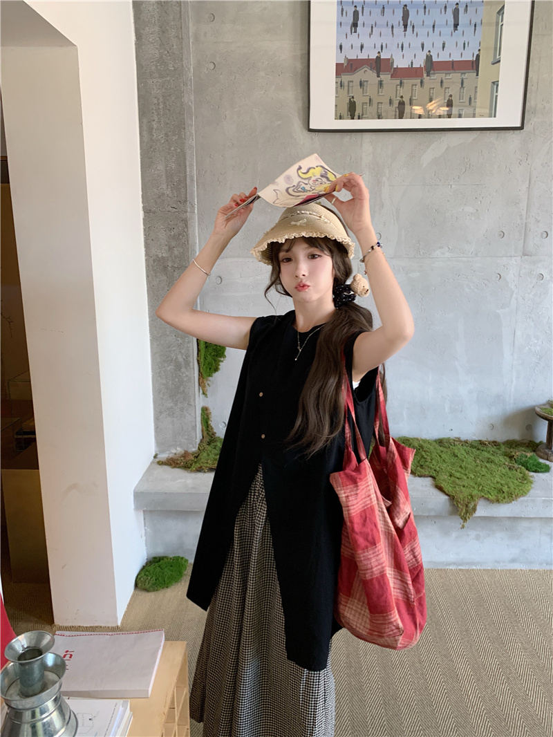 실사 다용도 루즈핏 슬림해 보이는 경 사진 밑단 트임 민소매 면 베스트 조끼 체크무늬 와이드 레그 팬츠