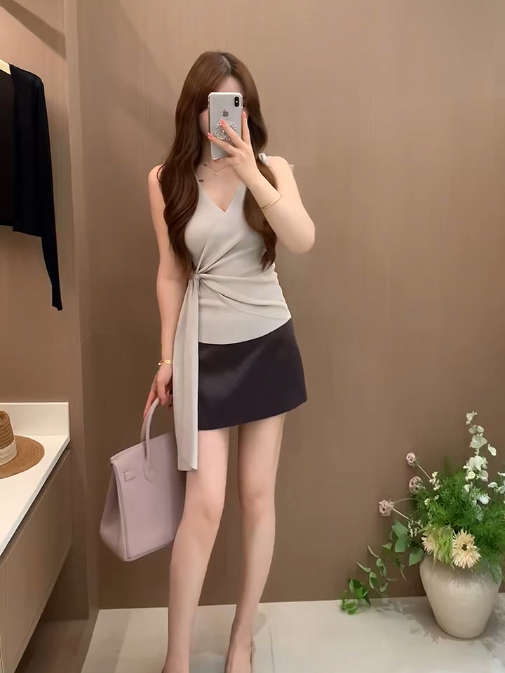 있음 도착 여름 프랑스식 품격 라운드 넥 니트 스웨터 조끼 여성 트임 스트랩 허리 수축 맨위 반신 스커트 여성
