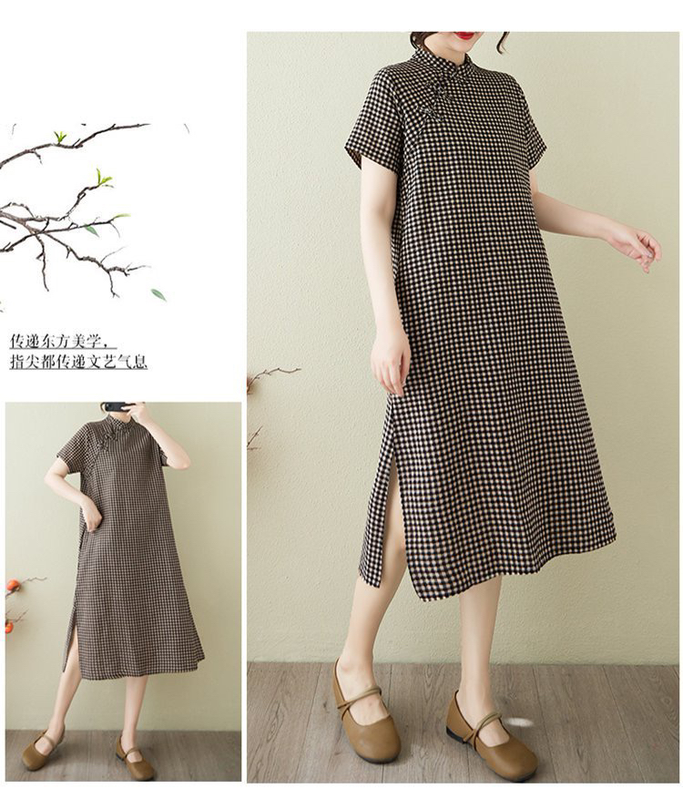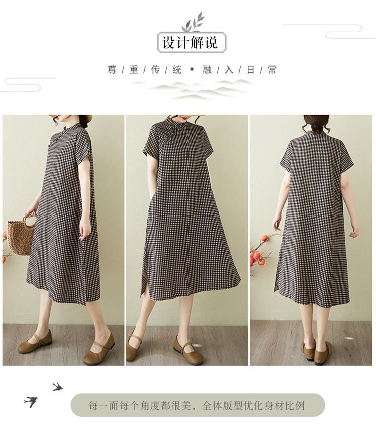 여름 빅 사이즈 여성 의류 면직물 작은 격자 루즈핏 캐주얼 다용도 개선 빅 사이즈 일상 반팔 치파오 중간 길이 스커트