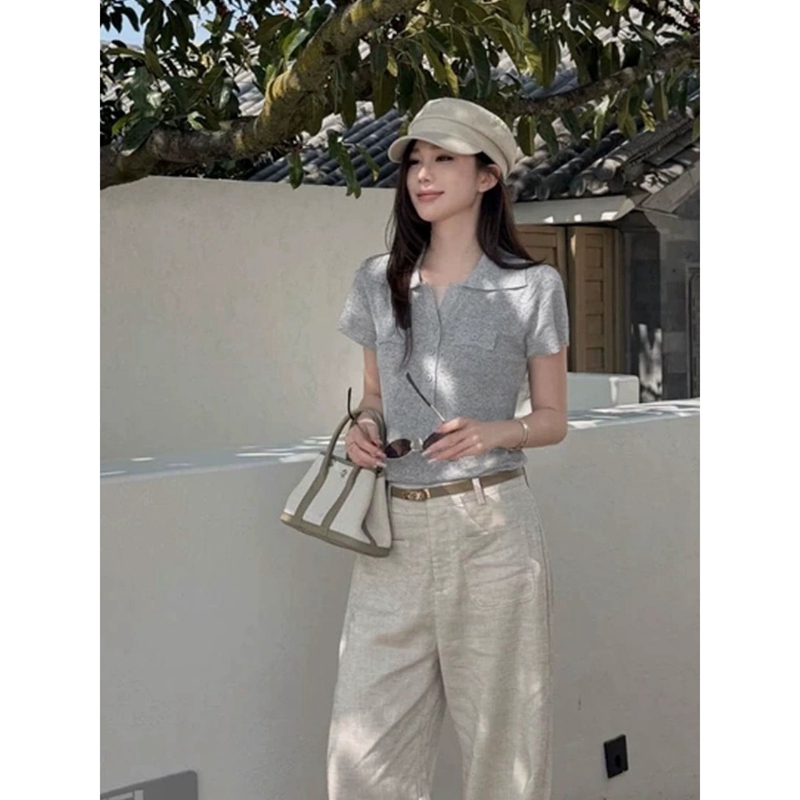 오래된 돈 바람 폴로 칼라 아마 니트 반팔 티셔츠 여성 여름 2026 새로운 몸매 가꾸기 슬림해 보이는 polo 긍정적 인 어깨 의류