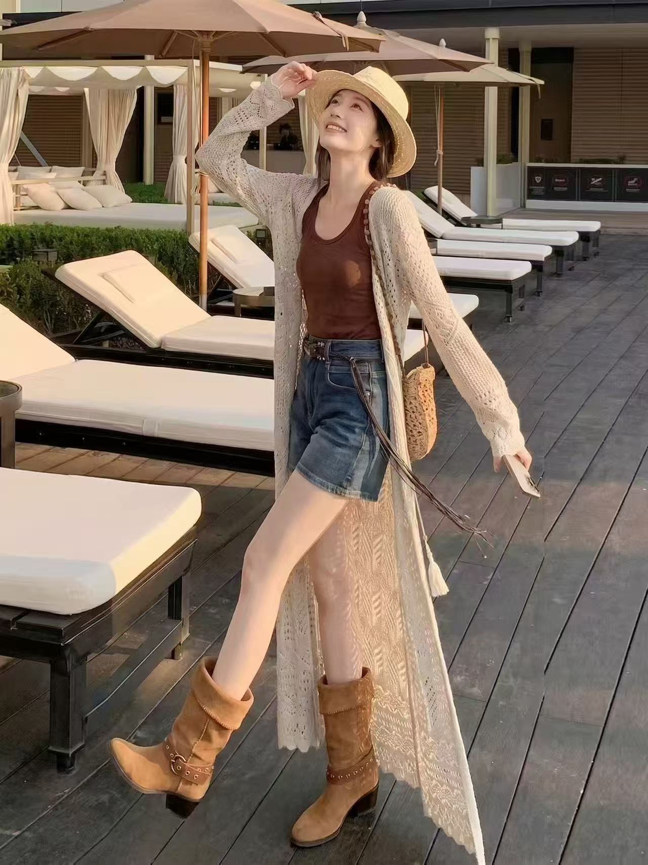 보헤미안 바람 홀로우 아웃 니트 오픈 가디건 여성 롱 코트 레이스업 외부 가져 가라. 몸매 가꾸기 슬림해 보이는 긴팔 재킷 휴가 바람