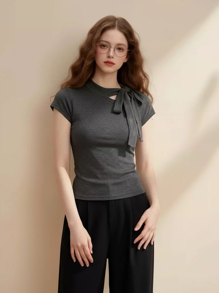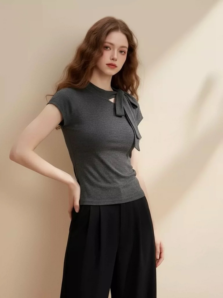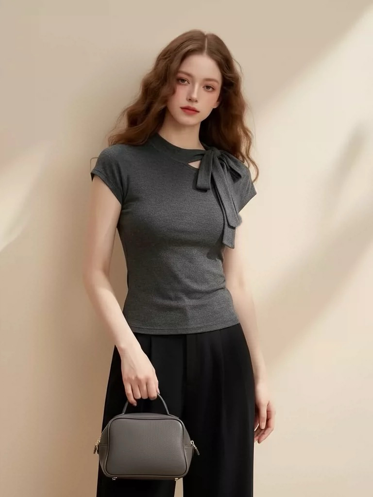 2026 여름 디자인 센스 회색 작은 키 반팔 티셔츠 여성 나비 넥타이 고유 한 라운드 넥 달콤함 맨위