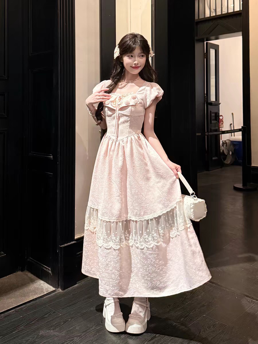 캄파넬라 세과 house 연인 우우 우우 달콤함 부드러운 바람 자수 레이스 조각 허리 수축 슬림해 보이는 롱 스커트 드레스