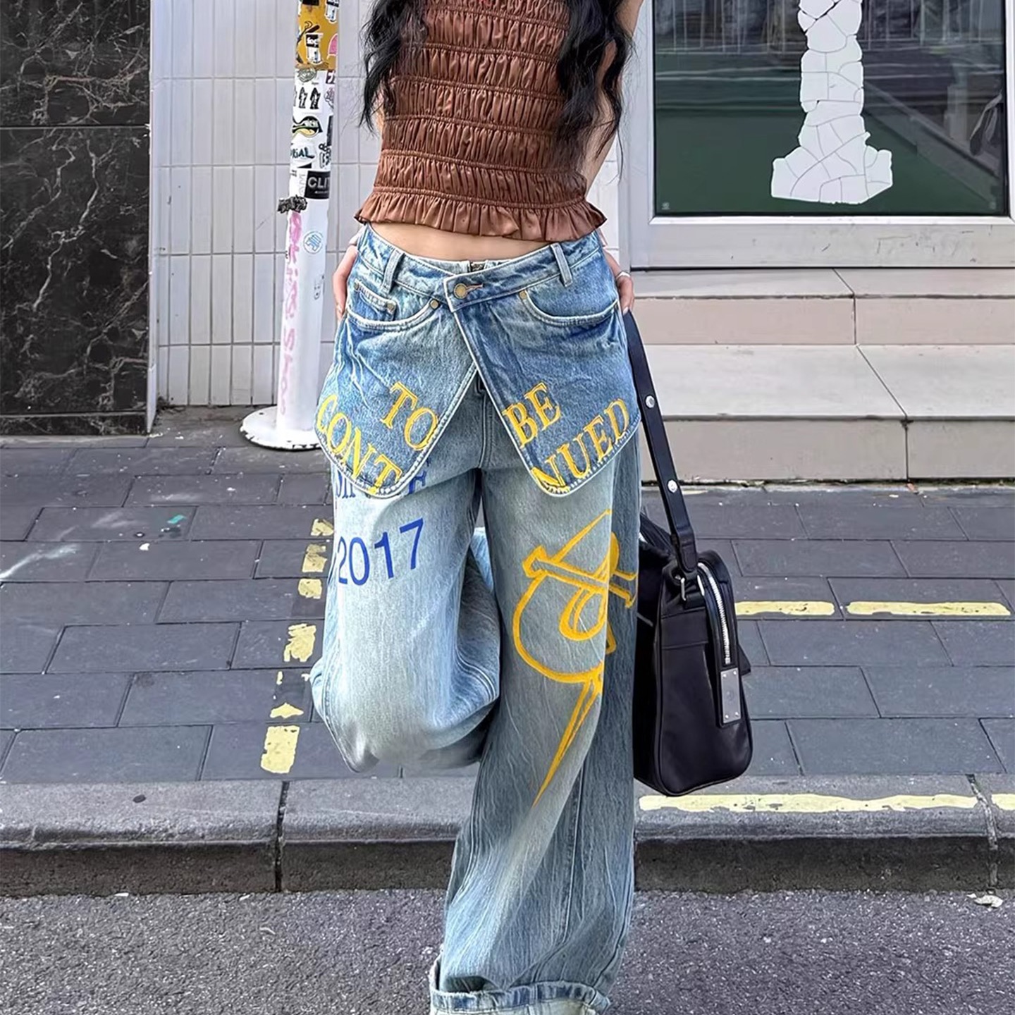 아메리칸 높음 거리 더블 허리 가져 가라. 조각 프린트 청바지 아이들 핫걸 페이크 레이어드 스택 착용 슬림해 보이는 바닥 청소 넓은 다리 길이 바지