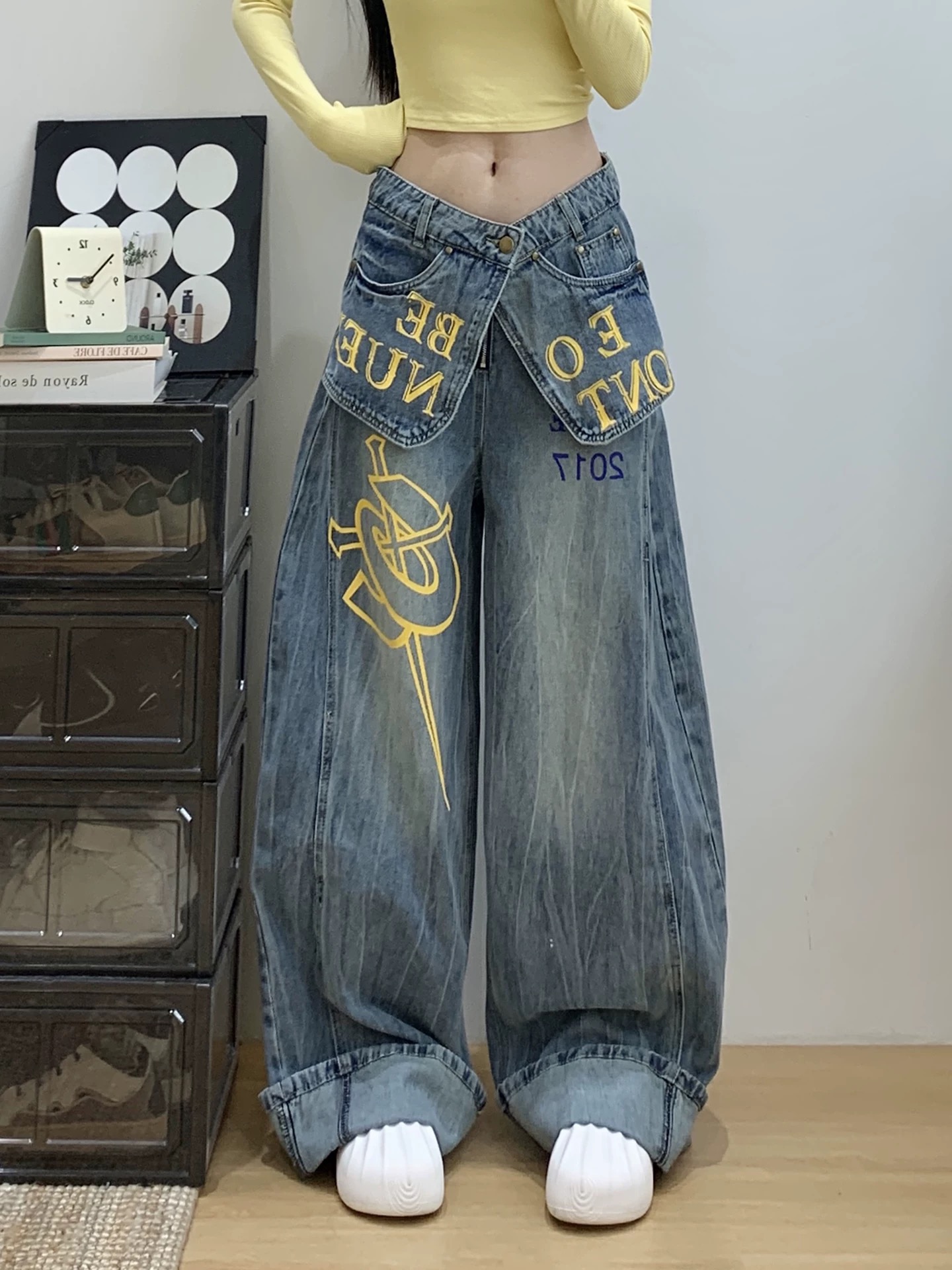 한 부서 디자인 센스 더블 허리 가져 가라. 조각 알파벳 프린트 청바지 여성 2026 가을 아메리칸 슬림해 보이는 모통이 칼 와이드 레그 팬츠