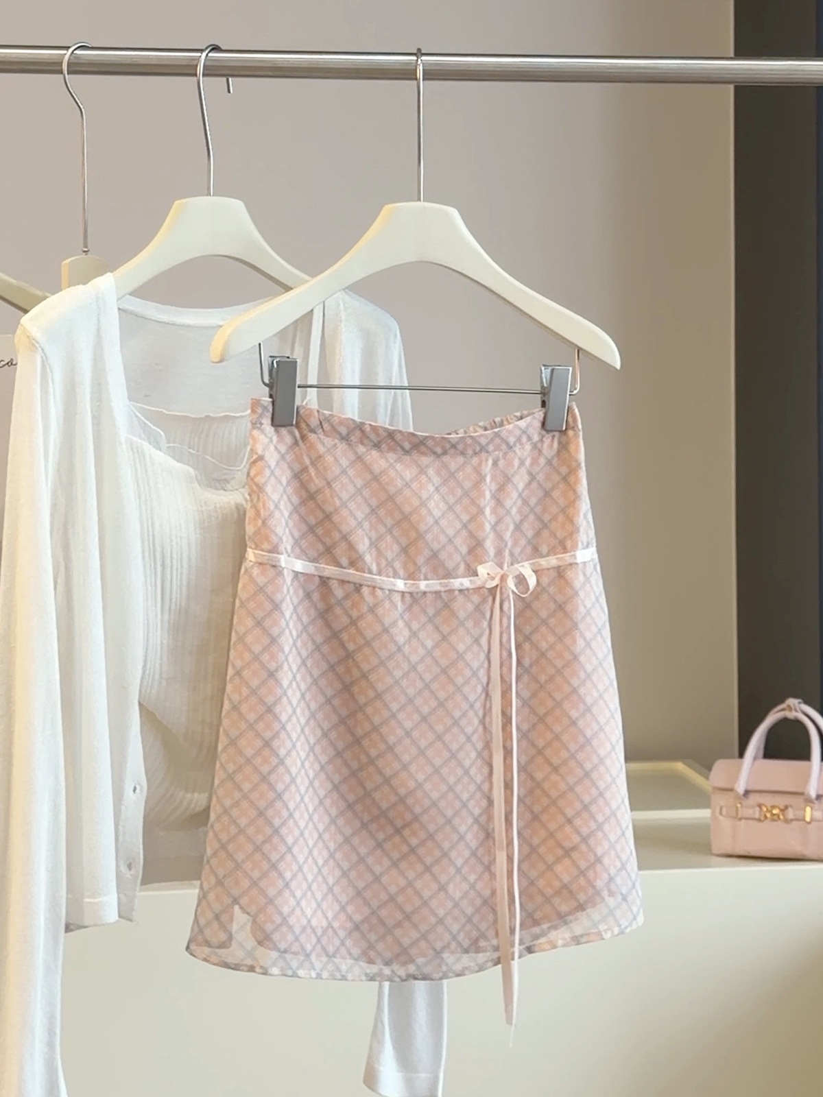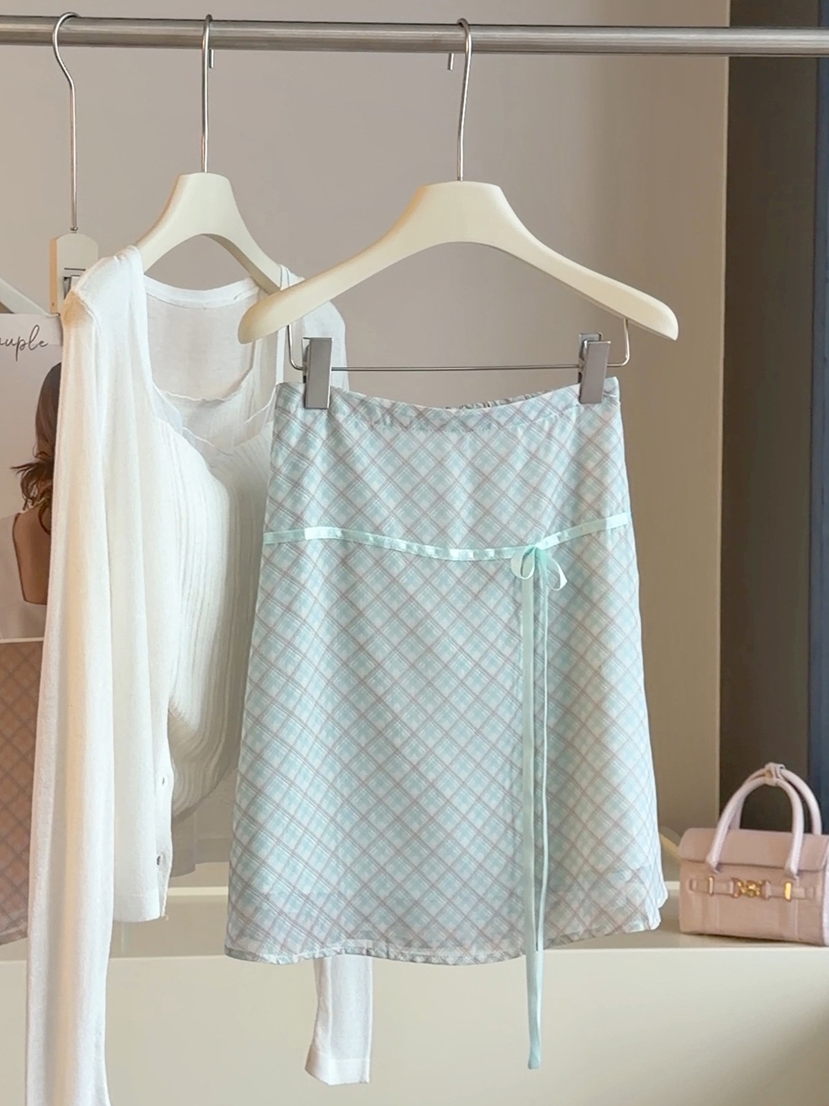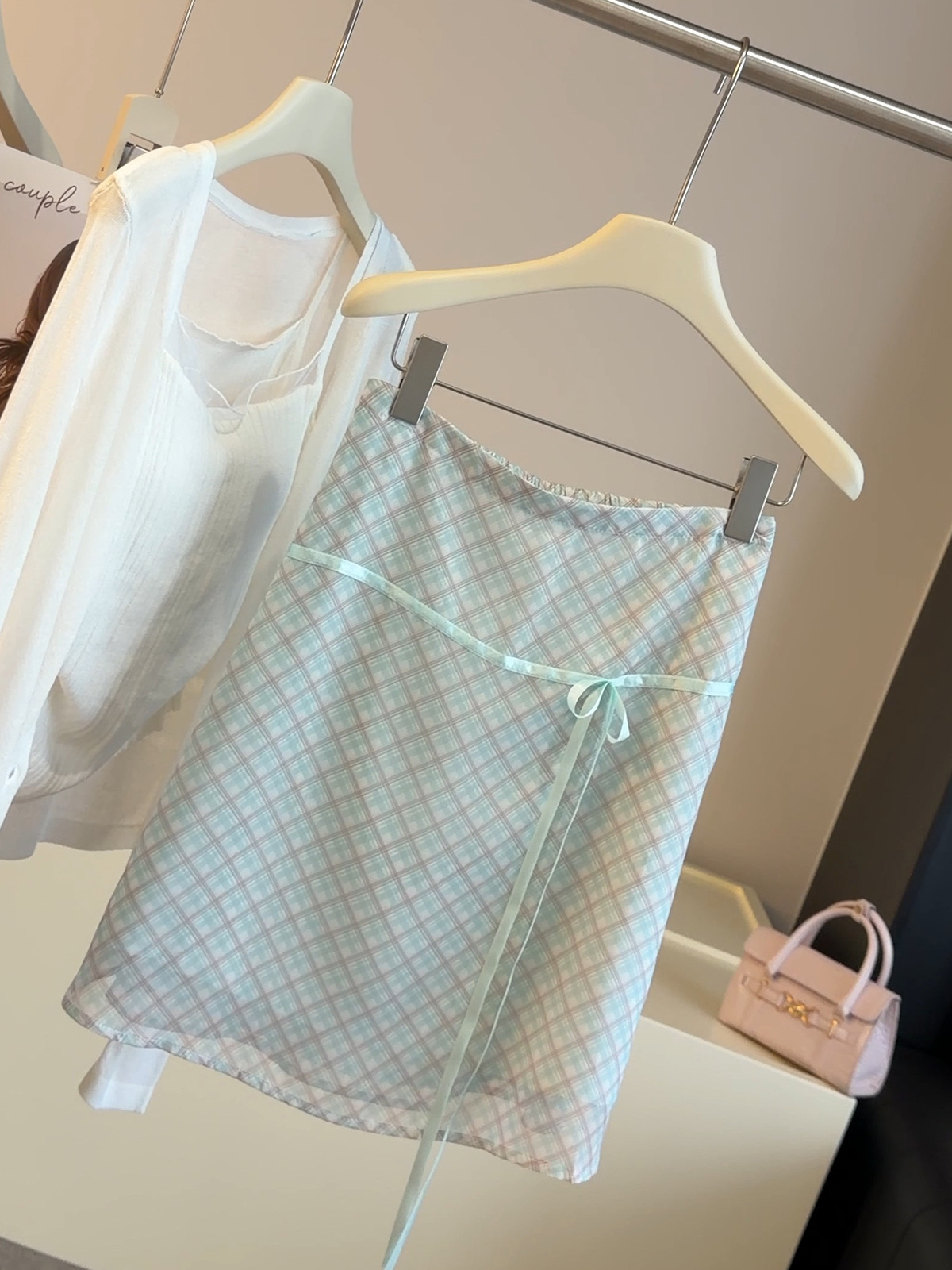 작은 청신 체크무늬 반신 스커트 여성 2026 여름 새로운 나비 넥타이 패션 배색 하이웨이스트 한 마디 중간 스커트