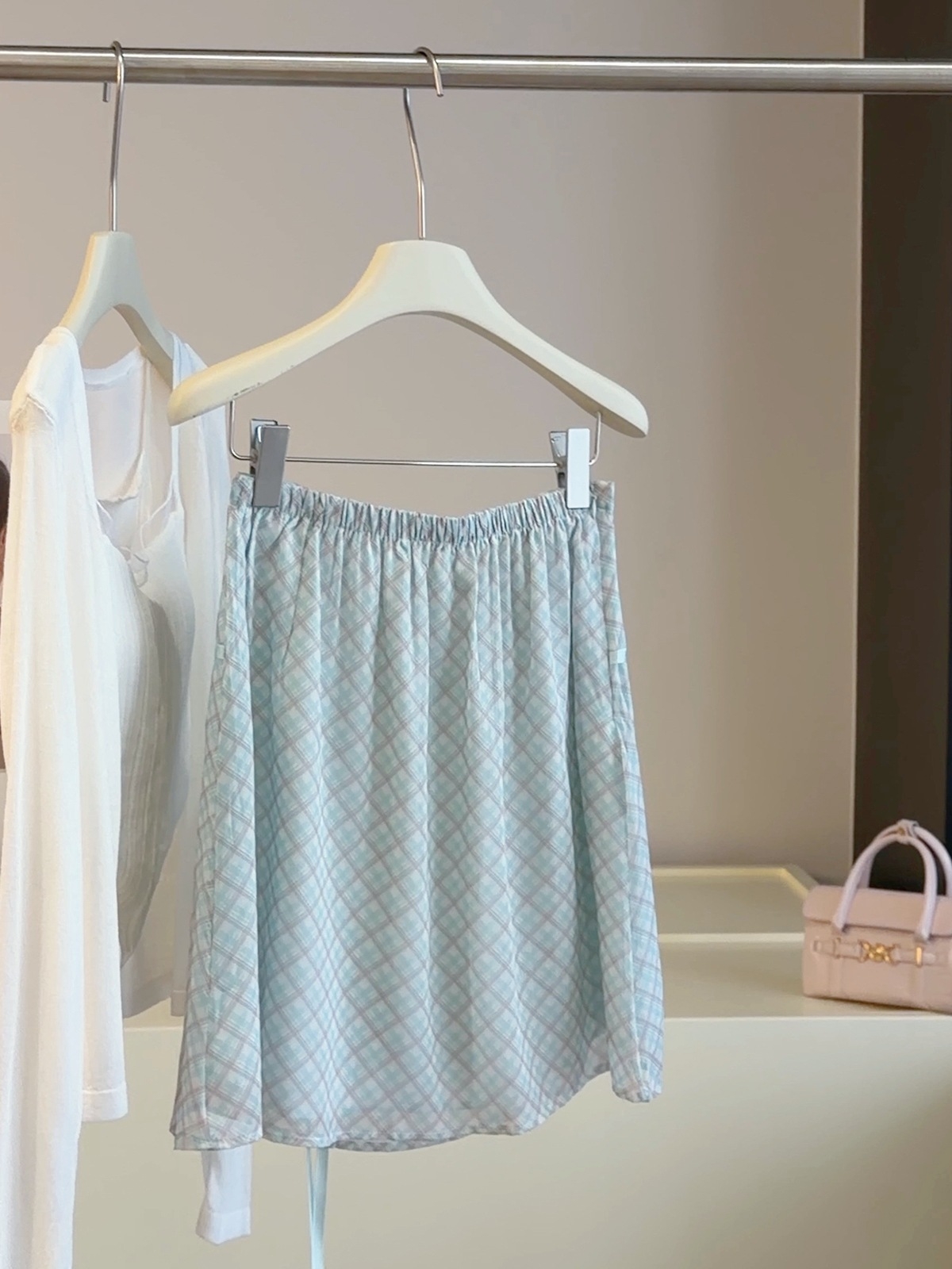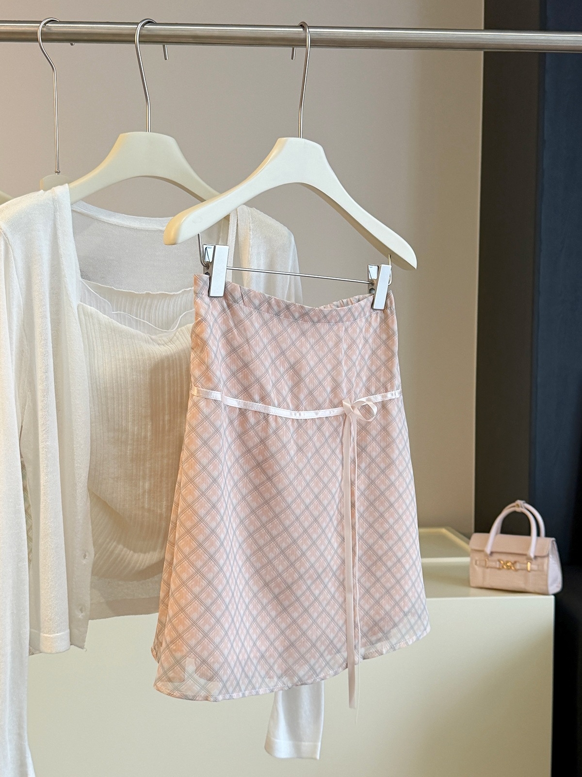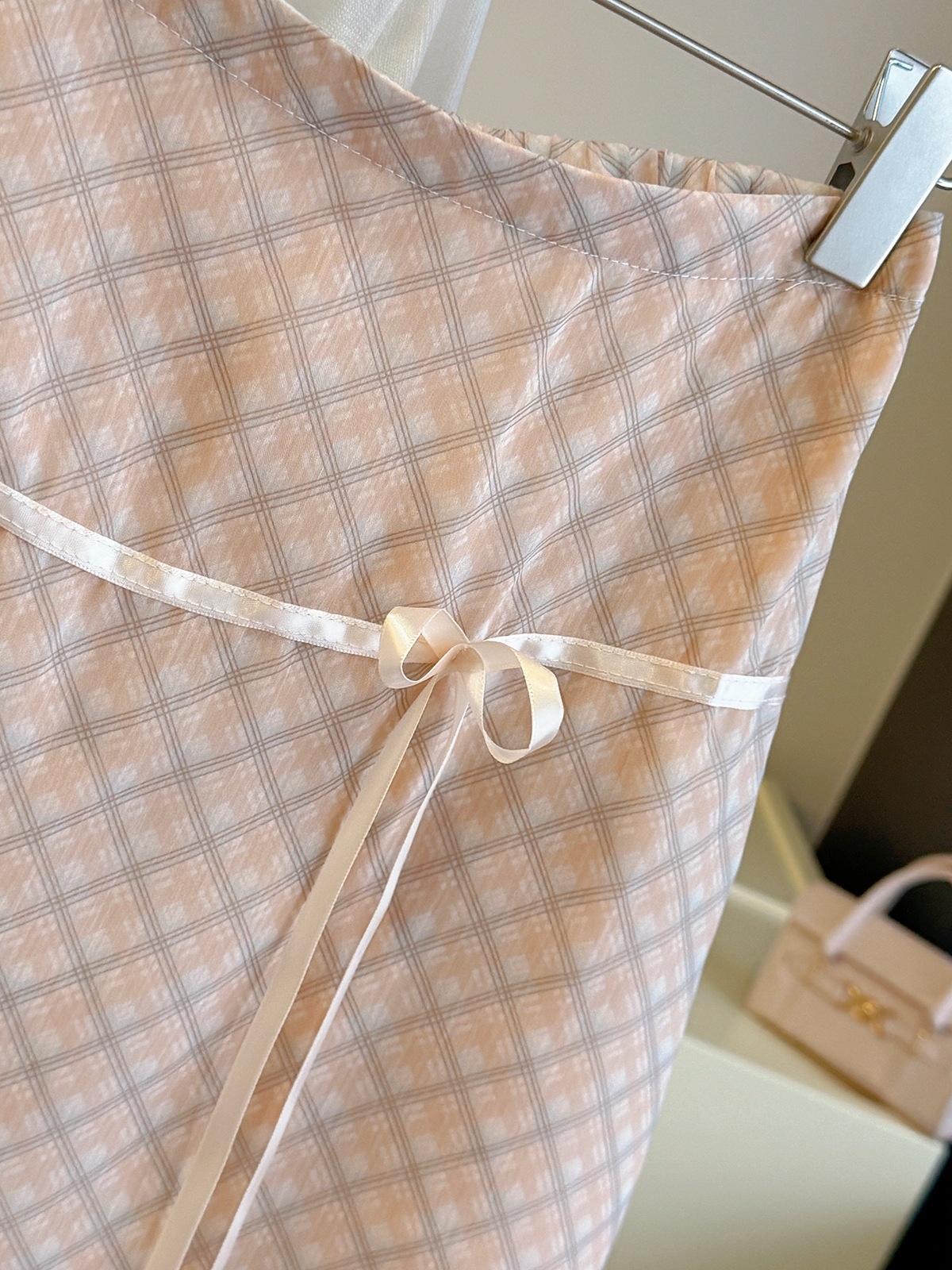 작은 청신 체크무늬 반신 스커트 여성 2026 여름 새로운 나비 넥타이 패션 배색 하이웨이스트 한 마디 중간 스커트