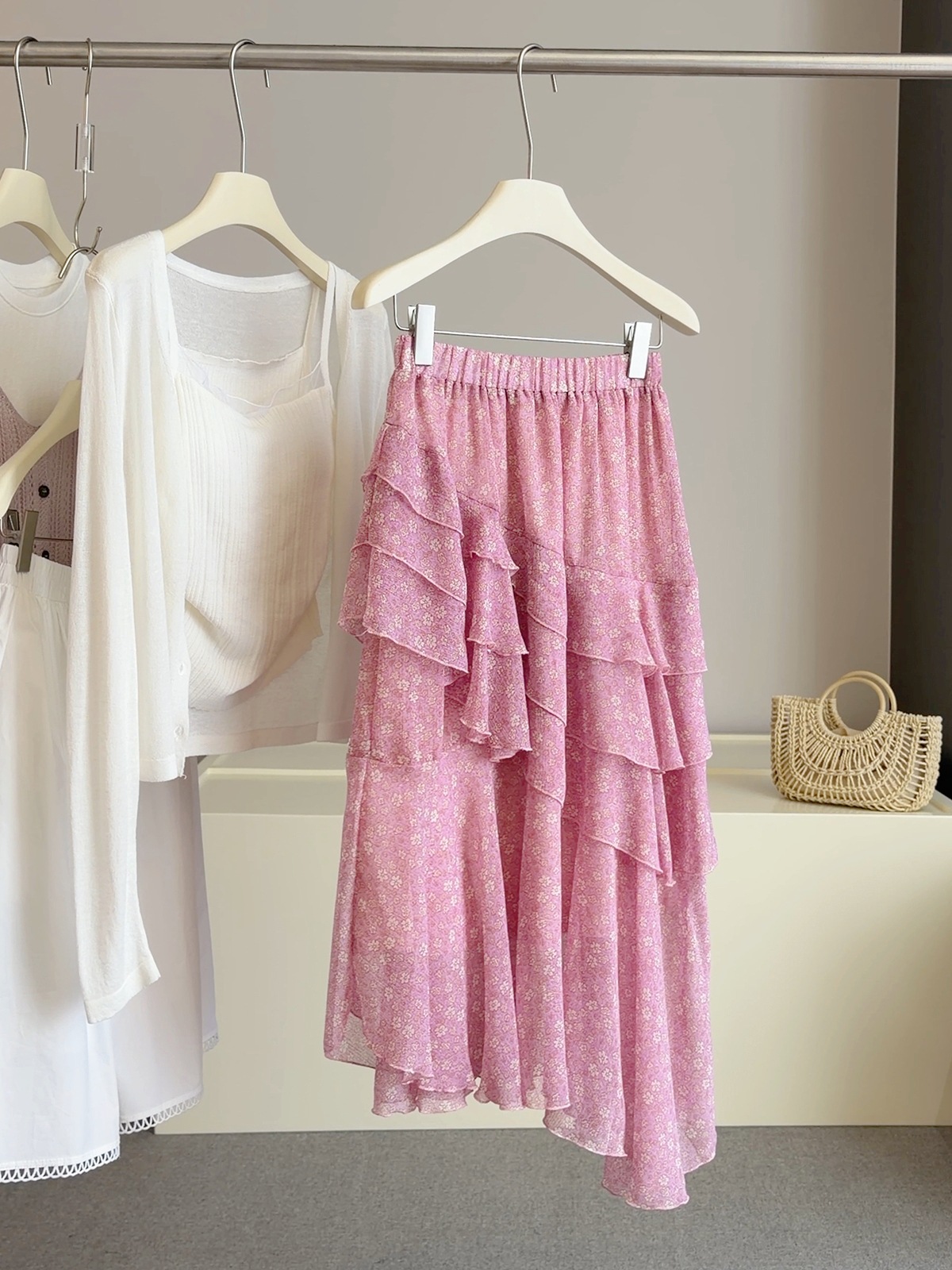 불규칙 프릴 꽃무늬 반신 스커트 여성 여름 한 부서 하이웨이스트 슬림해 보이는 한 마디 루즈핏 케이크 큰 진자 우산 치마