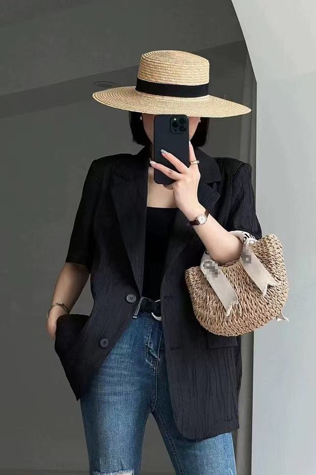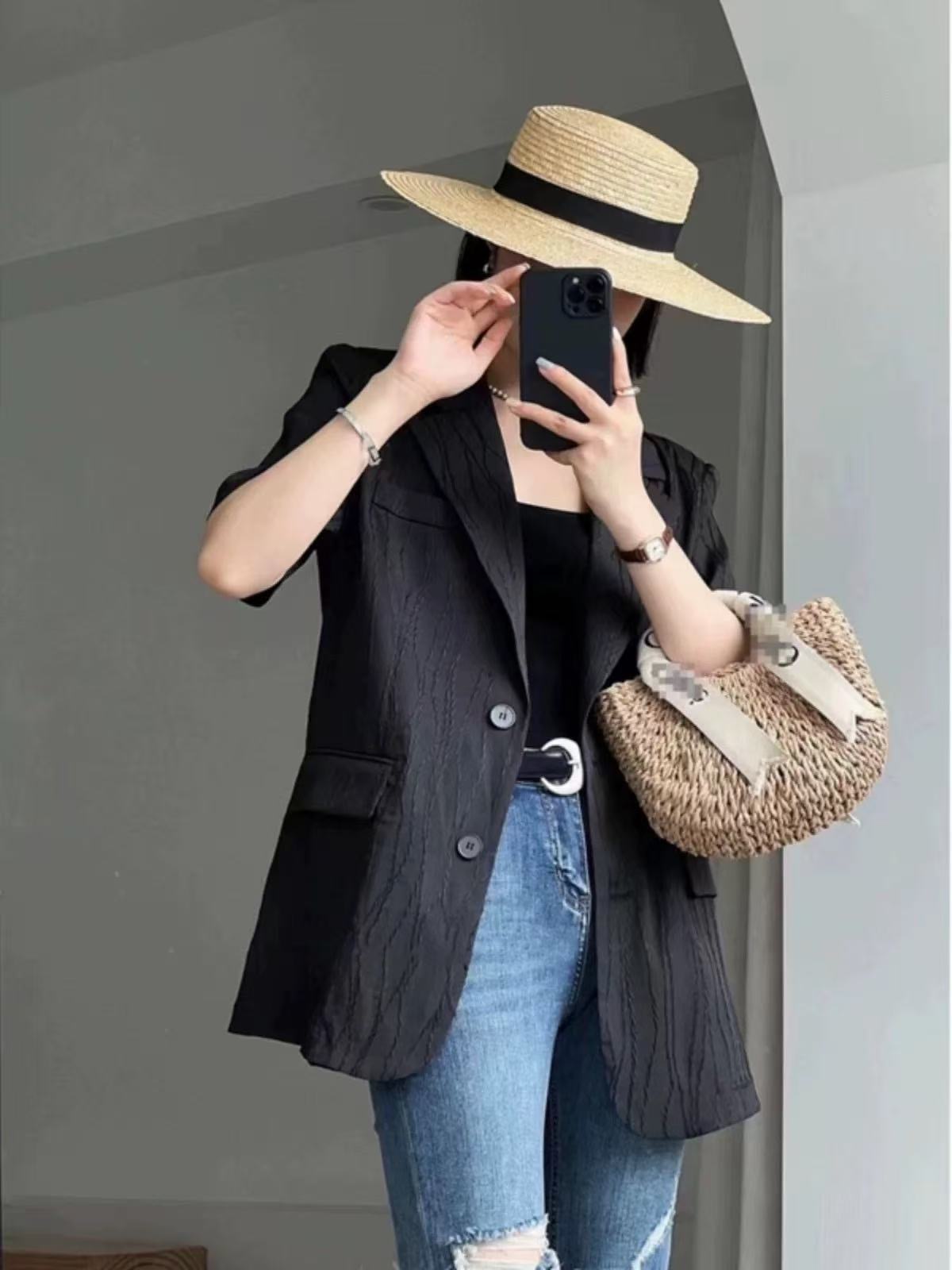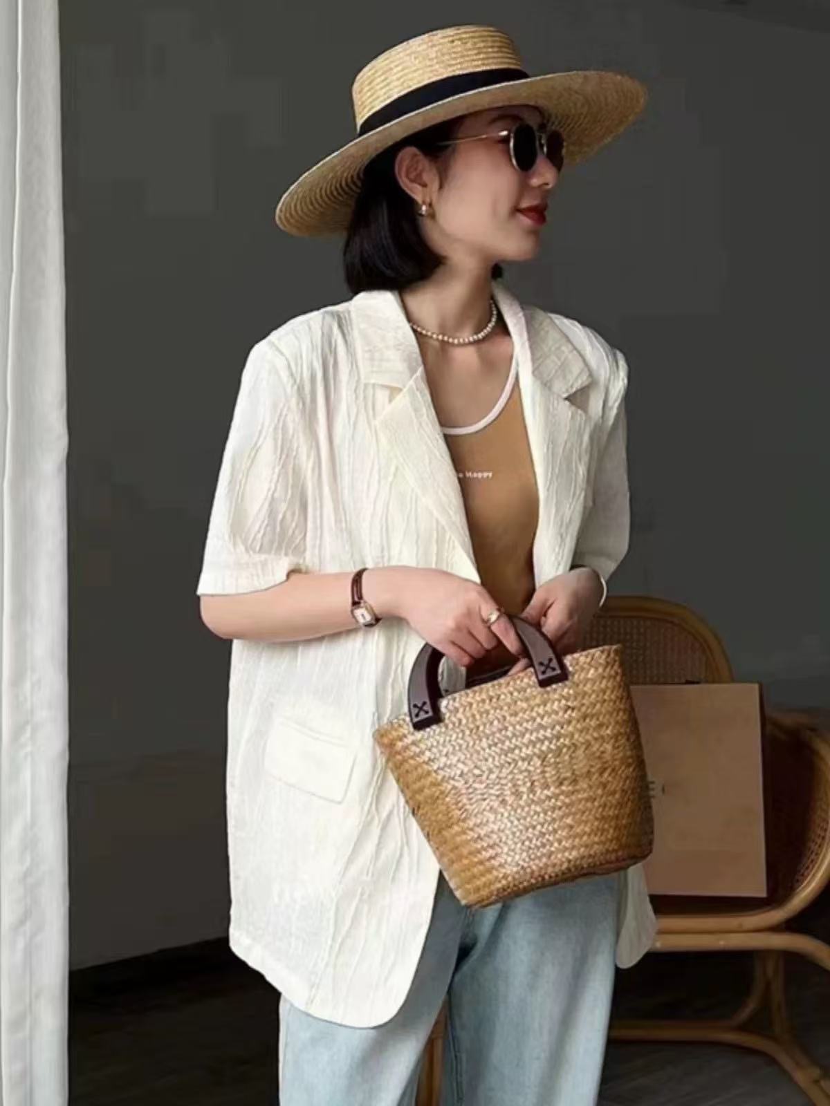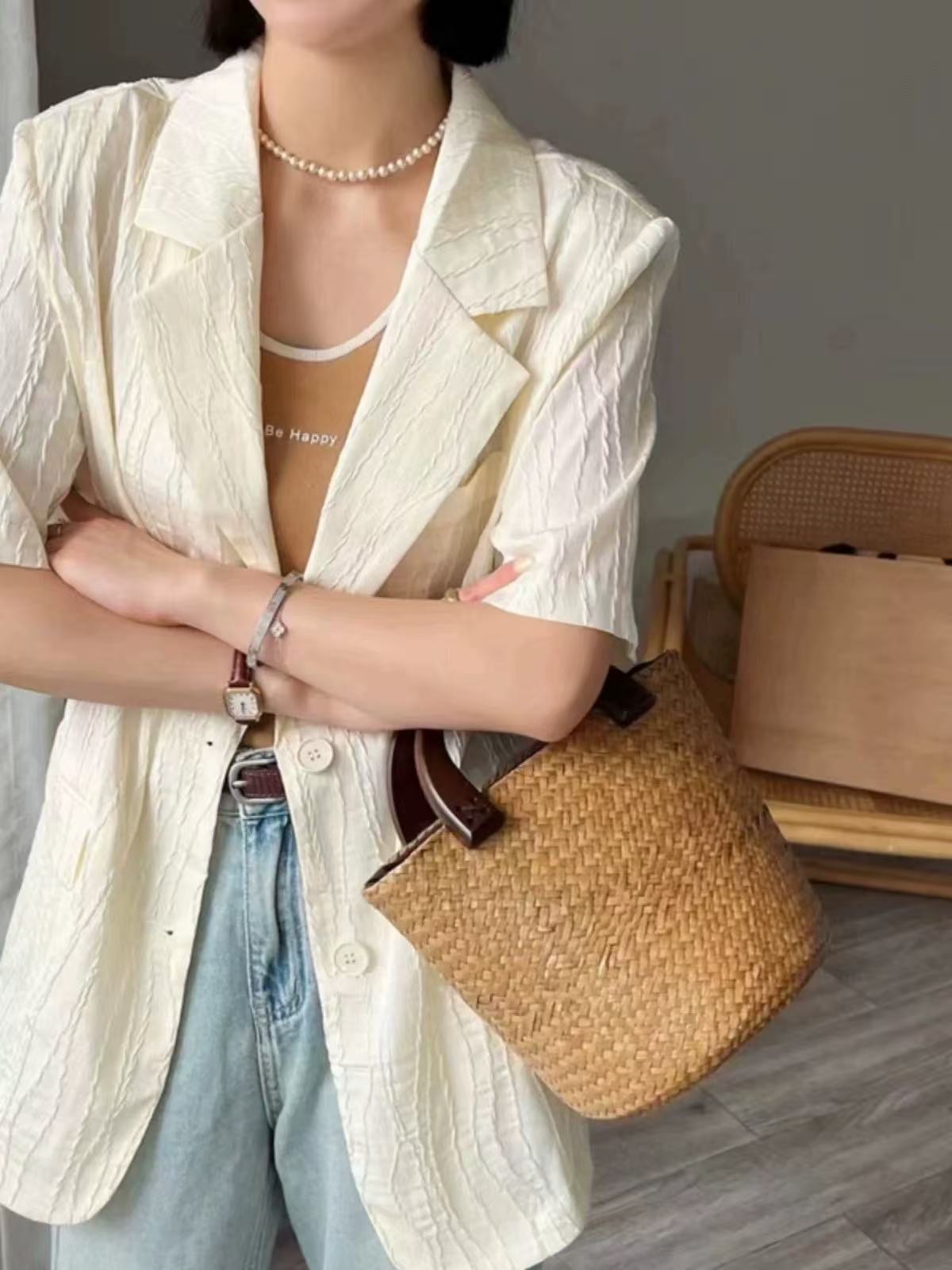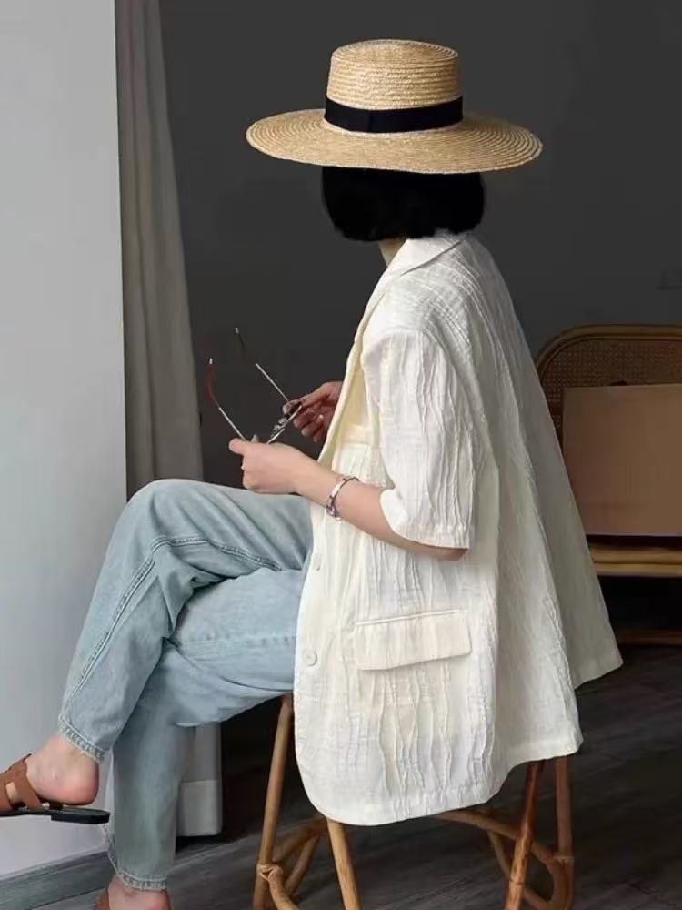 한국 스타일 새로운 질감 센스 반팔 작은 양복 여성 코트 여름 캐주얼 출퇴근 얇은 스타일 오픈 가디건 맨위