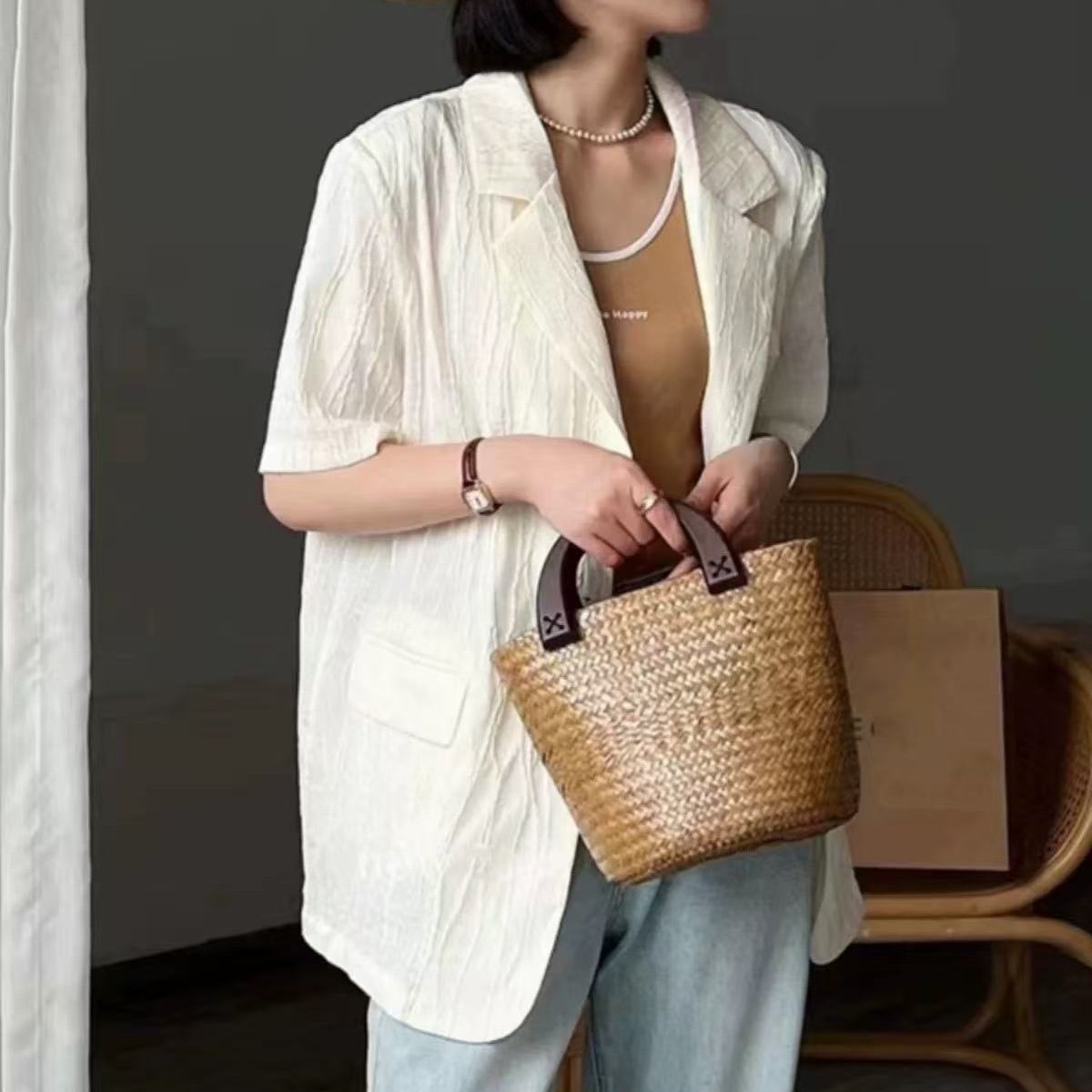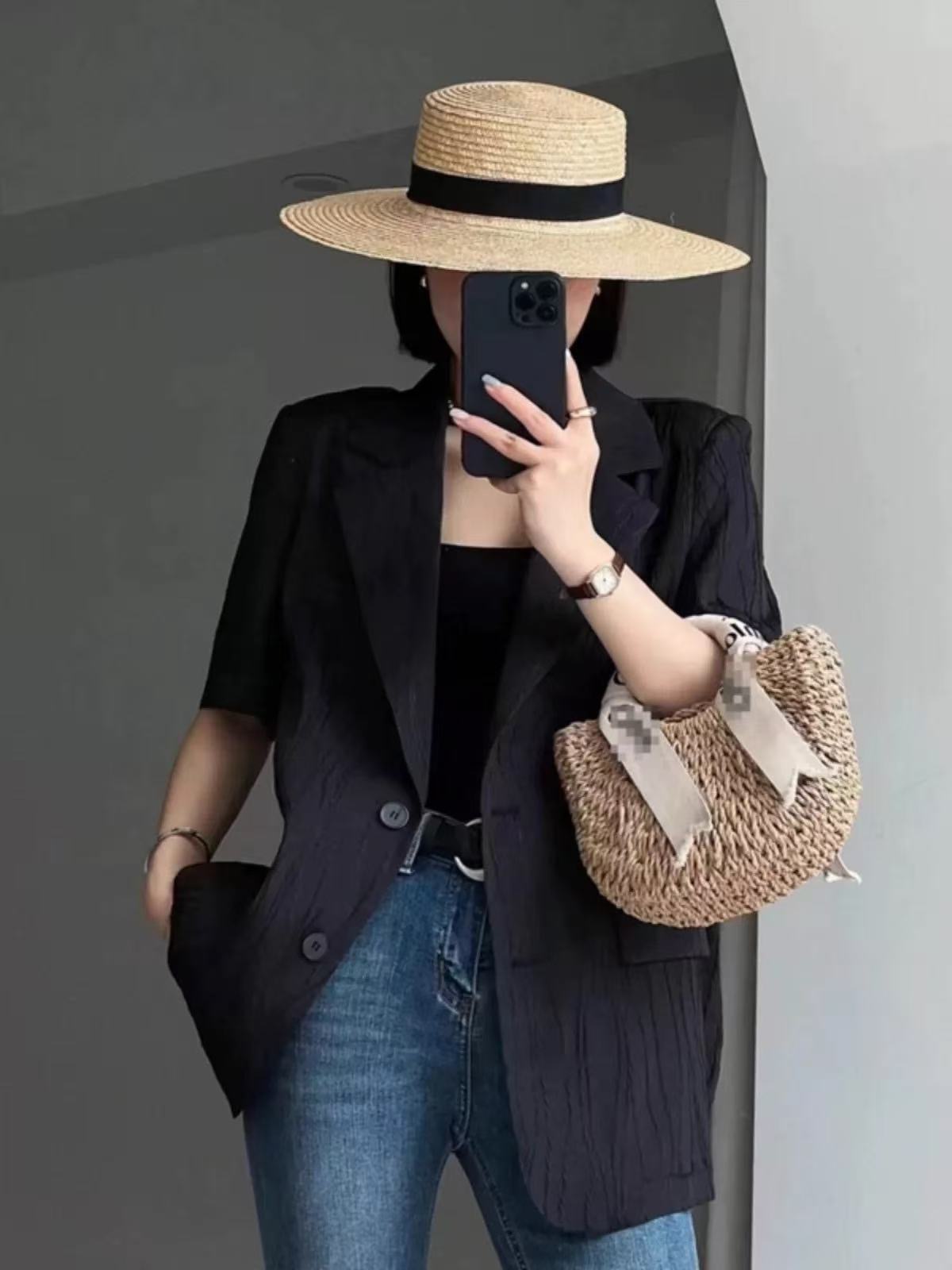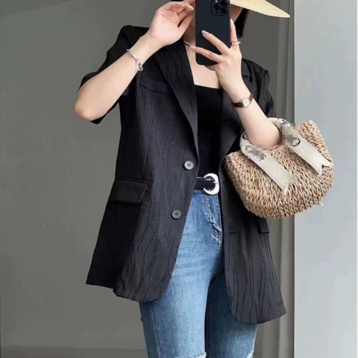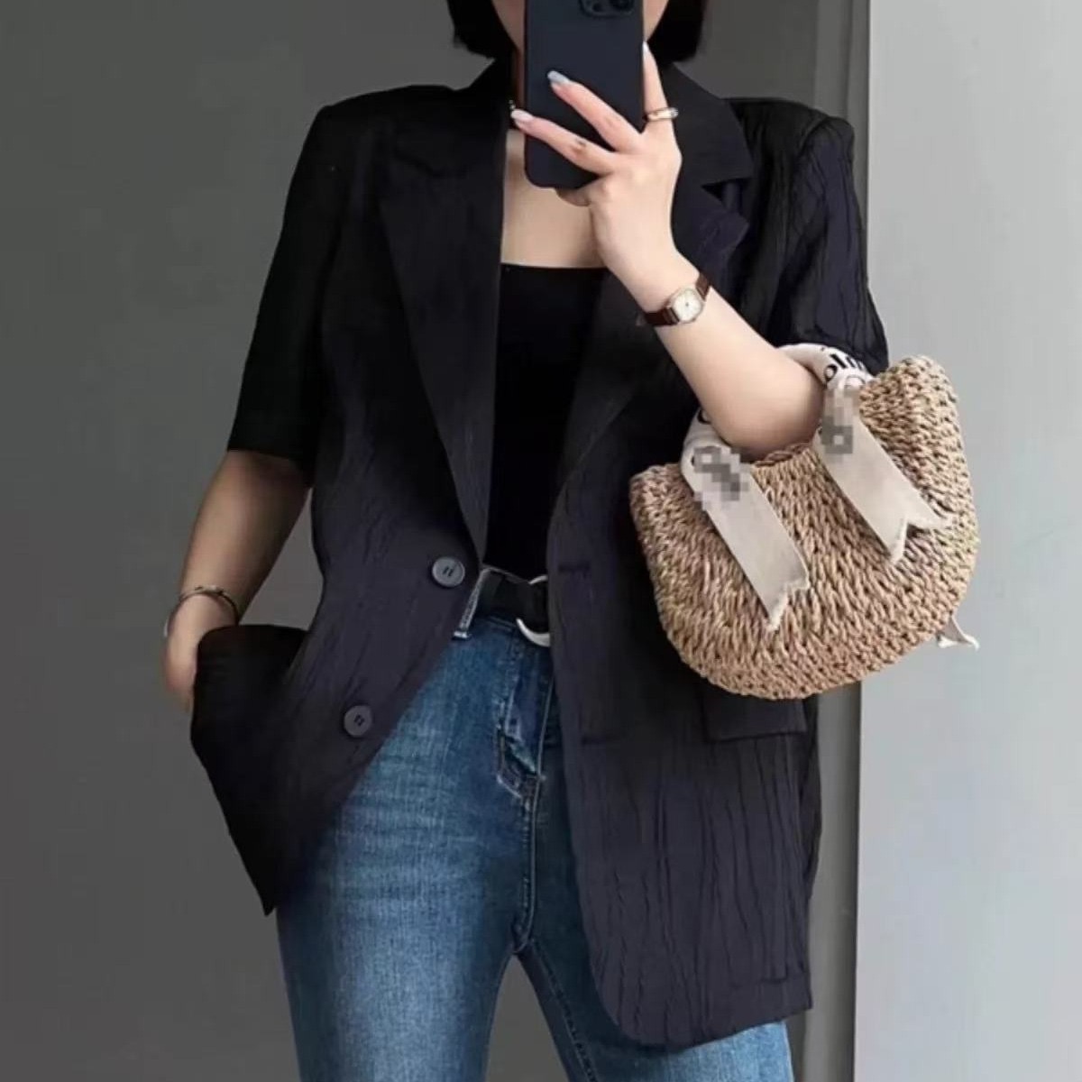 한국 스타일 새로운 질감 센스 반팔 작은 양복 여성 코트 여름 캐주얼 출퇴근 얇은 스타일 오픈 가디건 맨위