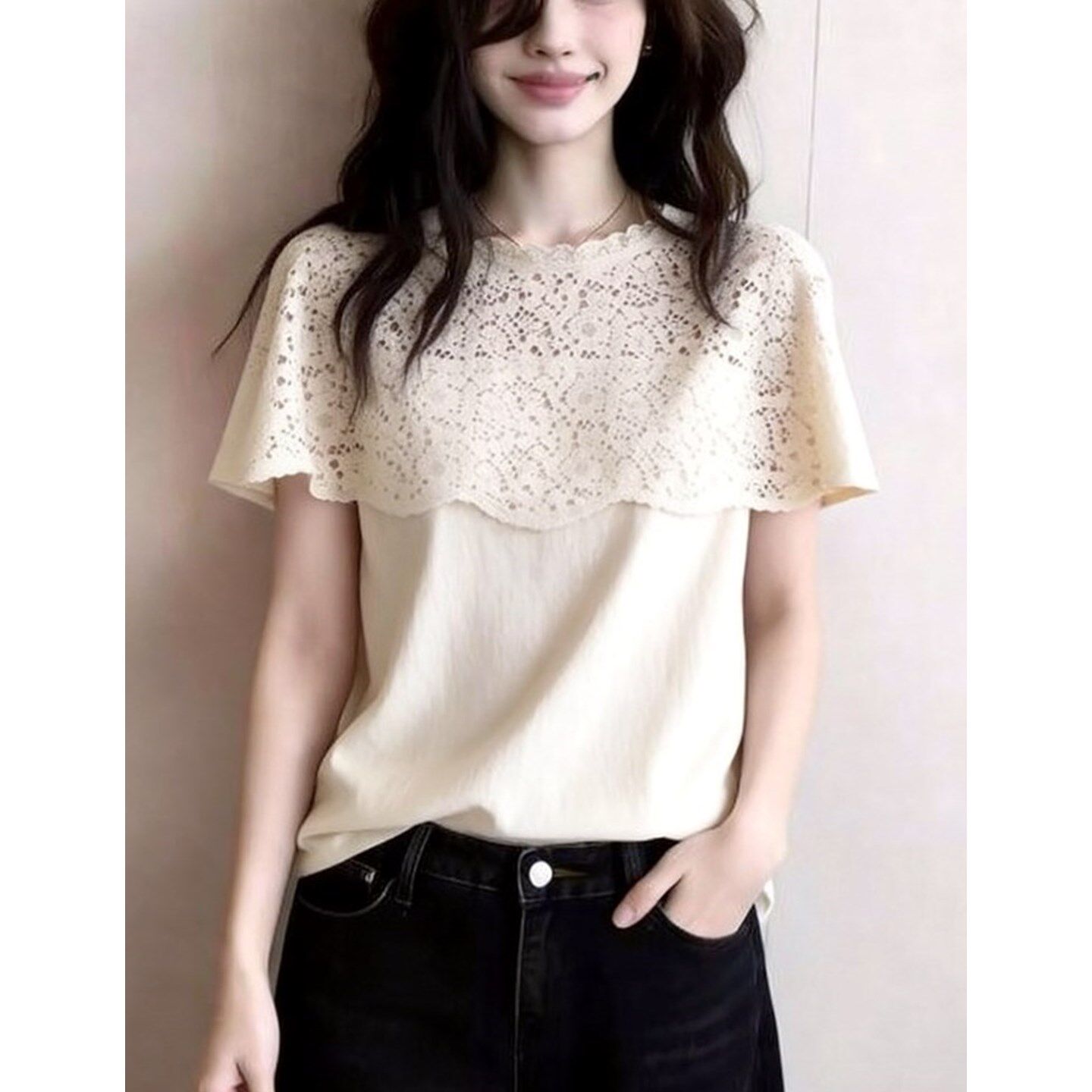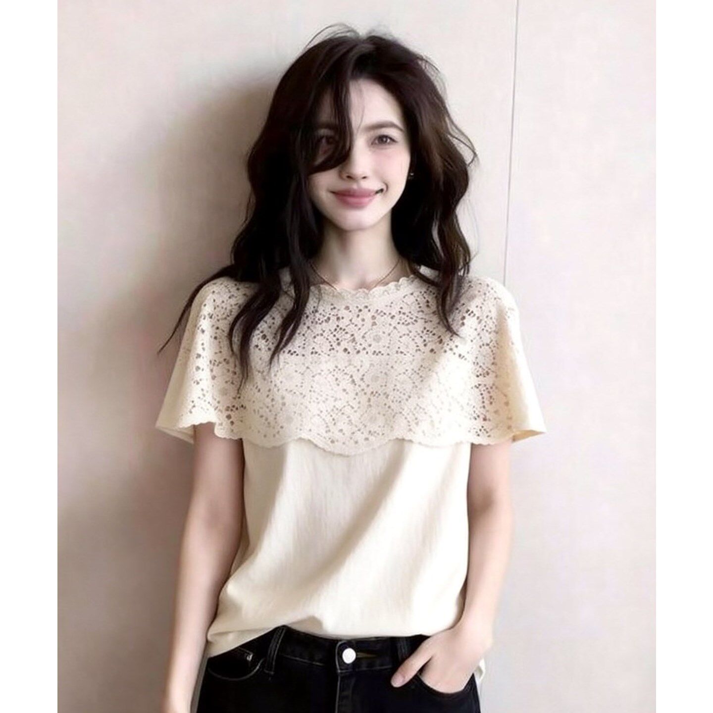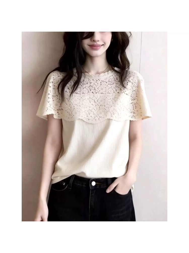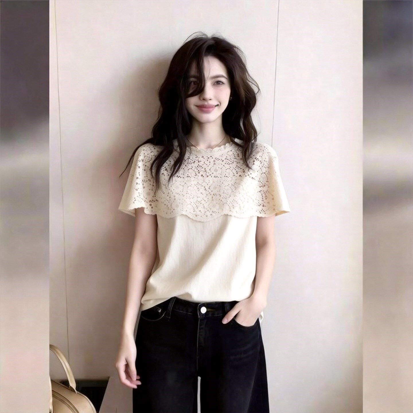 한 부서 디자인 센스 작은 대중 레이스 측면 긍정적 인 어깨 반팔 티셔츠 2026 새로운 여름 슈퍼 화재 연령 감소 화이트 맨위