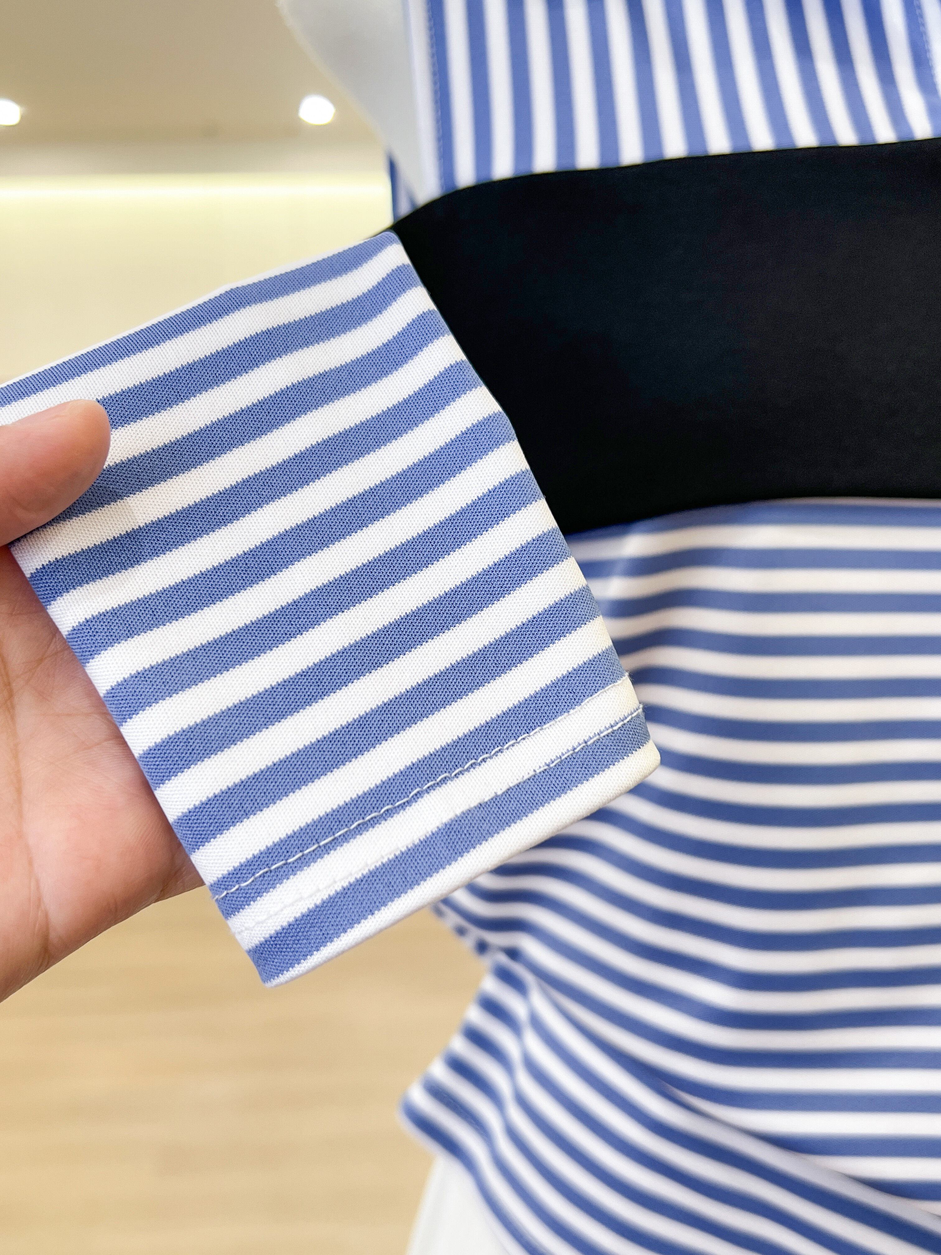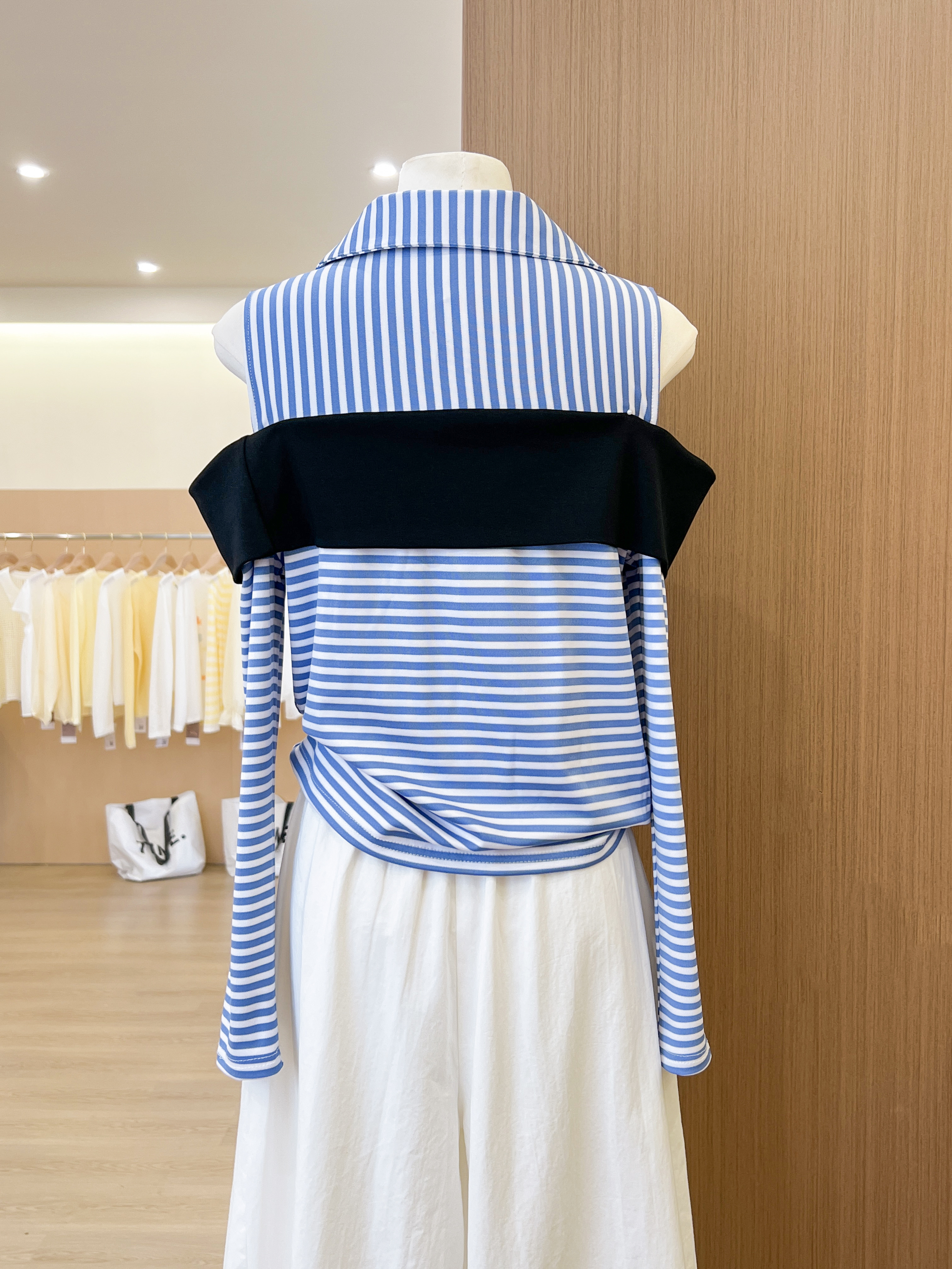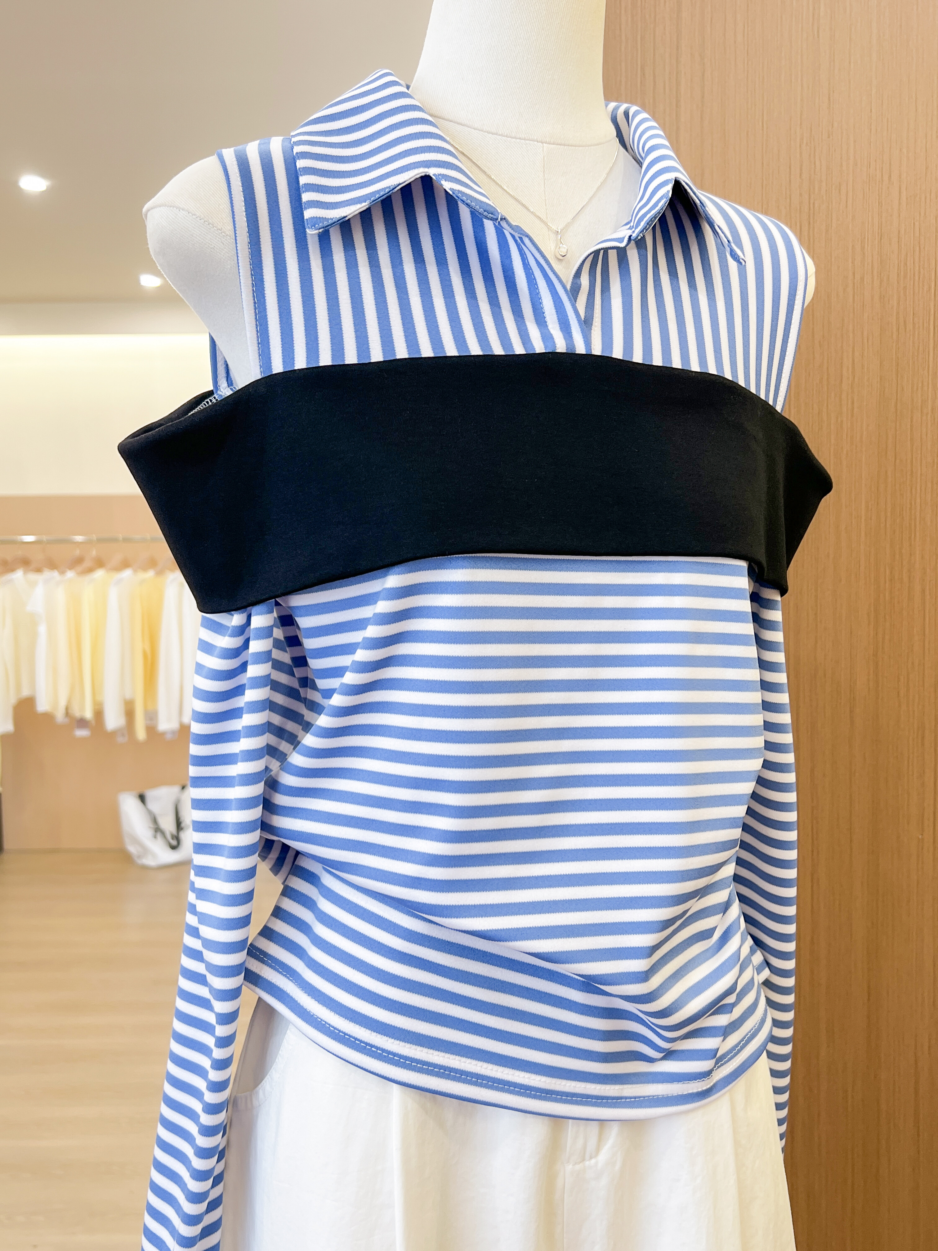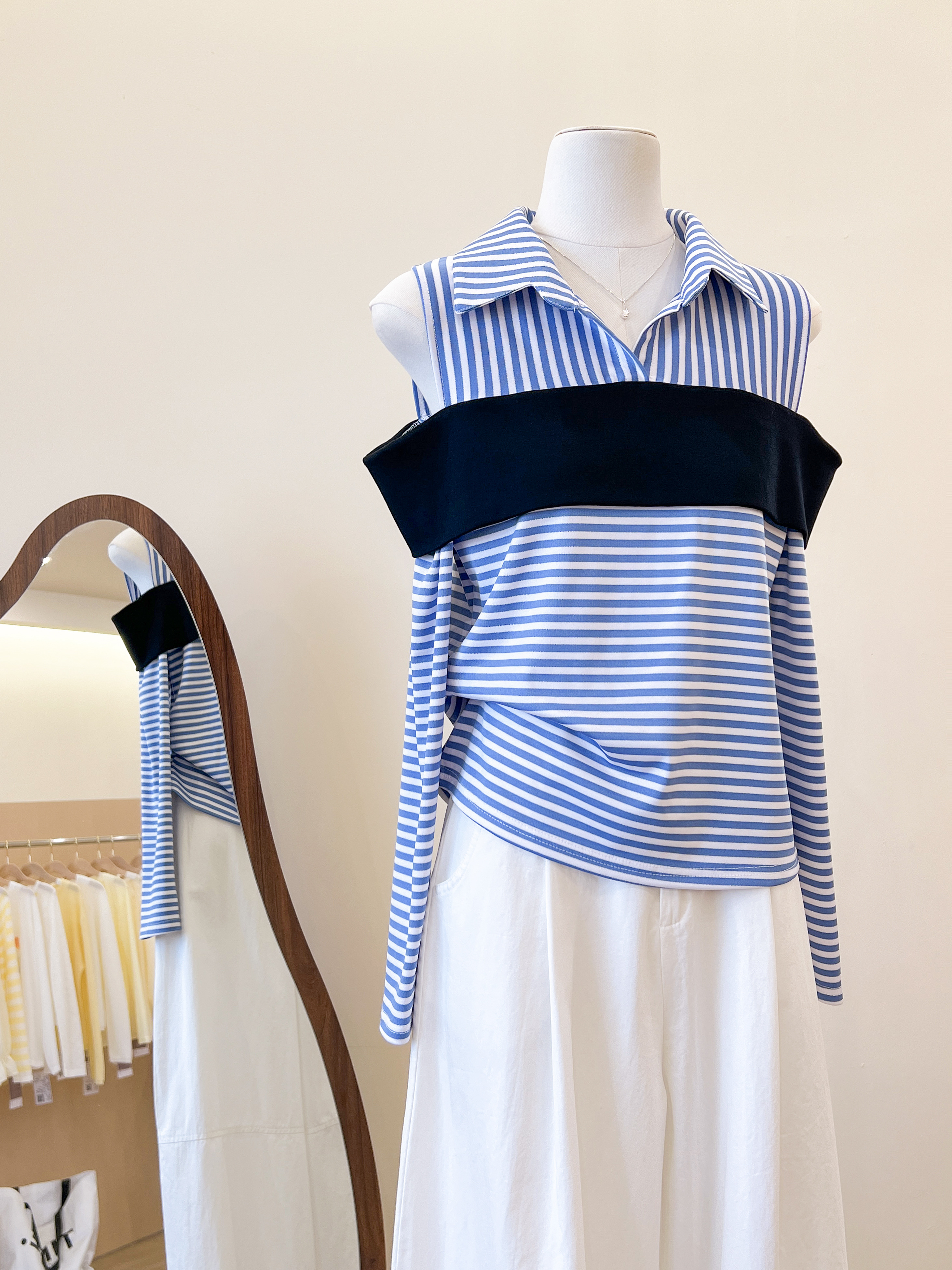 실사 파란색 스트라이프 고유 한 아름다운 POLO 칼라 작은 셔츠 페이크 레이어드 긴팔 티셔츠 여성 의류 홀로우 아웃 맨위