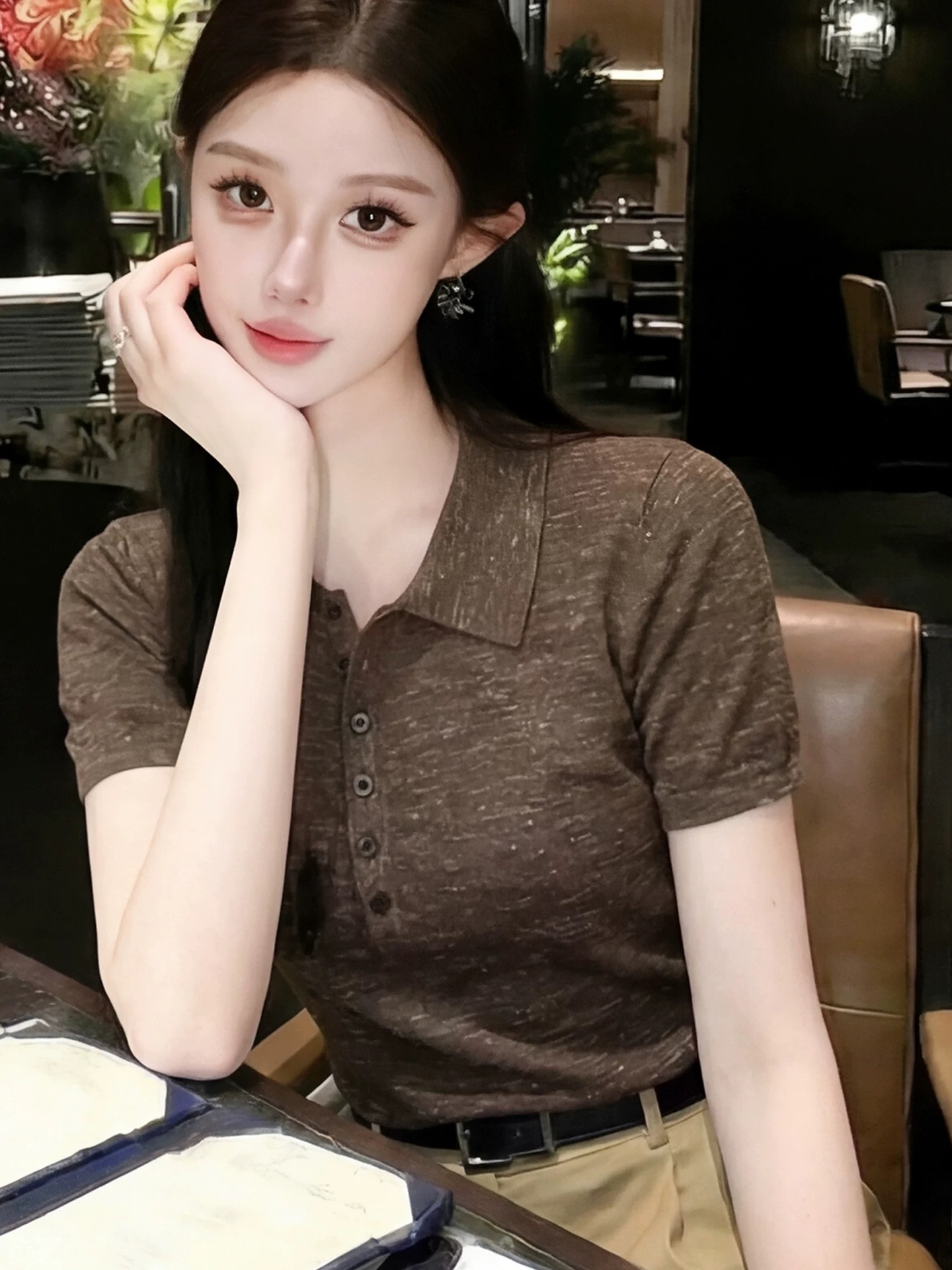 레트로 작은 대중 공정한 섬 니트 반팔 티셔츠 여성 여름 섹션 긍정적 인 어깨 몸매 가꾸기 얼음 실크 작은 키 쇼트 스타일 맨위