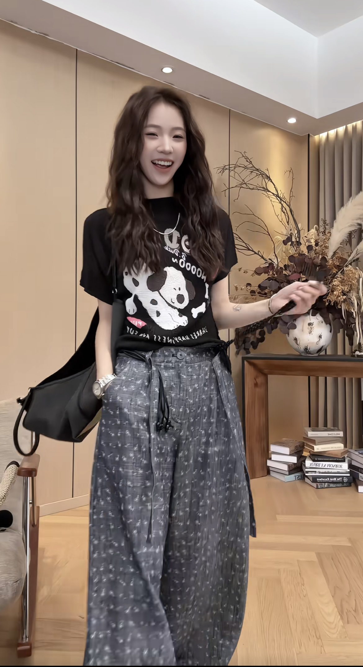 wu11 오리지널 다용도 라운드 넥 루즈핏 반팔 티셔츠 허리 인감 높은 허리 바지 패션 3종 세트