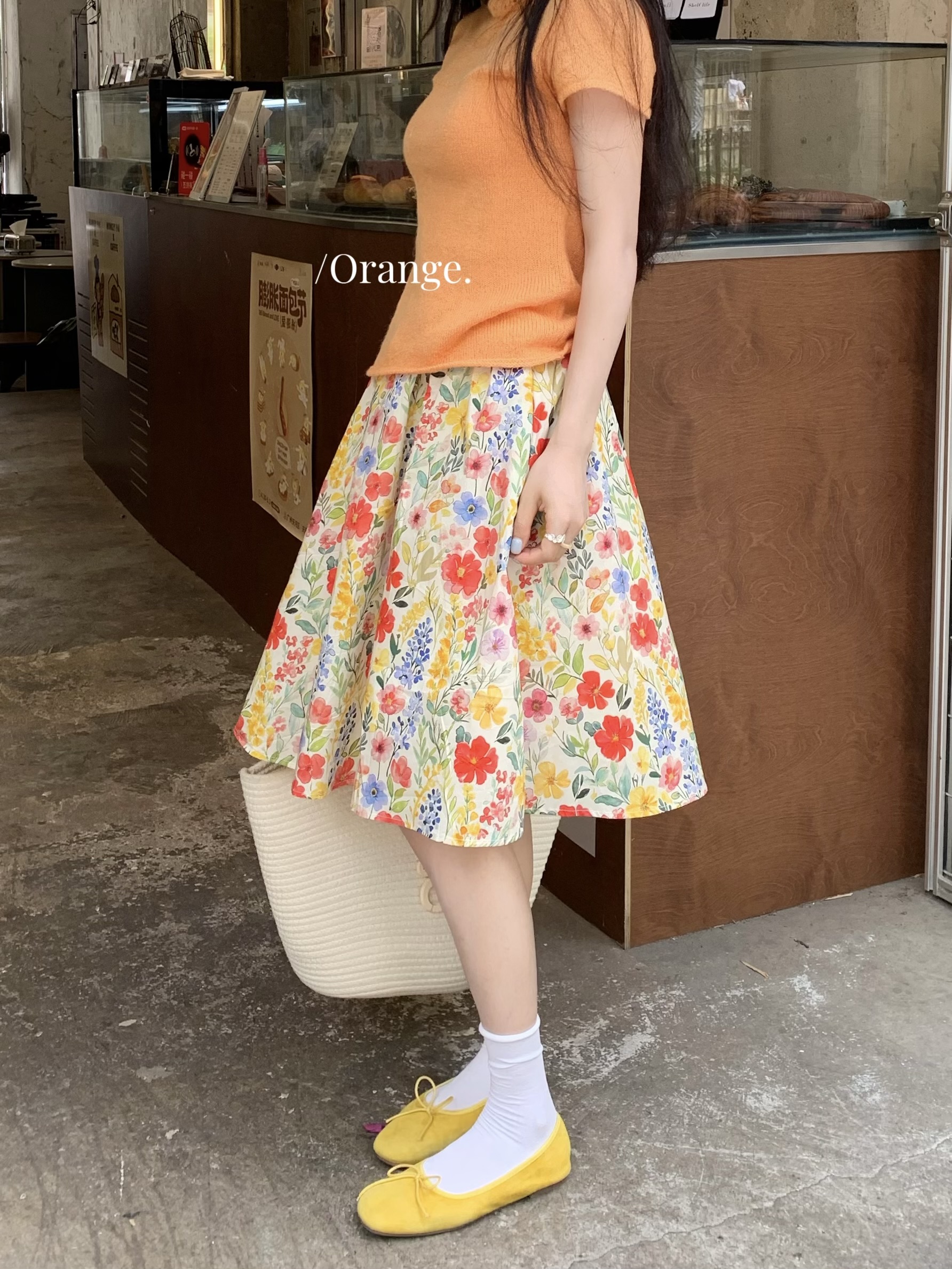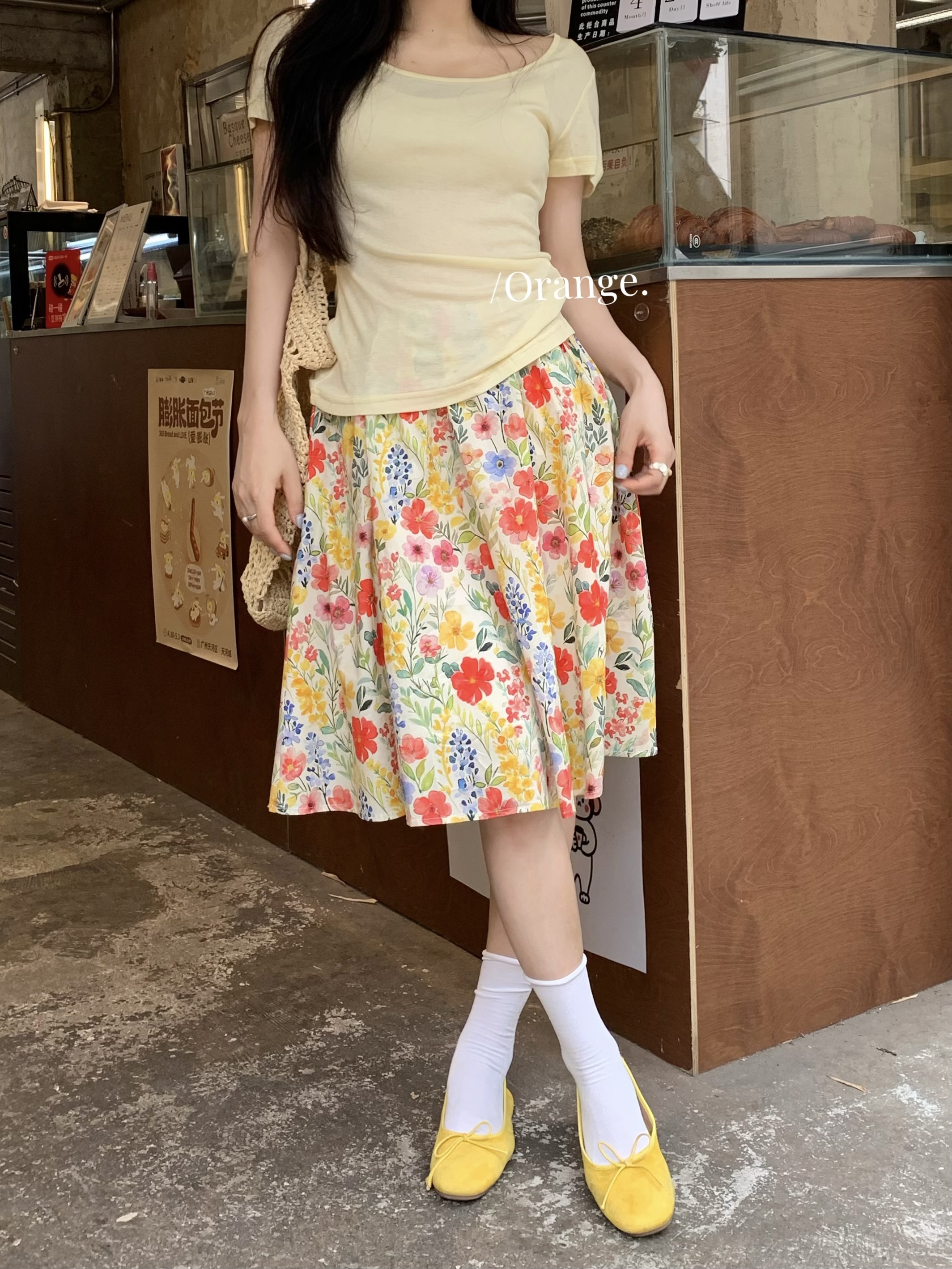 실사 정가 다채로운 황색 꽃무늬 루즈핏 반신 스커트 중간 길이 스커트