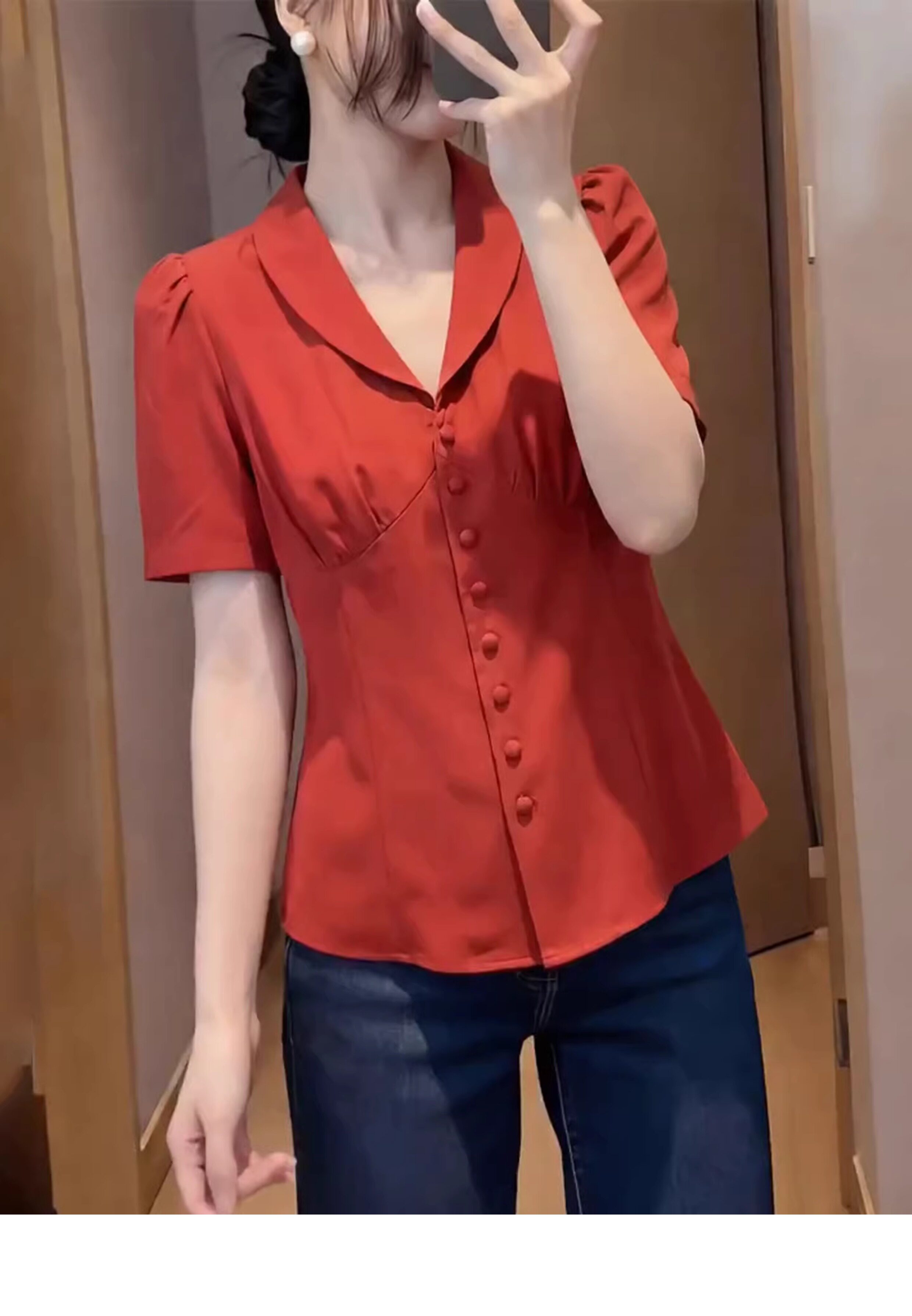 프랑스식 빛 요리 한 미니멀리즘 바람 녹색 V넥 반팔 여성 셔츠 여름 이중 버튼 허리 수축 고급 센스 다용도 맨위