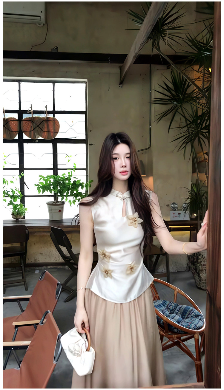 26 여름 새로운 중식 고급 디자인 센스 서있는 조끼 꽃 허리 수축 맨위 여성 코디 미니멀리즘 반신 치마 세트