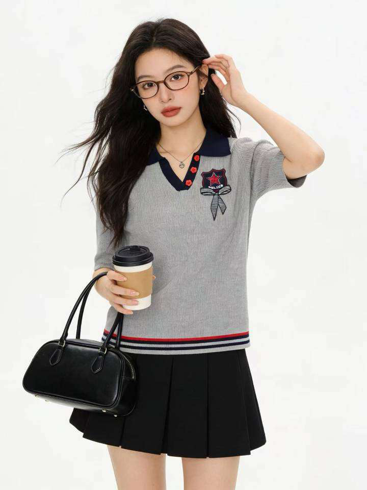 2026 새로운 학원 스타일 폴로 칼라 수건 개 자카드 알파벳 두 장 니트 스웨터 반팔 맨위 티셔츠 여성