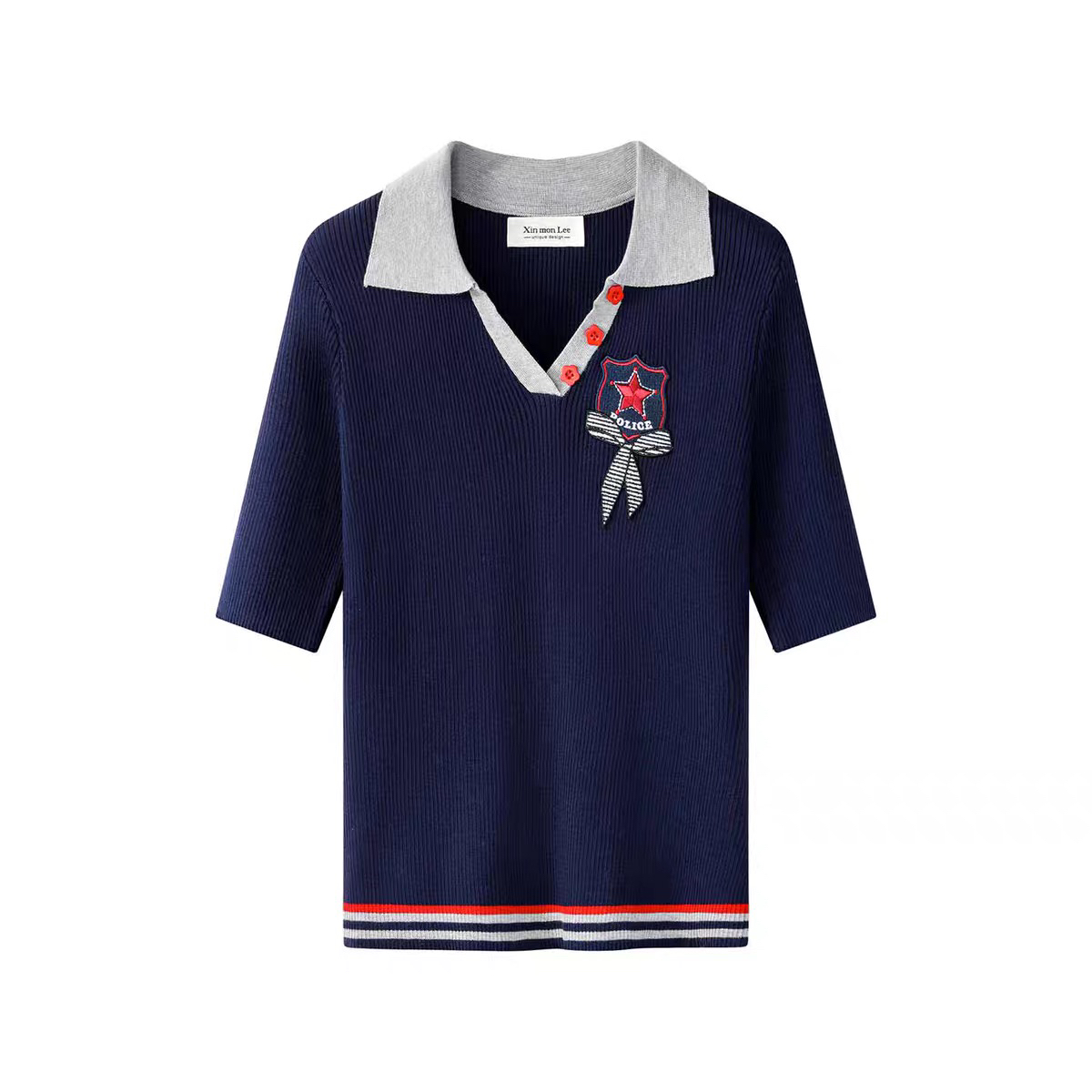 폴로 칼라 배색 얼음 실크 니트 반팔 여성 여름 새로운 V넥 단추 풀오버 티셔츠 품격 맨위