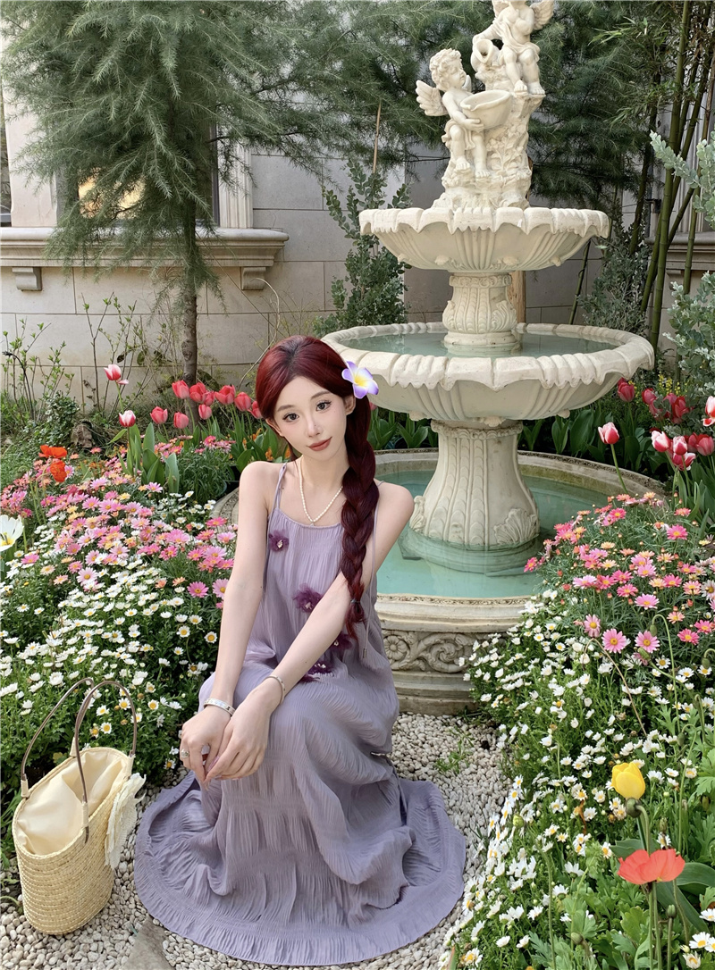 원본 원단 네리 보라색 행침 목 백리스 슬립 꽃무늬 중간 길이 맨위 여름 해변가 휴가