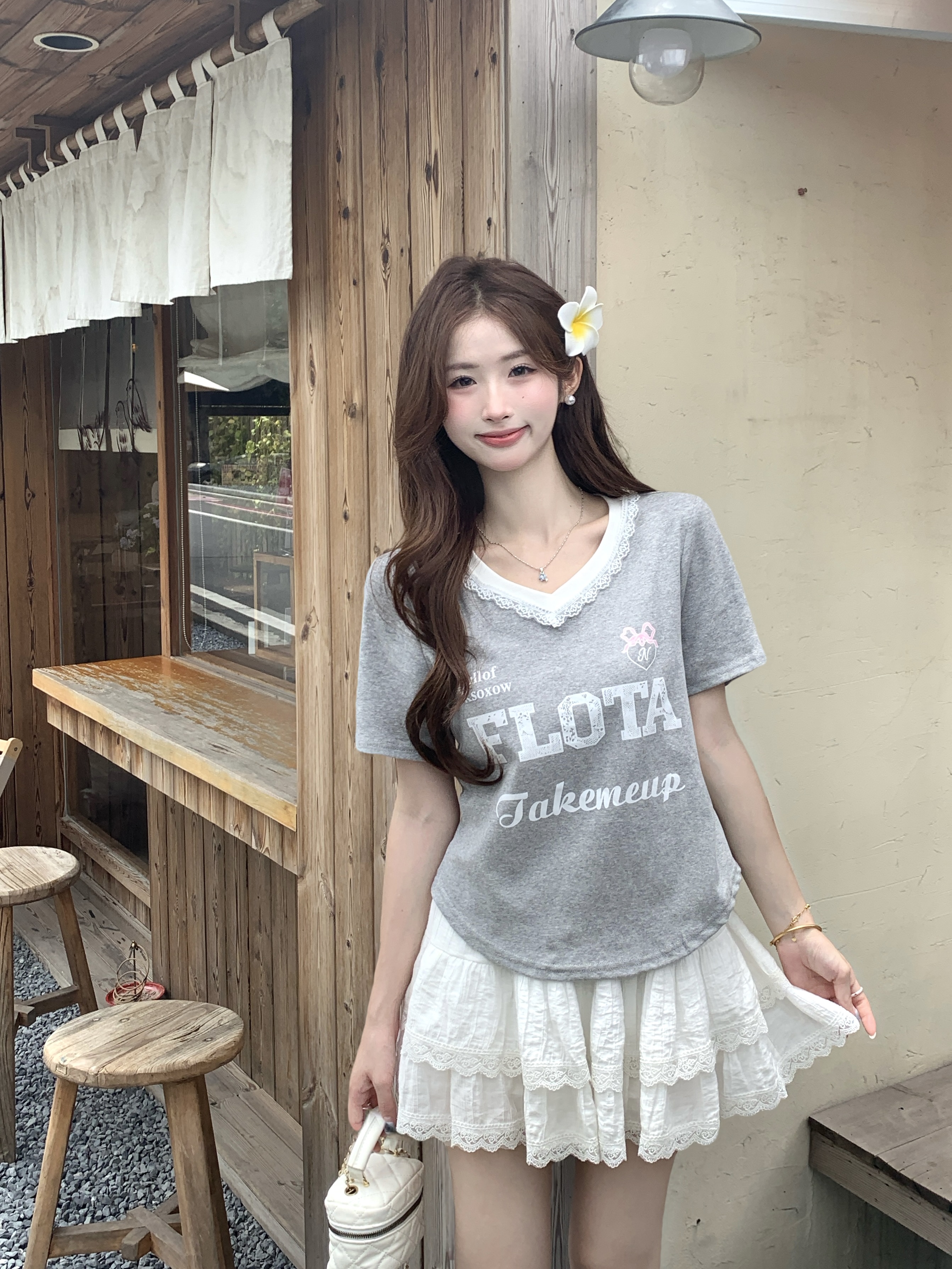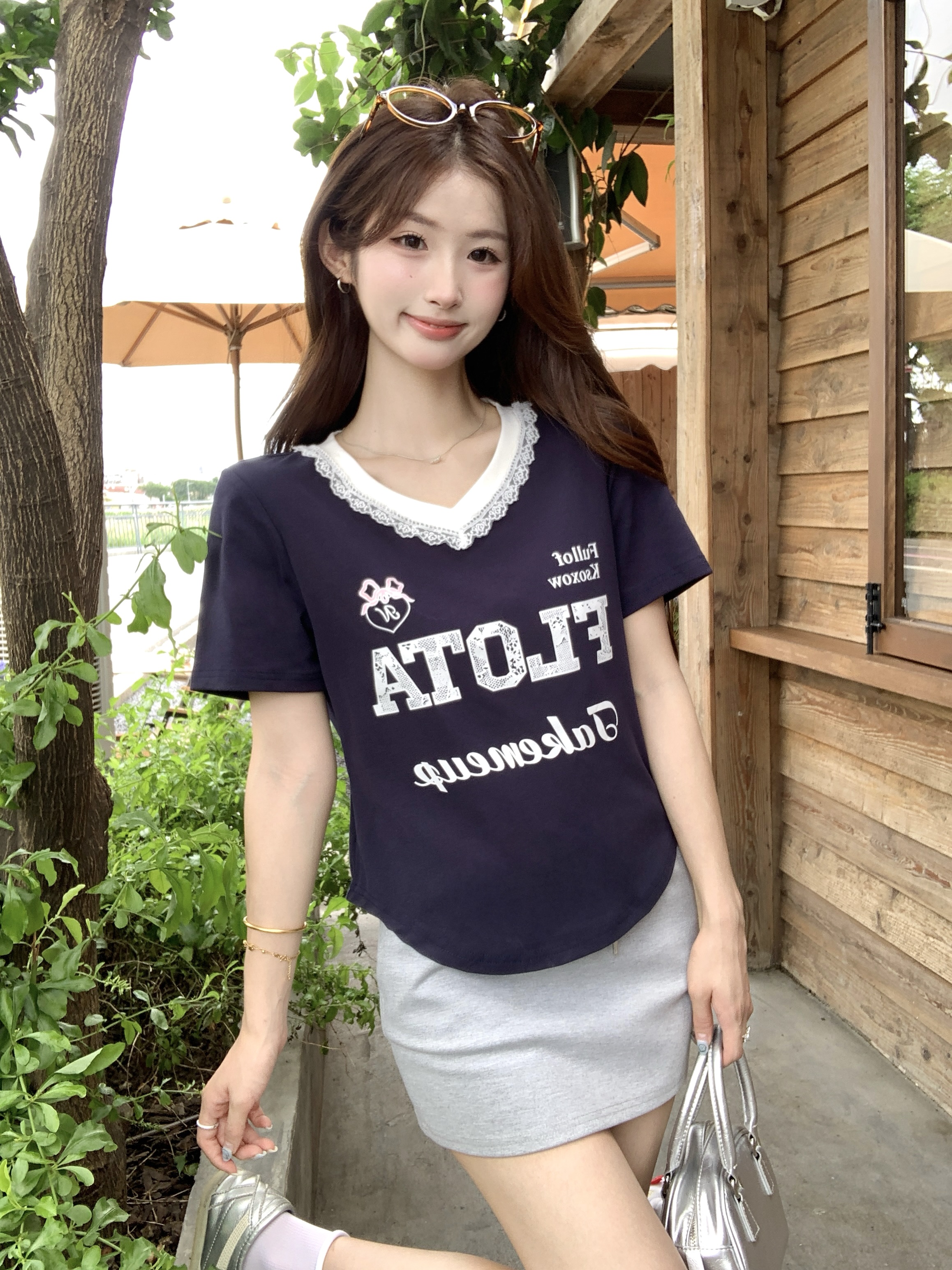 실사 2026 여름 새로운 지방 mm 빅 사이즈 달콤한 매운맛 알파벳 레이스 V넥 반팔 티셔츠 작은 키 몸매 가꾸기 맨위