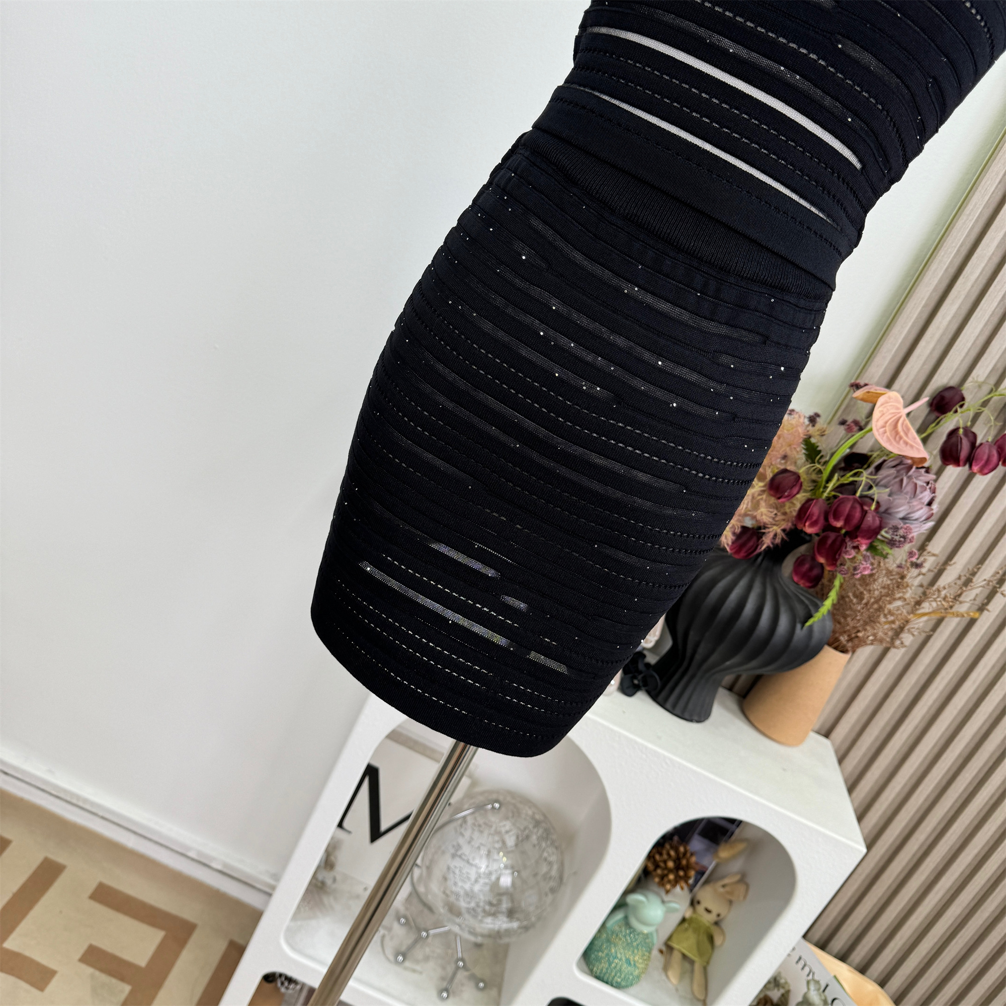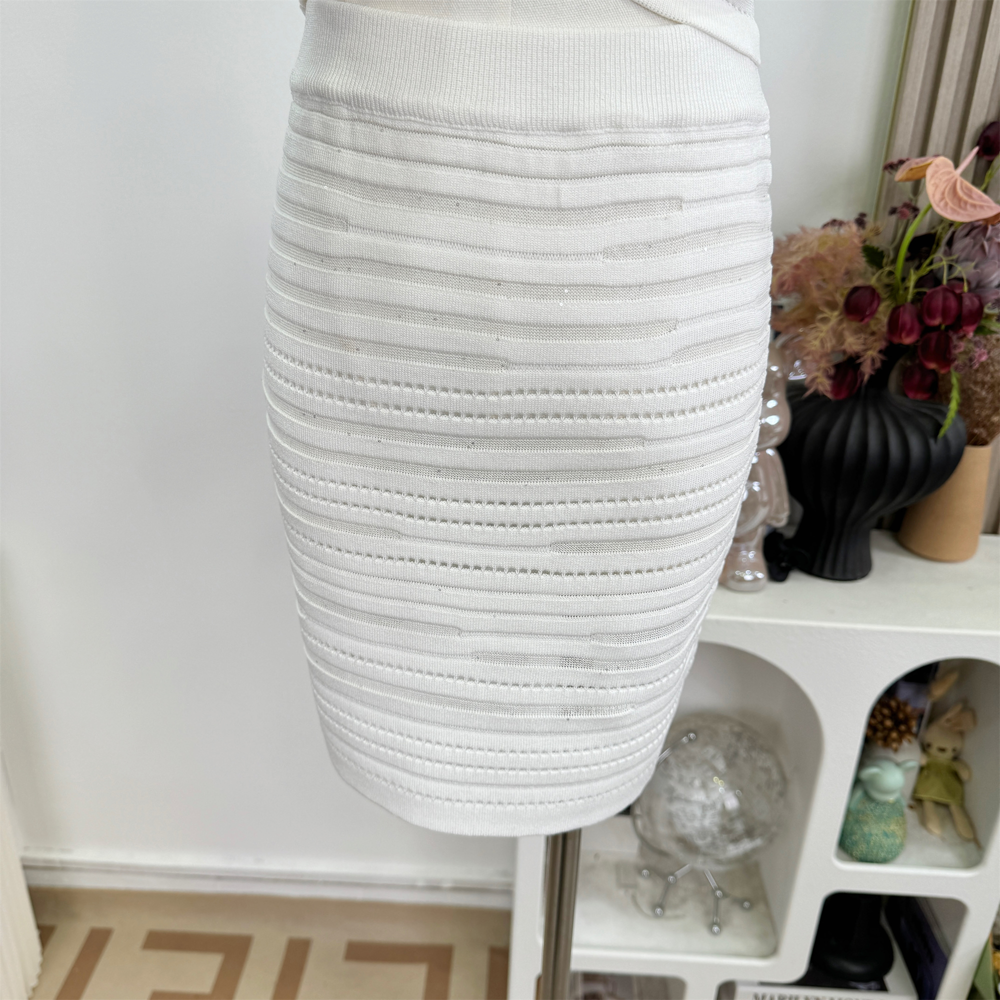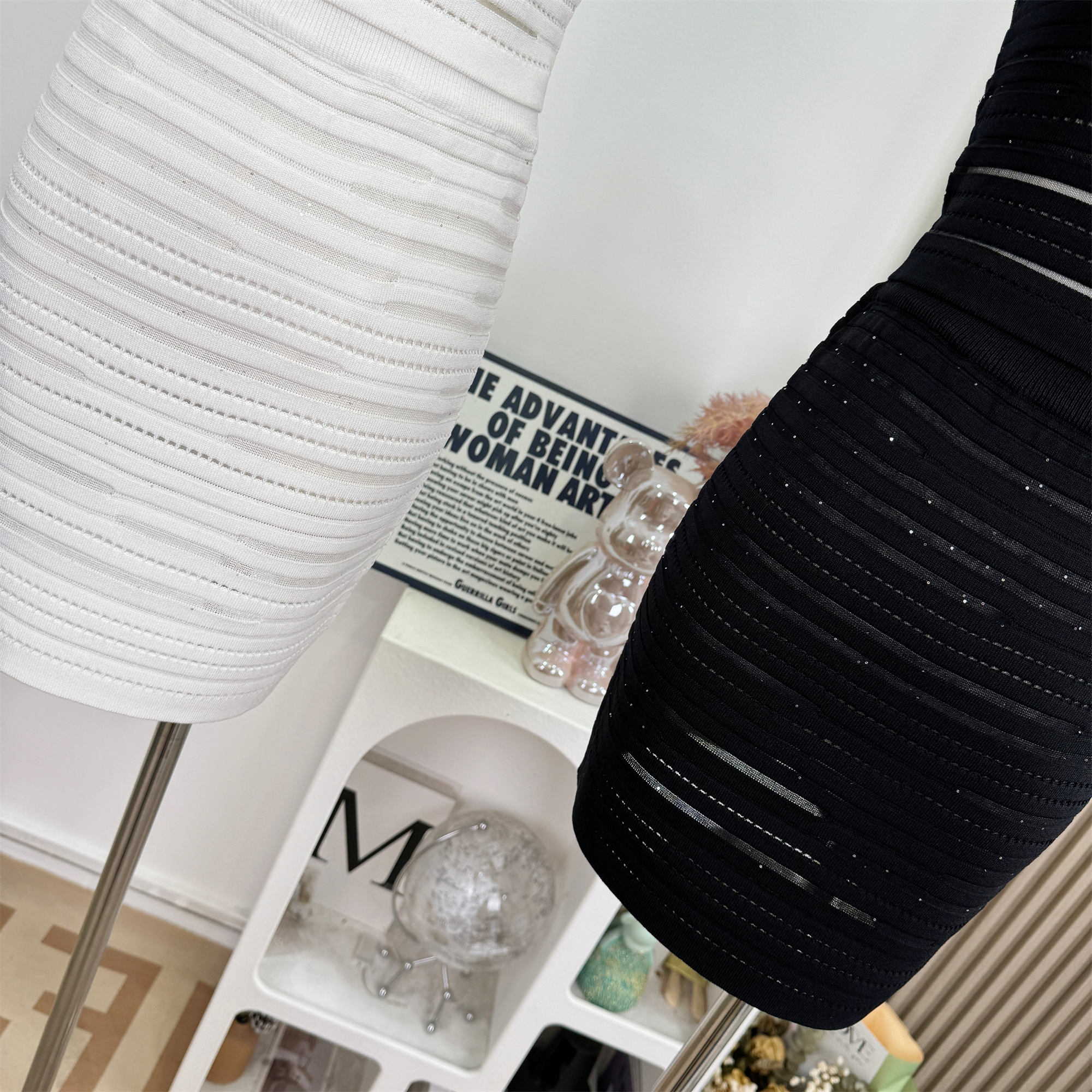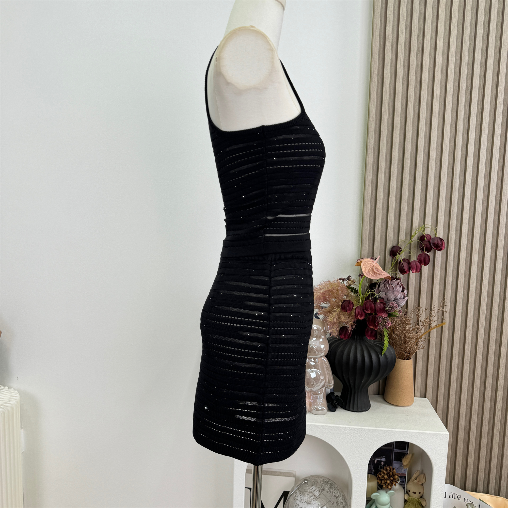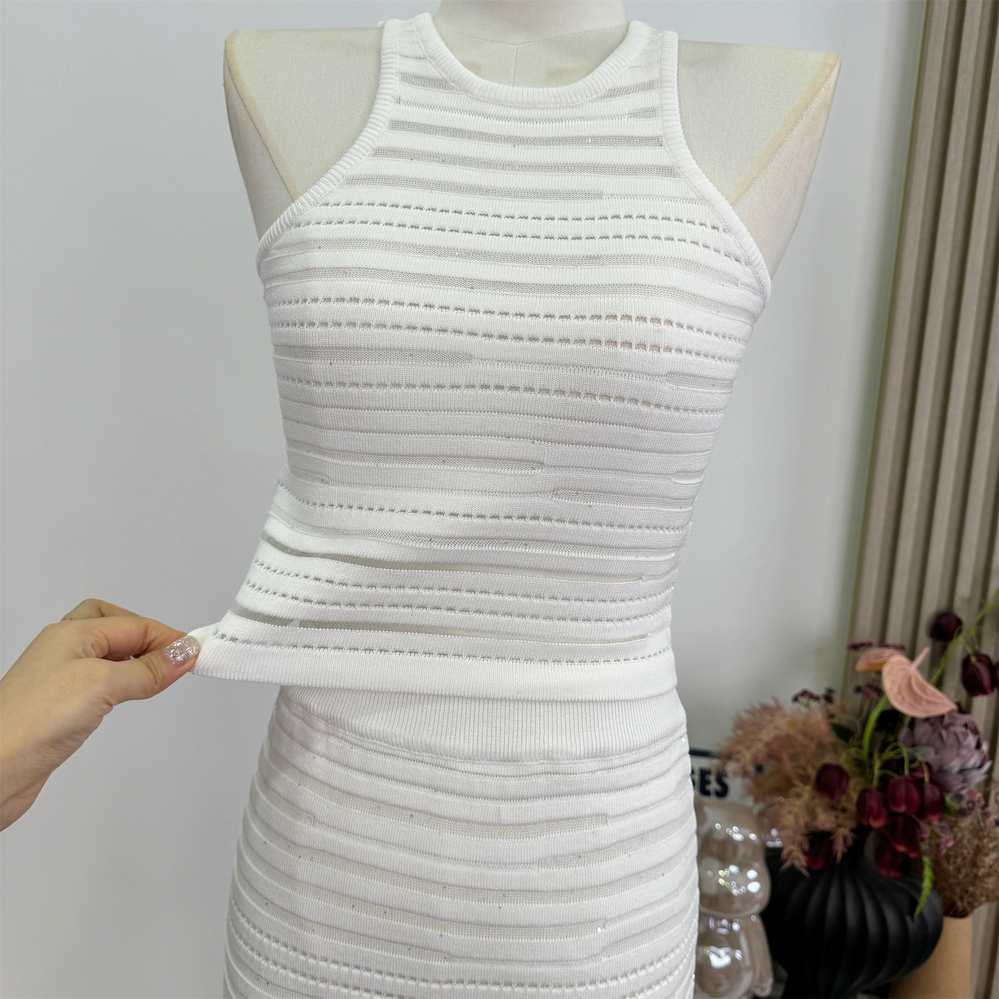kikimy 암퇘지 훈련 순간 높음 폭탄 맞춤 니트 가로 줄무늬 홀로우 아웃 망사 패치워크 조끼 반 스커트 세트