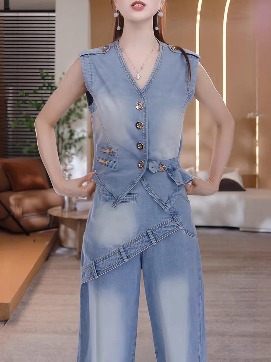 2026 년 여름 인터넷 유명인 폭발 패션 바람 캐주얼 트렌드 V넥 데님 베스트 디자인 센스 바지 세트 여성