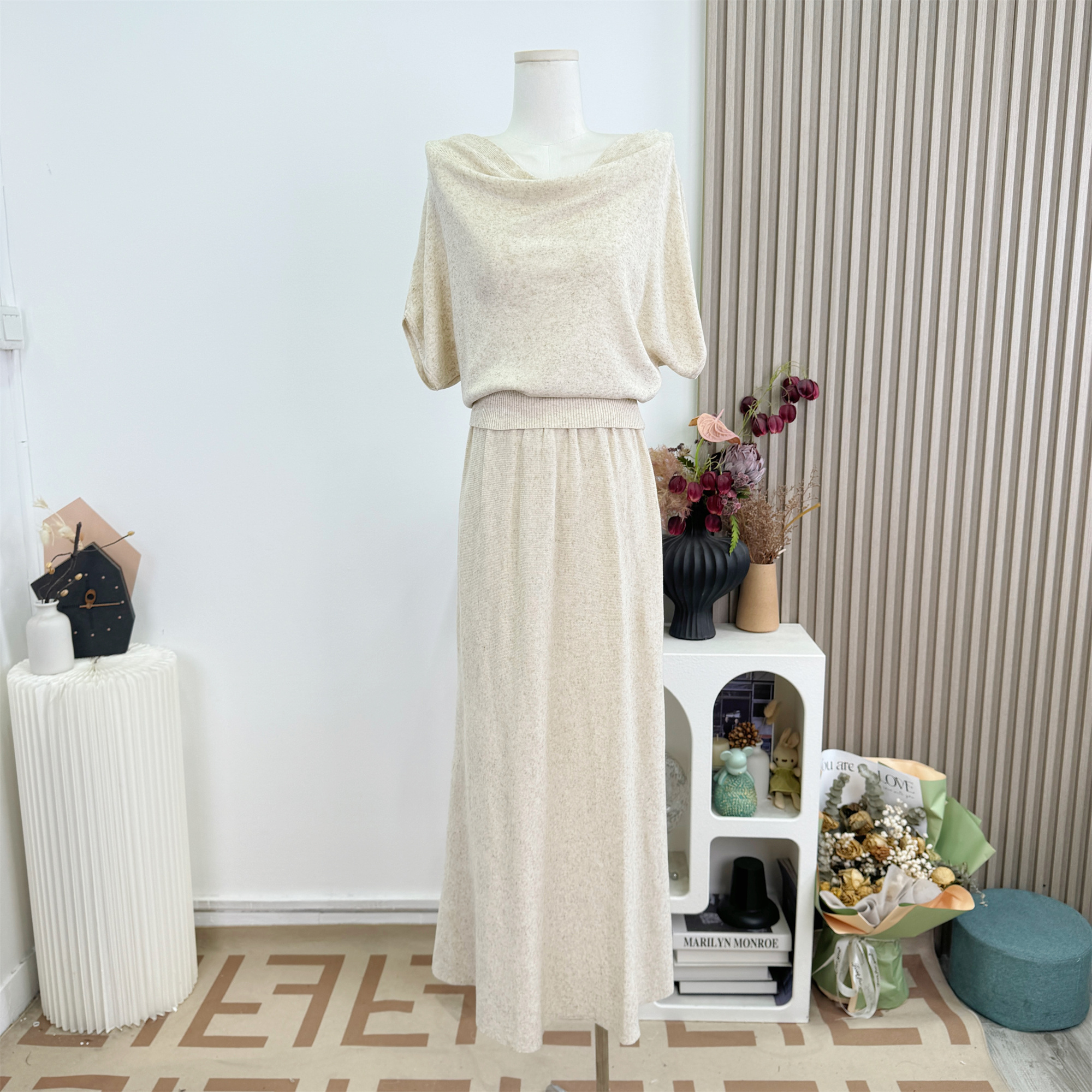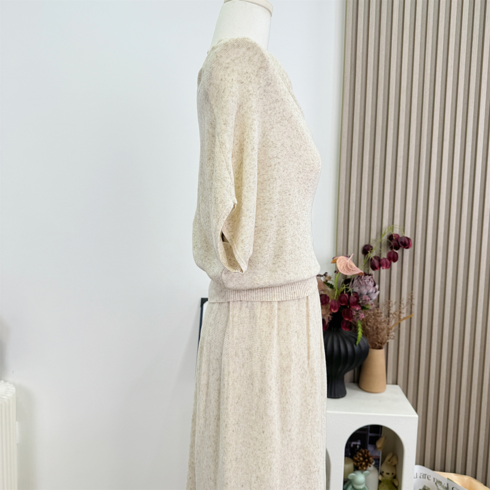 여름 코디 전체 집합 빅 사이즈 지방 mm 중간 소매 니트 스웨터 맨위 망사 반신 스커트 느긋한 레트로 세트 여성