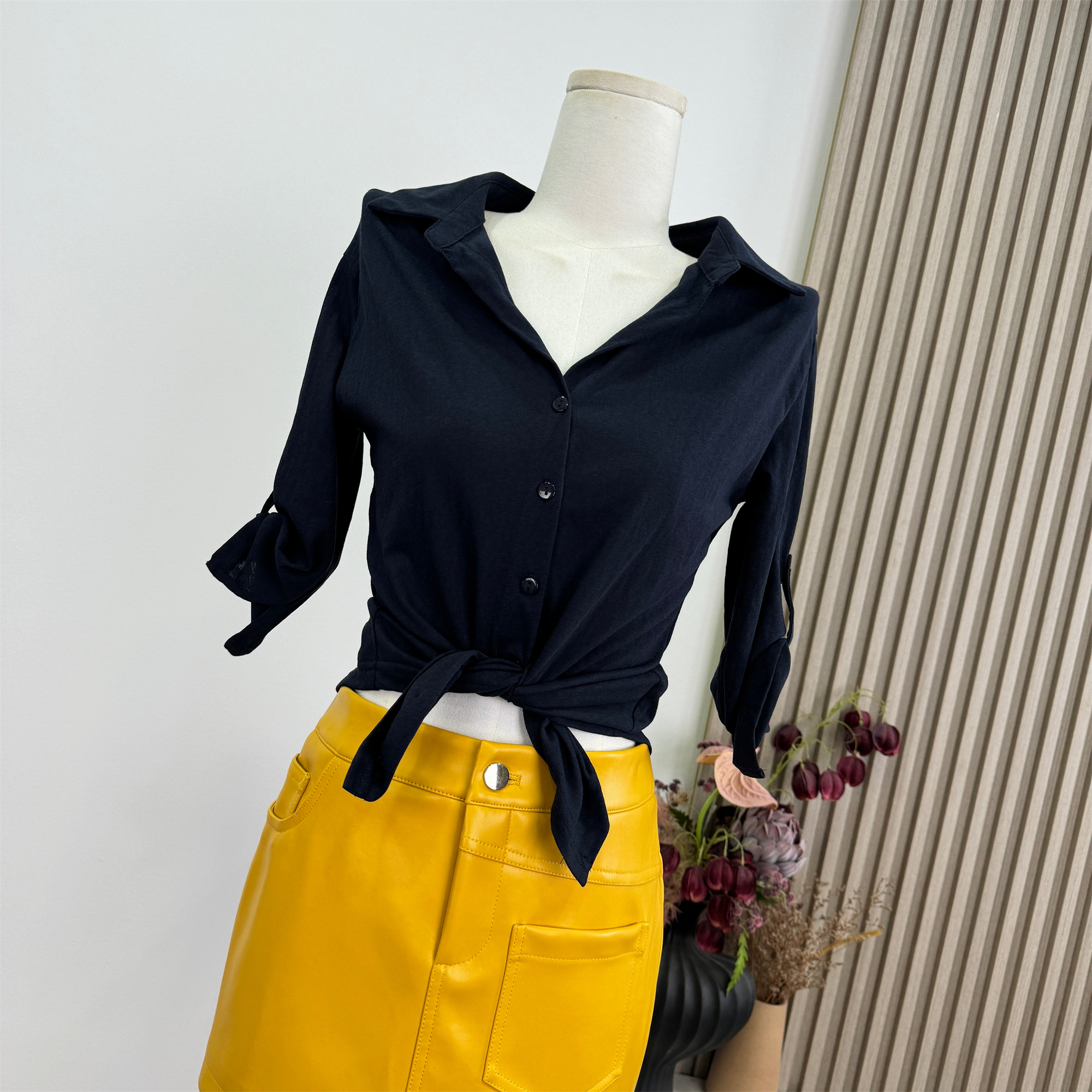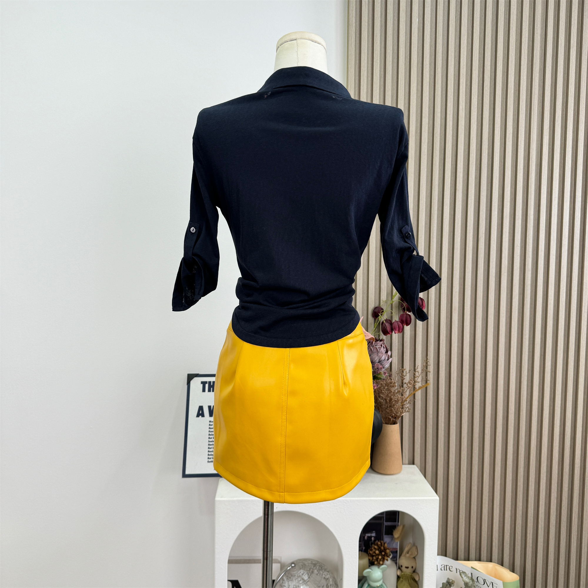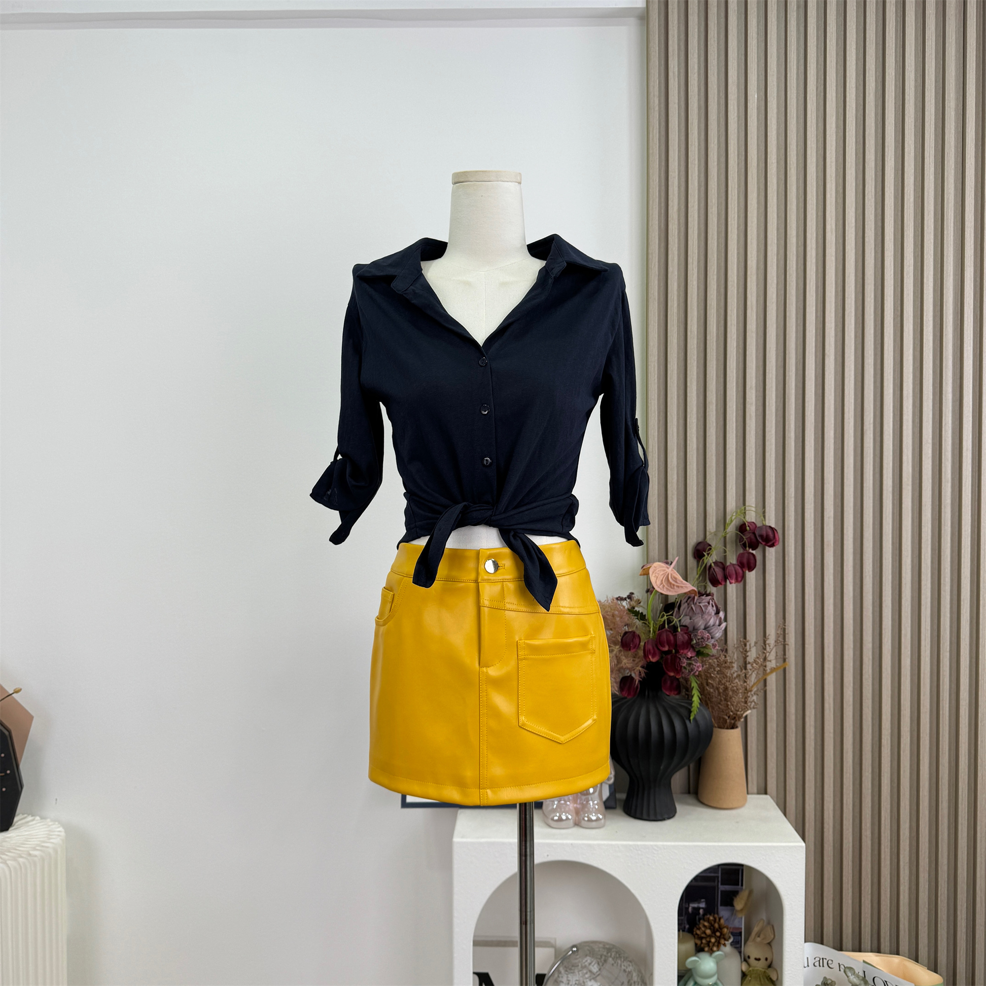 sx 좋은 안녕하세요. 물 핑크색 스탠드 칼라 니트 조끼 맨위 티셔츠 헤일로 염색 가죽 스커트 타이트 스커트 미니 스커트 반신 치마 세트 여성